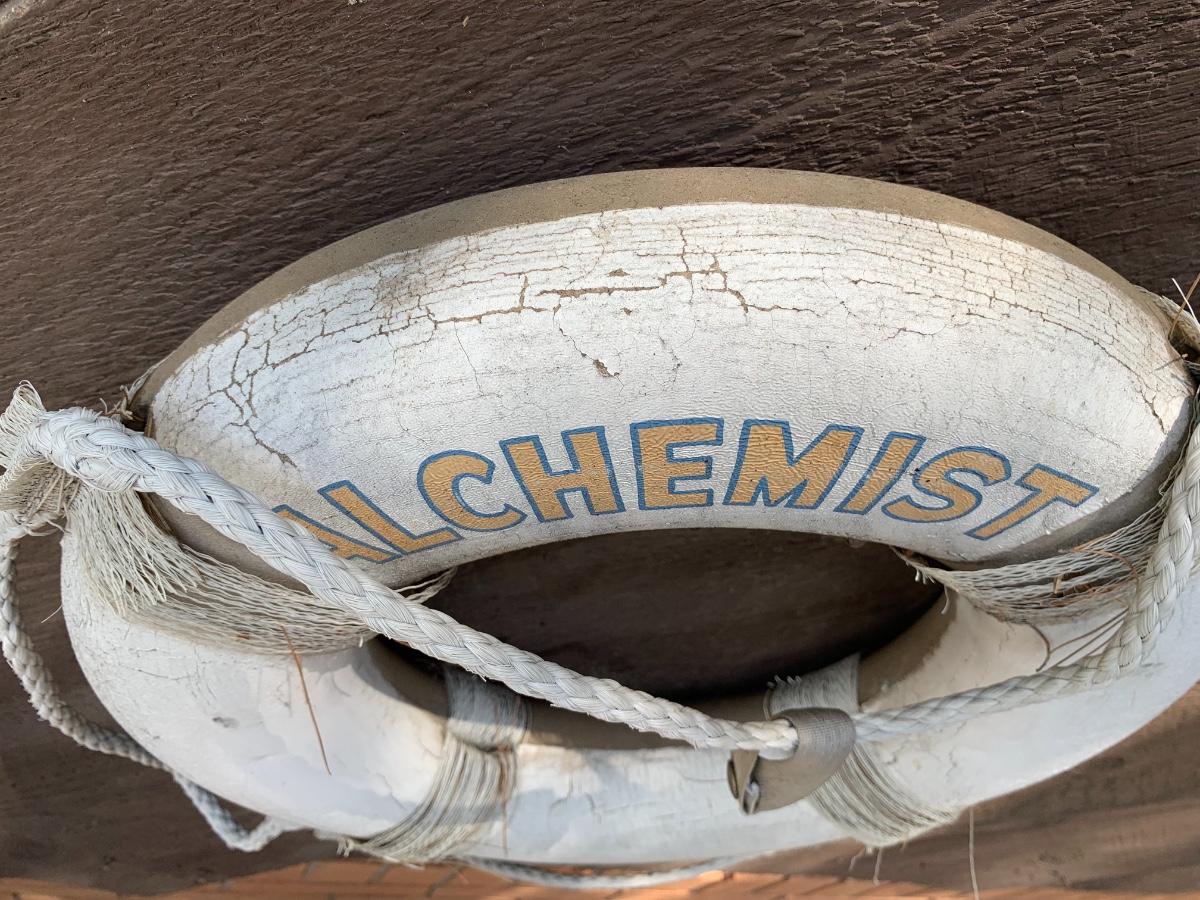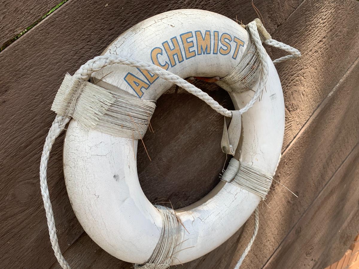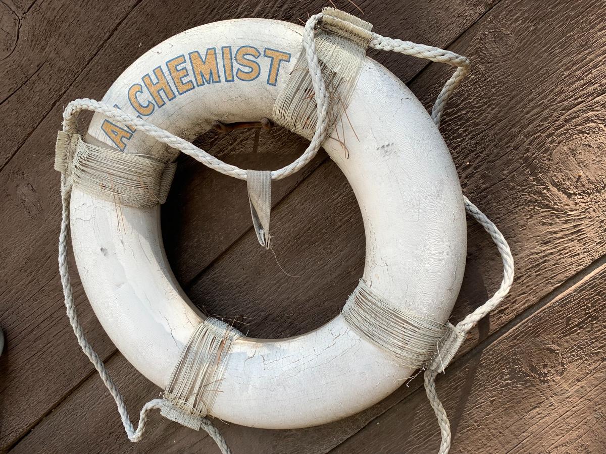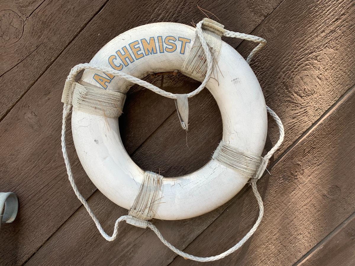 Alchemist Ring Buoy in fair condition, some cracks and fading due to outdoor life and sun damage.