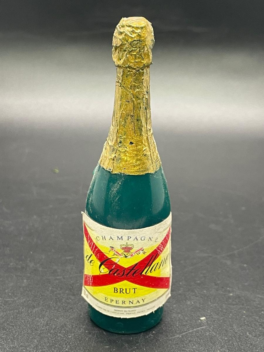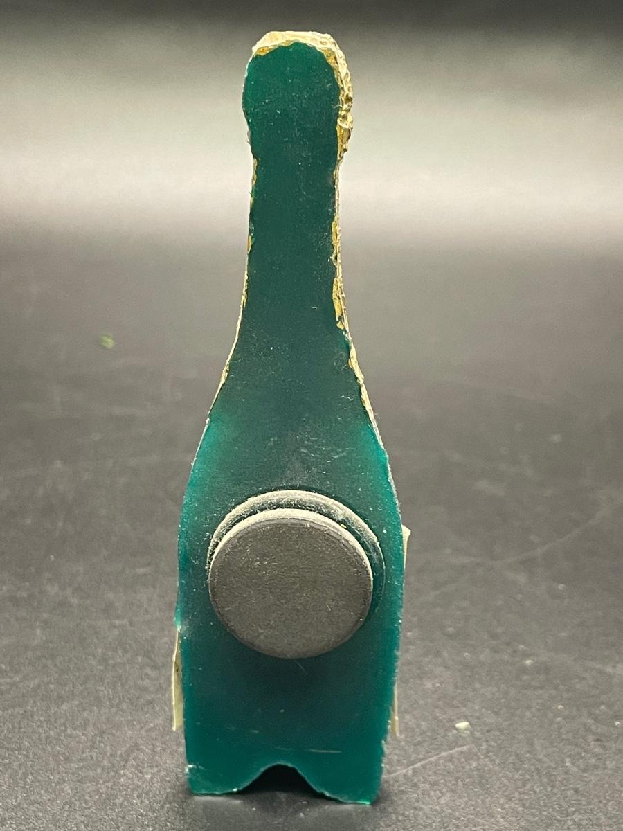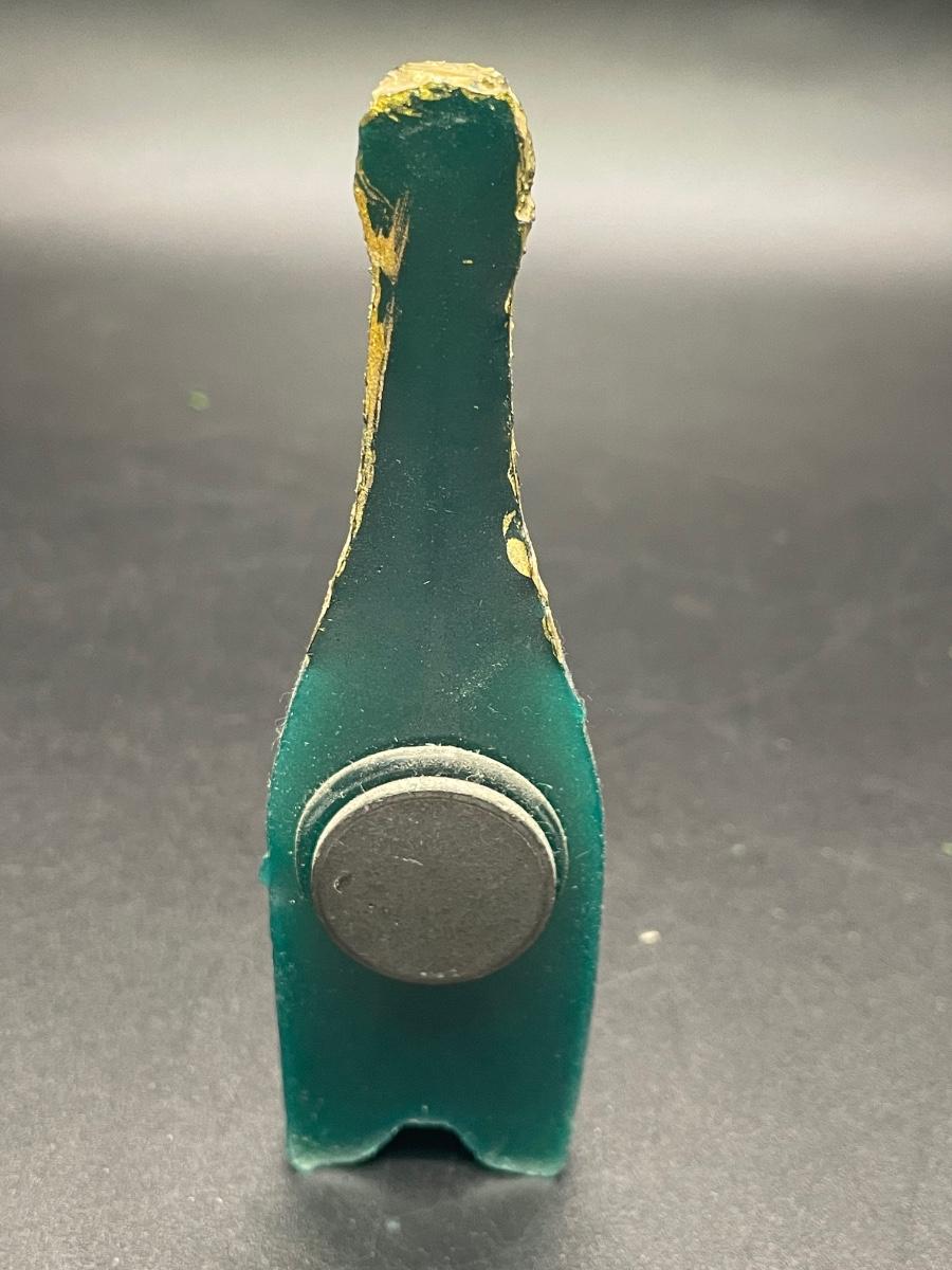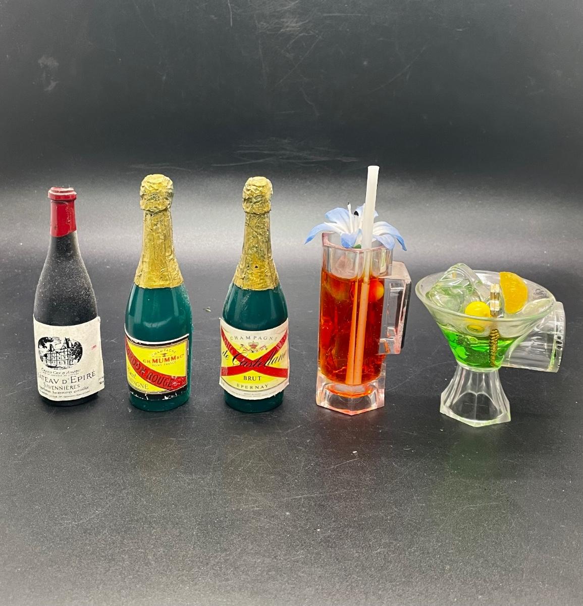 All five magnets are in good condition. This set of alcoholic beverages comes with three champagne bottle magnets and two cups with beverages inside magnets. The black champagne bottle magnet has some discoloration on the front.
