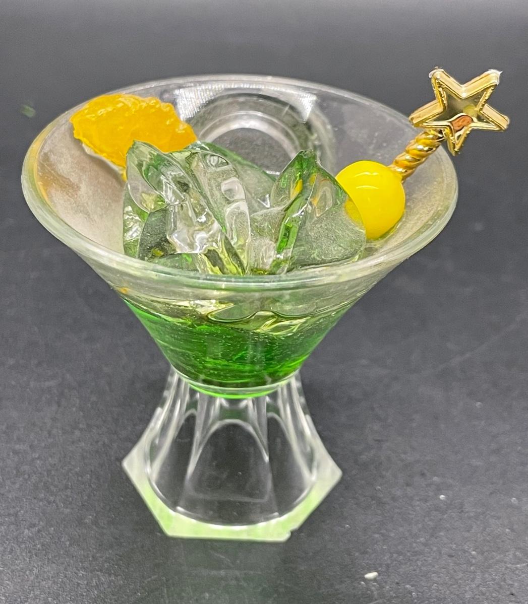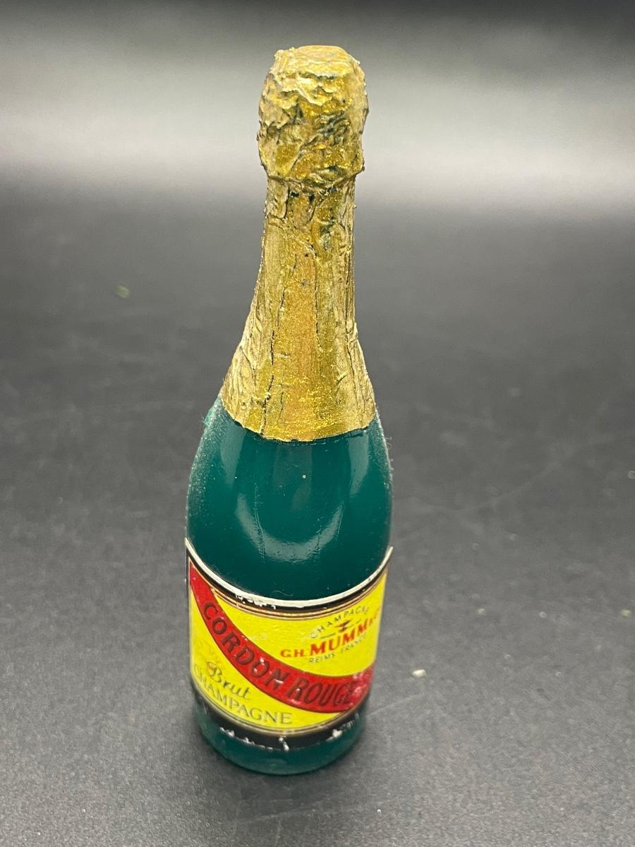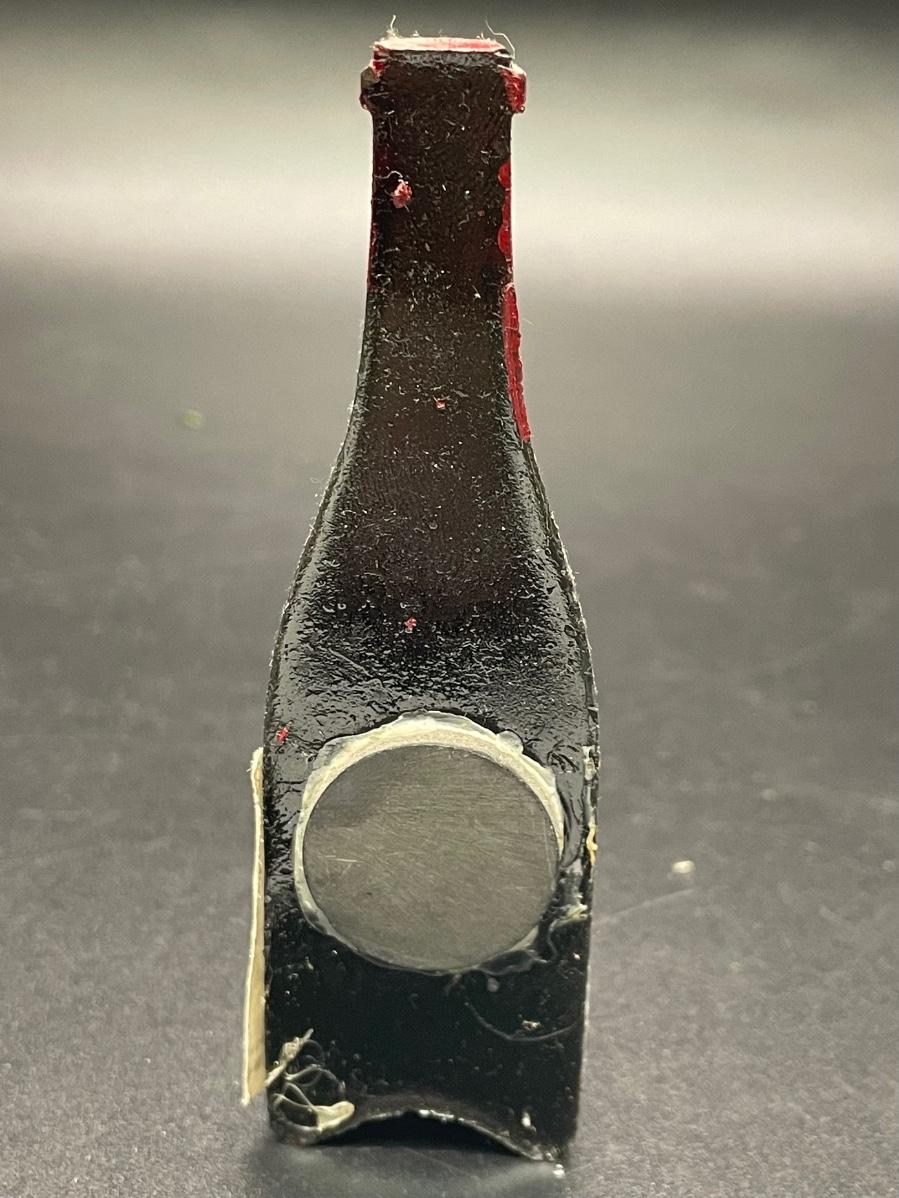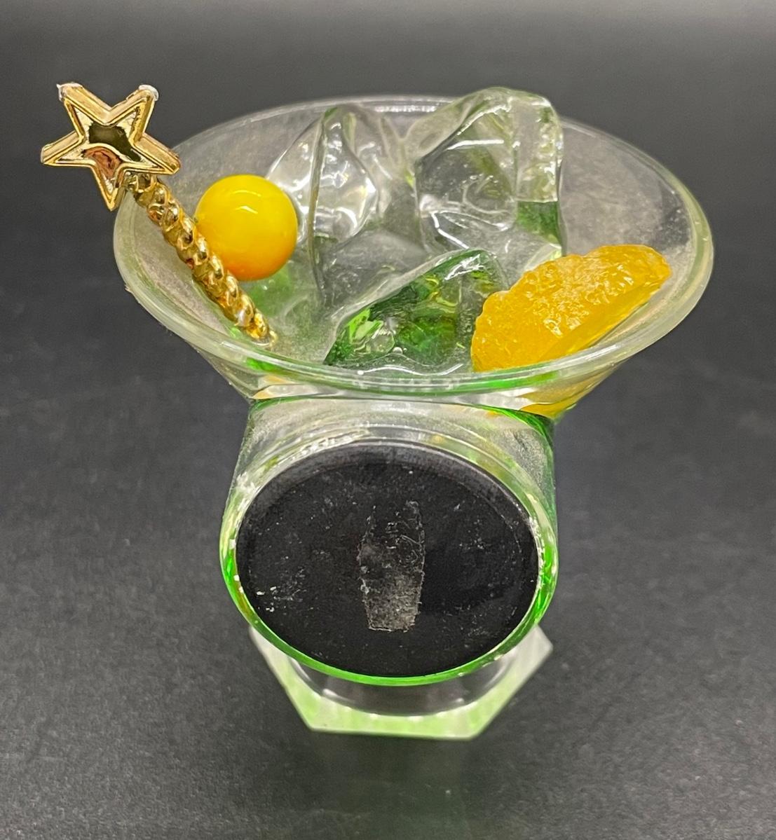 All five magnets are in good condition. This set of alcoholic beverages comes with three champagne bottle magnets and two cups with beverages inside magnets. The black champagne bottle magnet has some discoloration on the front.