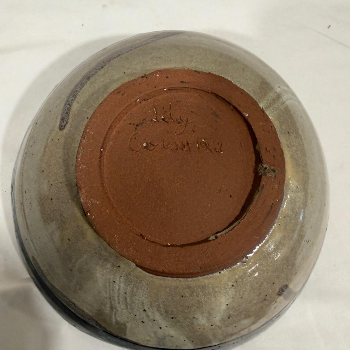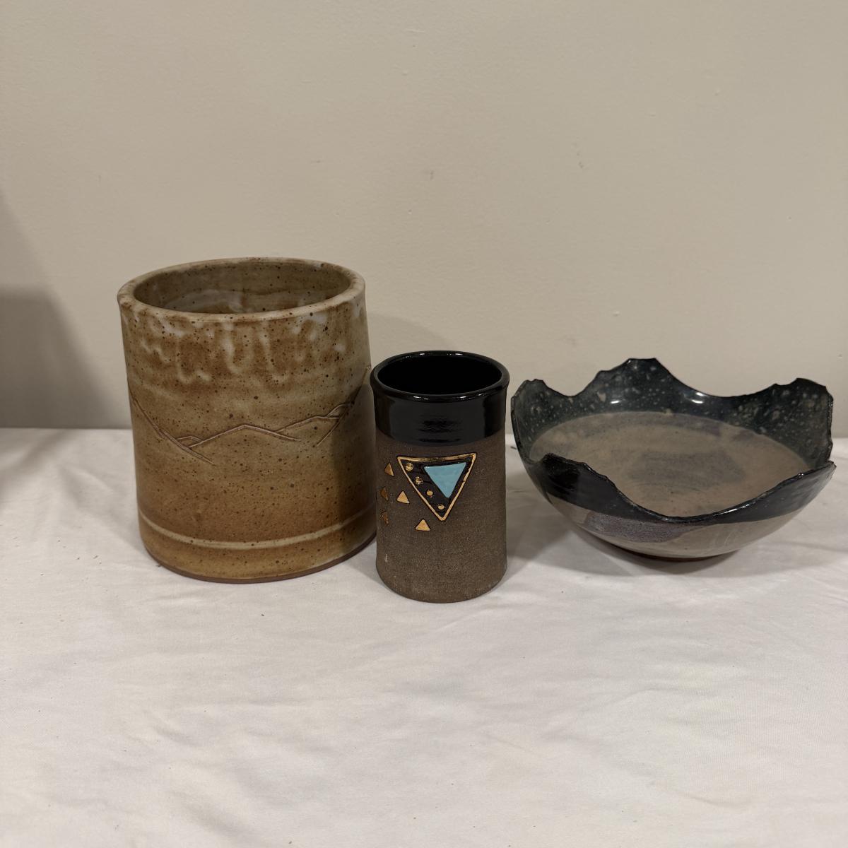 Lot includes a Alewine pottery vase, signed pottery cup and signed pottery bowl. Vase measures 6”D x 6.25”H.