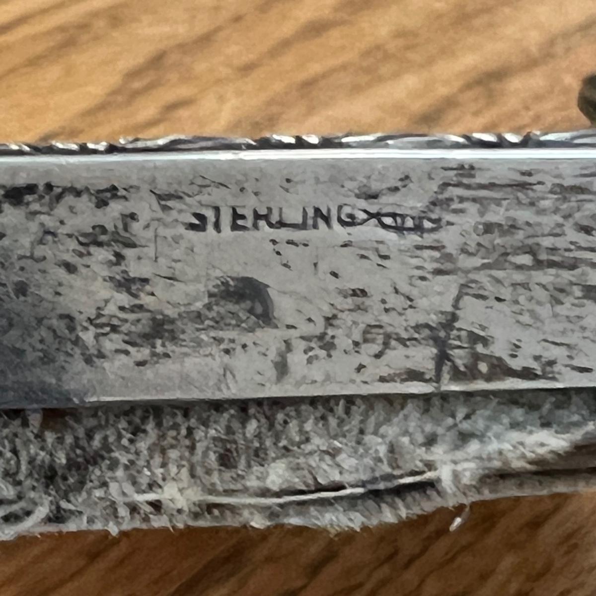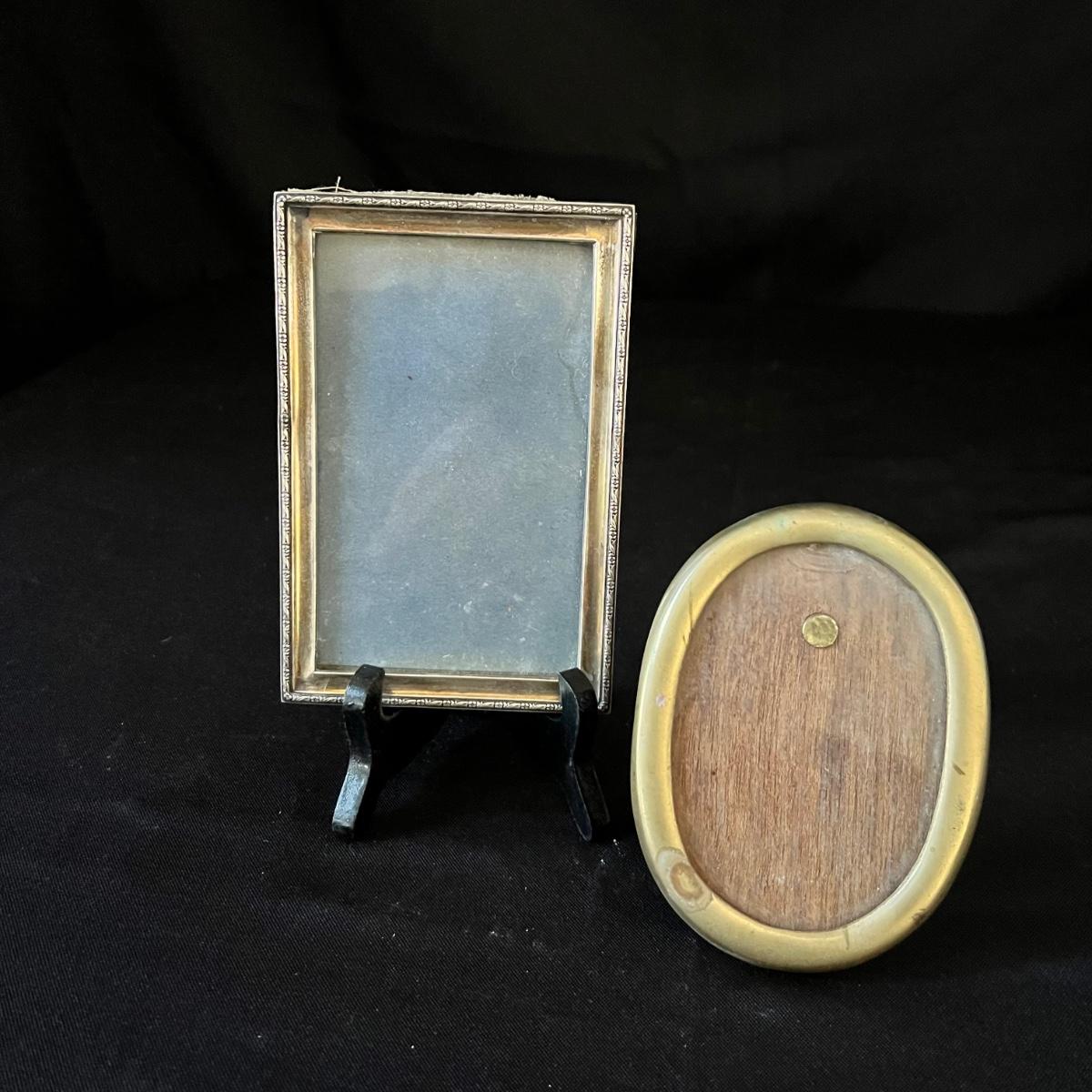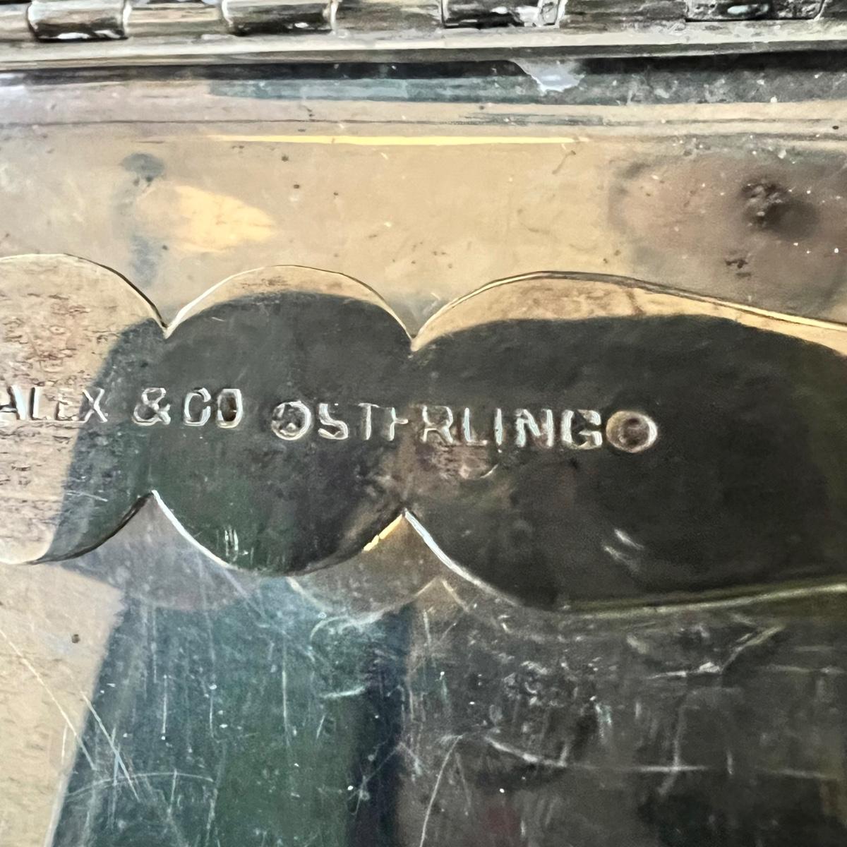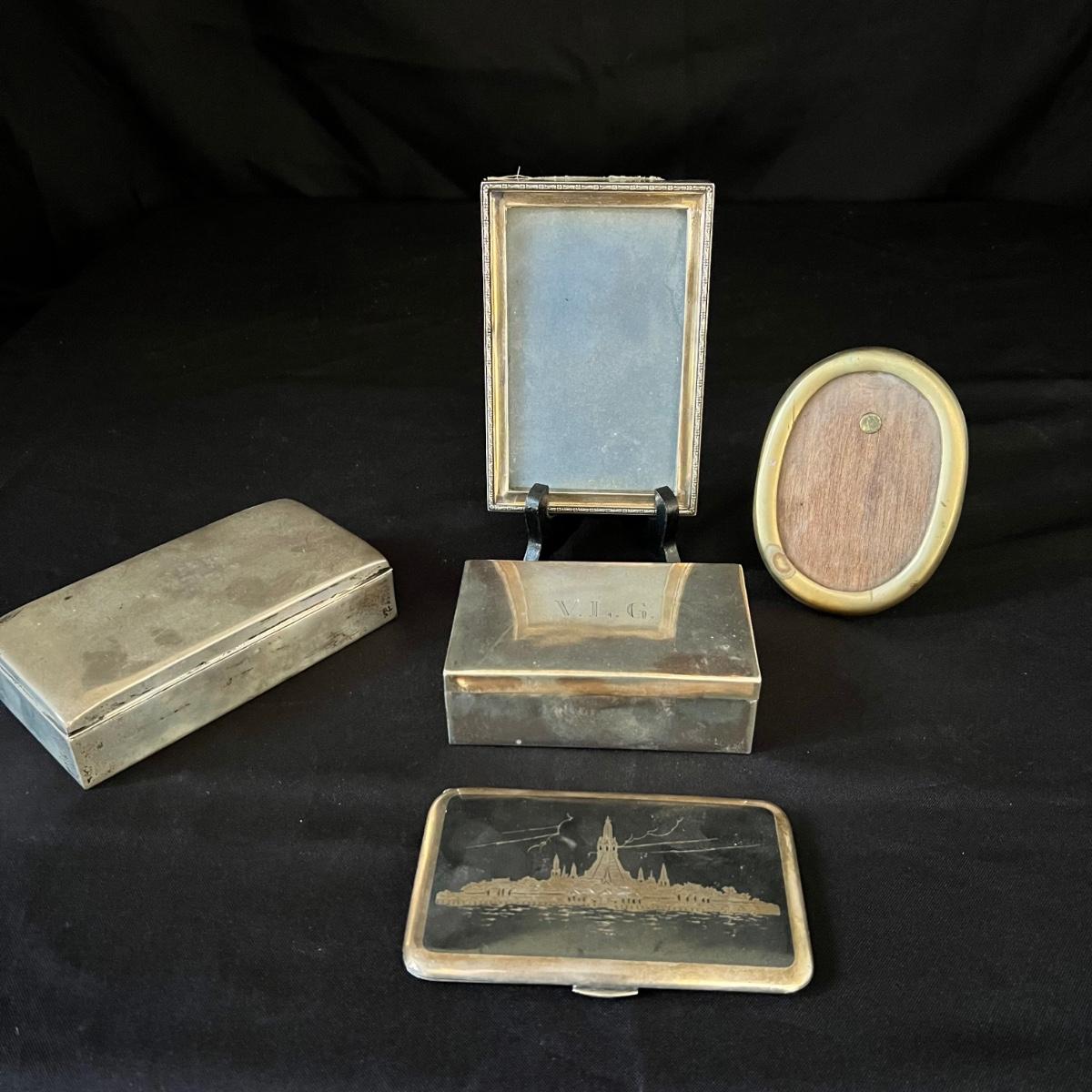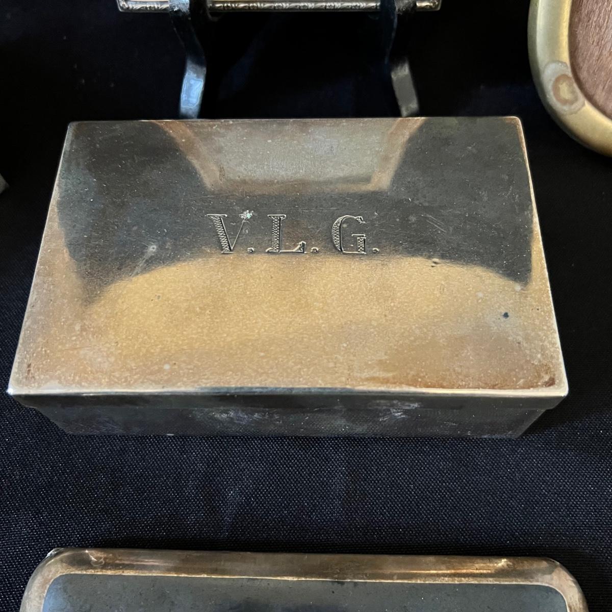 The two sterling silver boxes includes the Alex & Co cigarette case and the Kohler box with monogrammed V.L.G initials. The monogrammed box measures 5” x 4.5” x 1.5”H. The other box appears to be silverplate, no marking found. Two vintage small picture frames includes an oval brass frame and a sterling silver frame. The sterling frame measures 4” x 6”H.