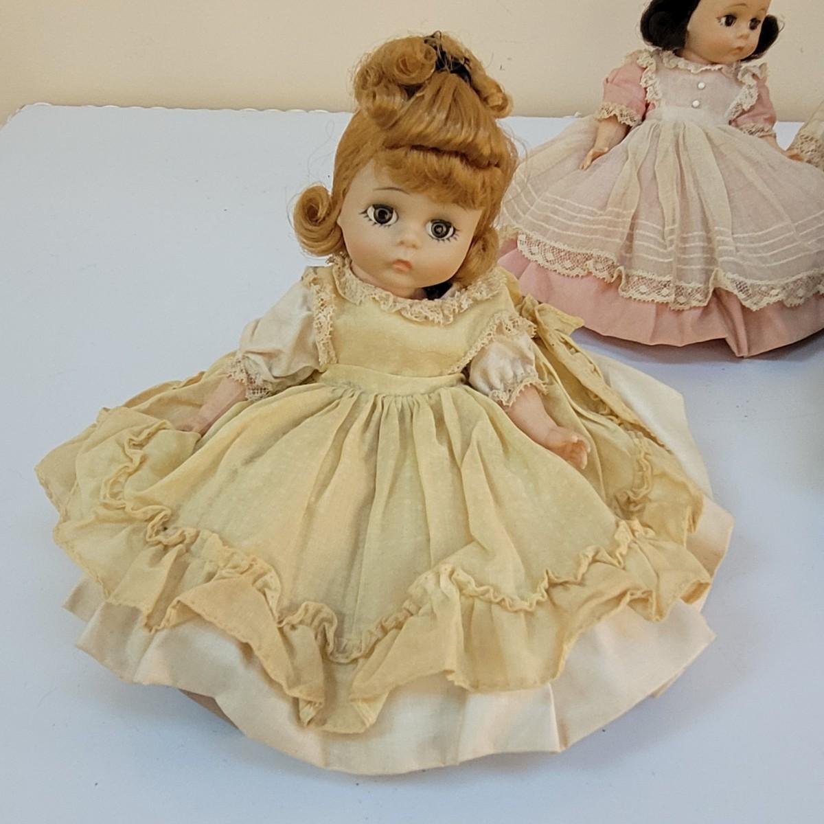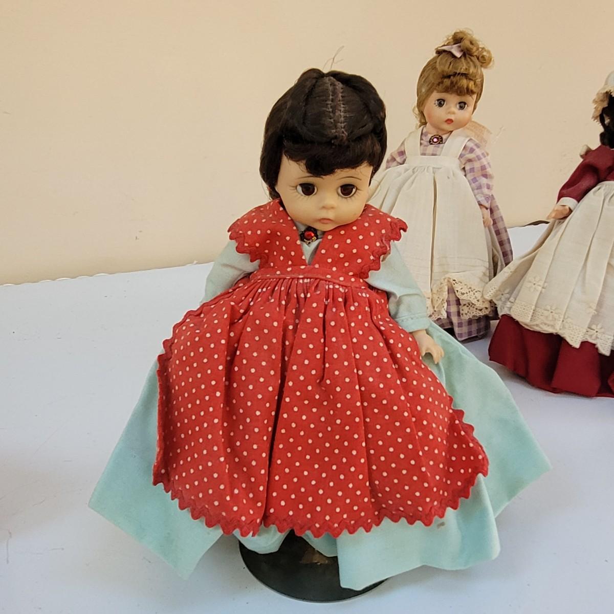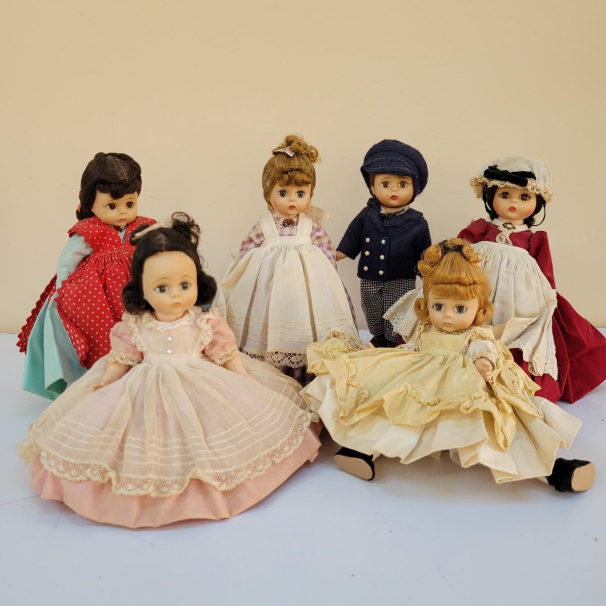 A collection of six vintage Alexander-kins “Little Women” dolls by Madame Alexander, including Jo, Amy, Laurie Little-Men, Beth, Marme and Meg. Eyes open and shut. Measure approximately 8"H. Shipping available.