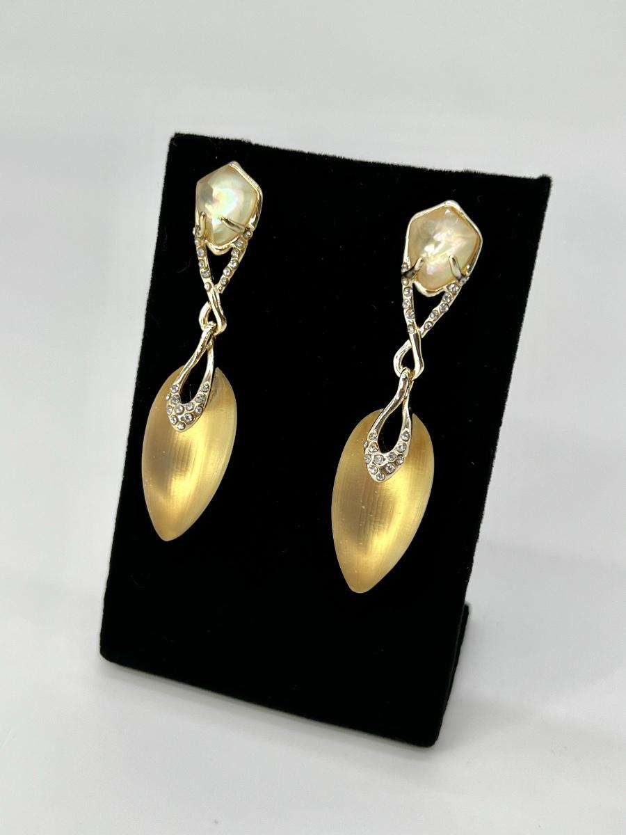 Fashion ~ Golden accent CZ lucite hinge bracelet with light pale pink stone = 2.5” x 2” inner diameter. Post CZ golden link drop earrings = 2.25”. *Earrings do not have backs.
