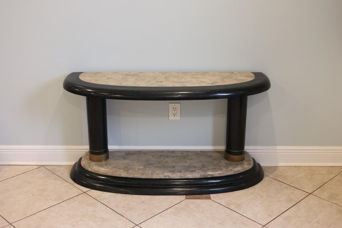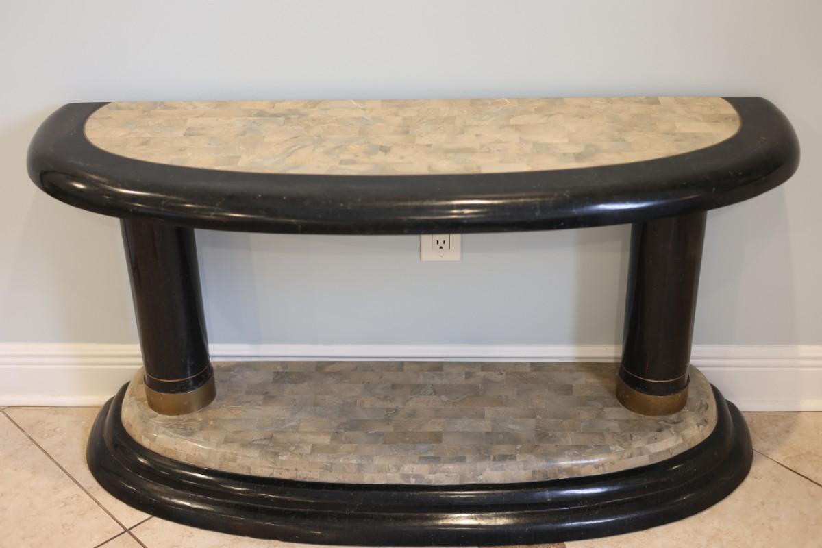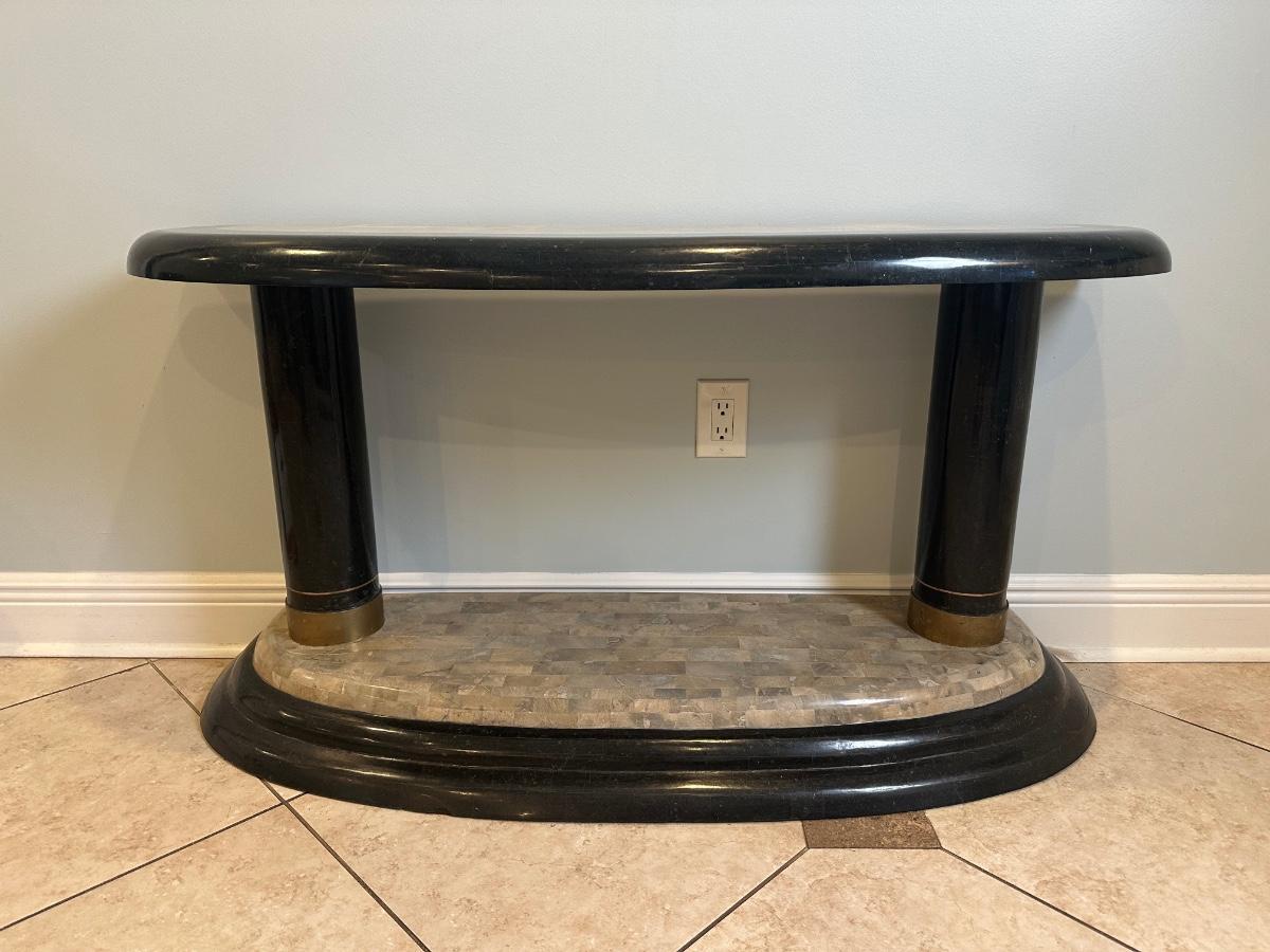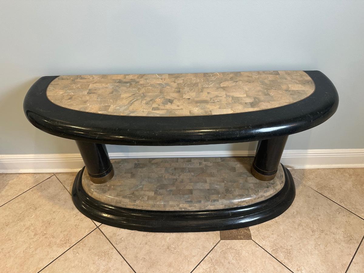Alexvale console table featuring a black lacquered frame with decorative faux stone mosaic inlay top and matching lower shelf. Supported by double pedestal columns with brass-tone accent bands. Shows light surface wear and a few small chips along the lower edge, consistent with normal use and age. See photos for details. Decorative statement piece for entryway, living room, or behind a sofa.