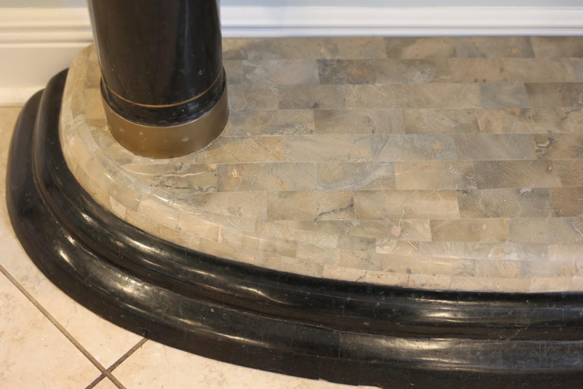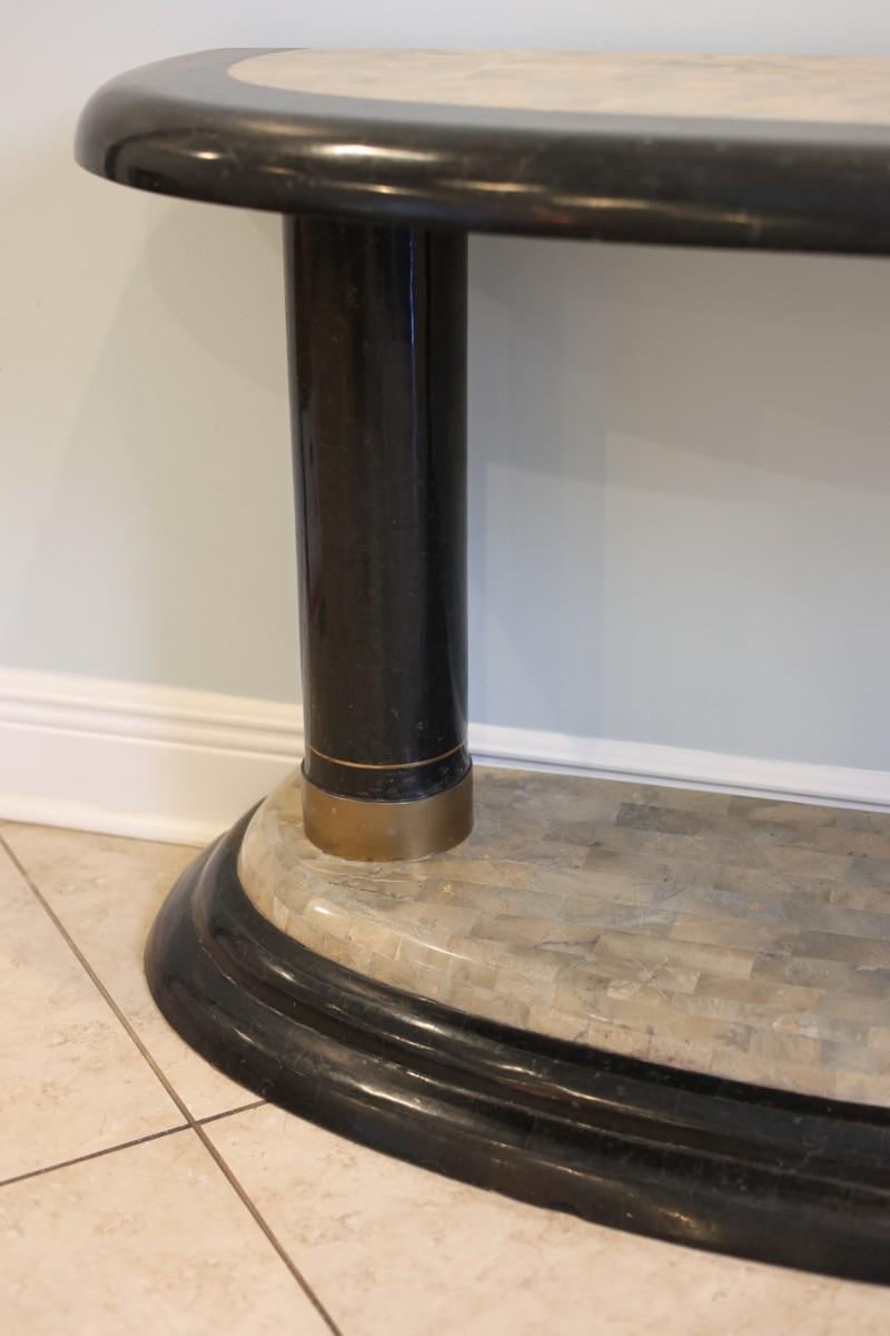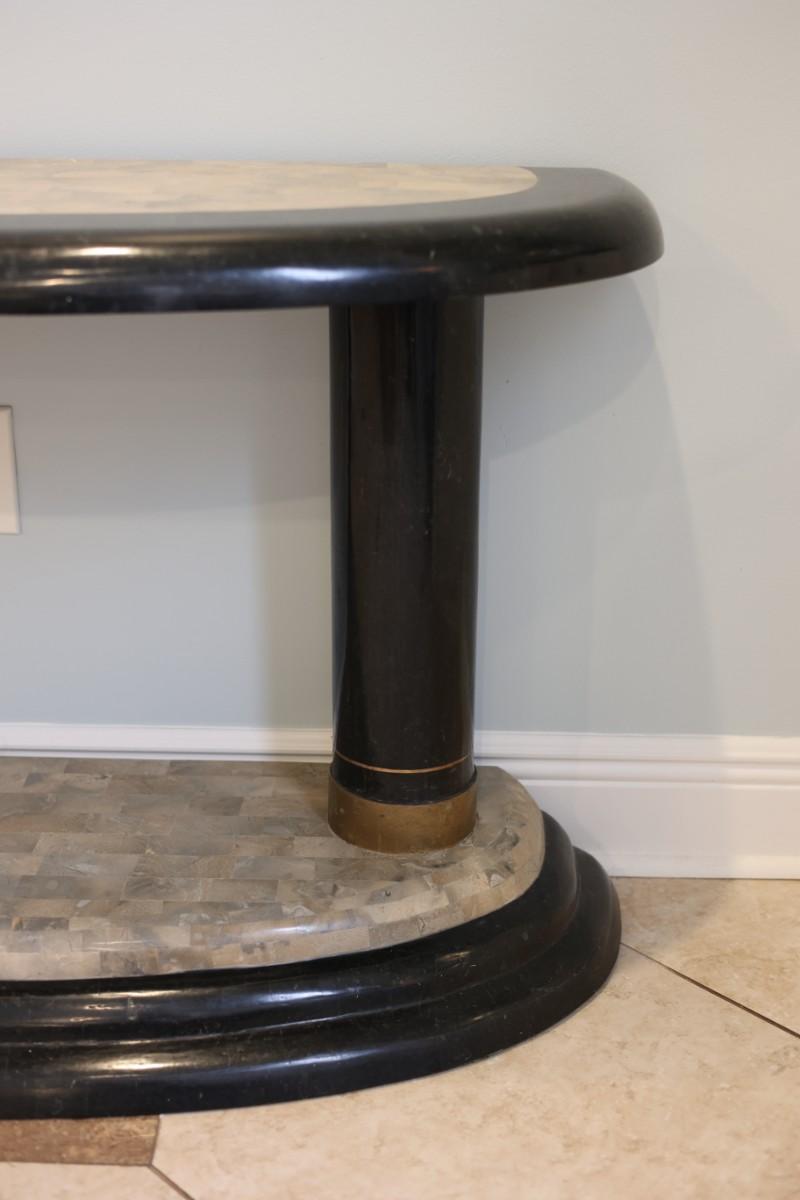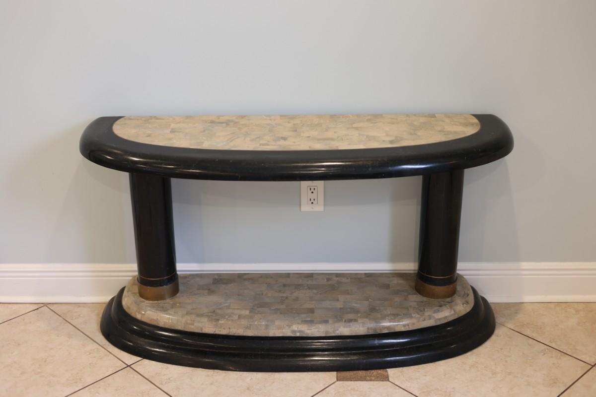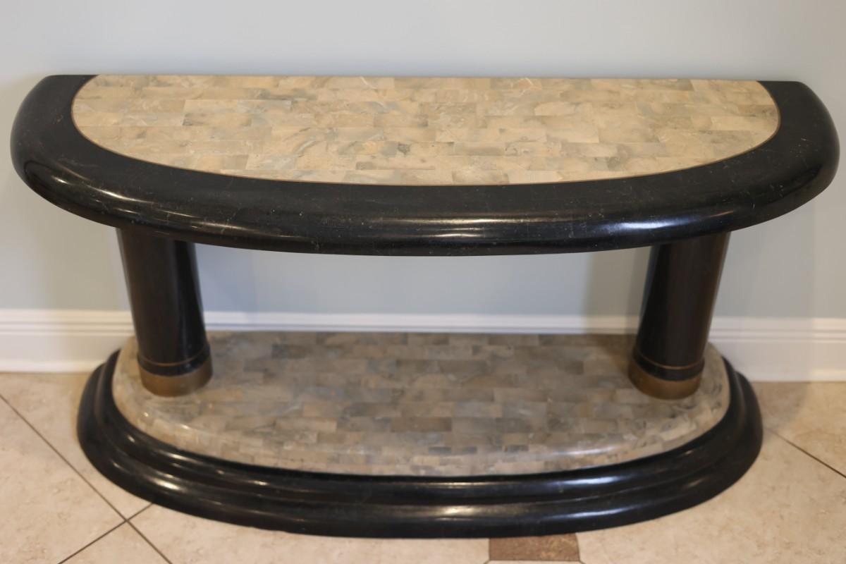 Alexvale console table featuring a black lacquered frame with decorative faux stone mosaic inlay top and matching lower shelf. Supported by double pedestal columns with brass-tone accent bands. Shows light surface wear and a few small chips along the lower edge, consistent with normal use and age. See photos for details. Decorative statement piece for entryway, living room, or behind a sofa.