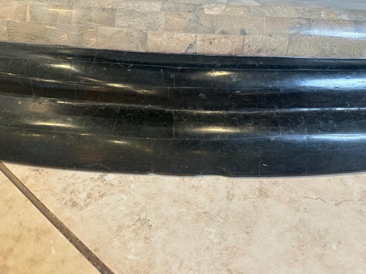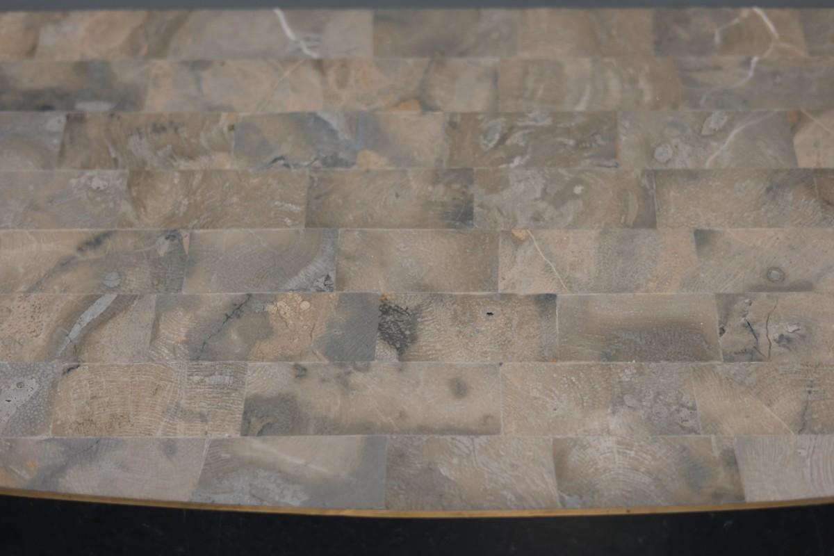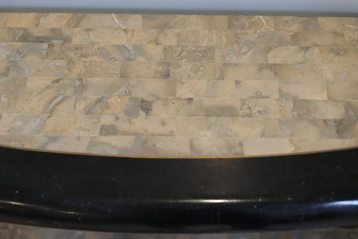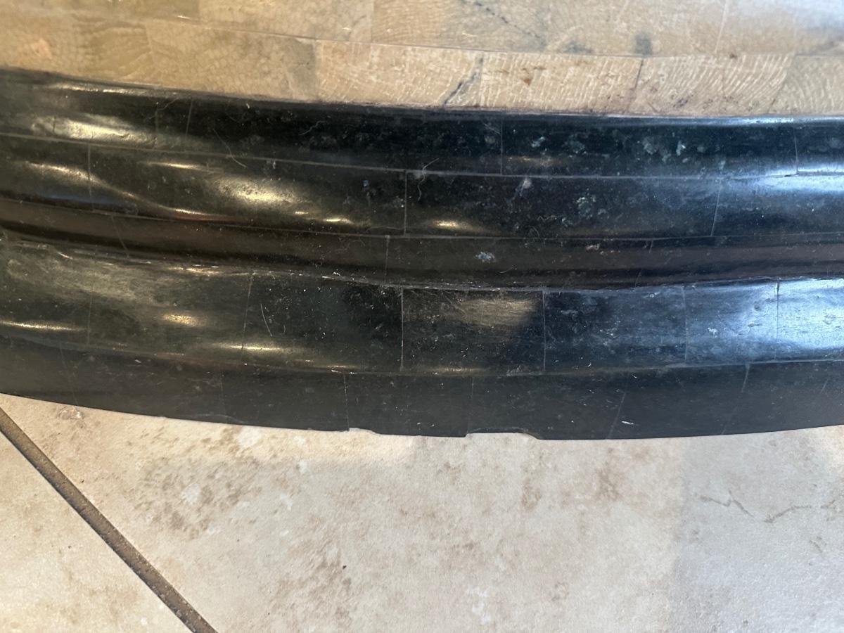Alexvale console table featuring a black lacquered frame with decorative faux stone mosaic inlay top and matching lower shelf. Supported by double pedestal columns with brass-tone accent bands. Shows light surface wear and a few small chips along the lower edge, consistent with normal use and age. See photos for details. Decorative statement piece for entryway, living room, or behind a sofa.