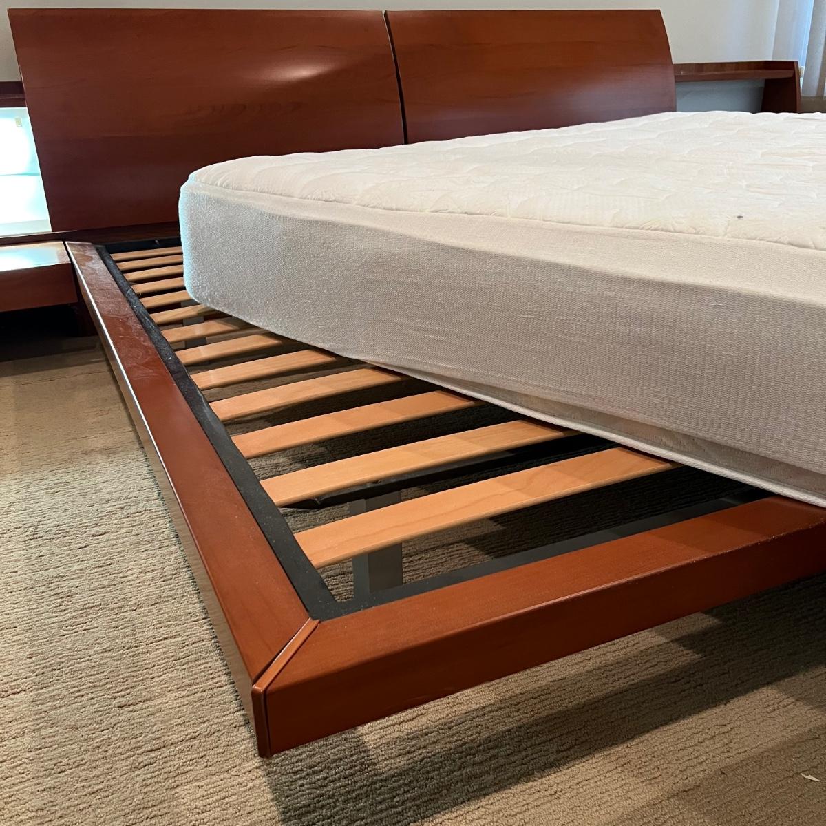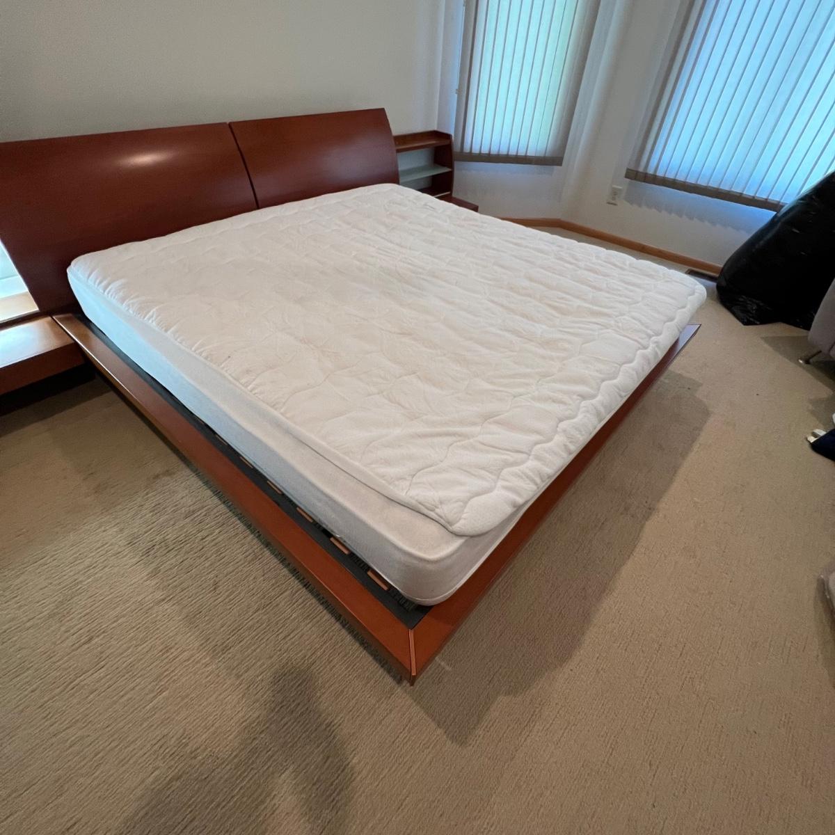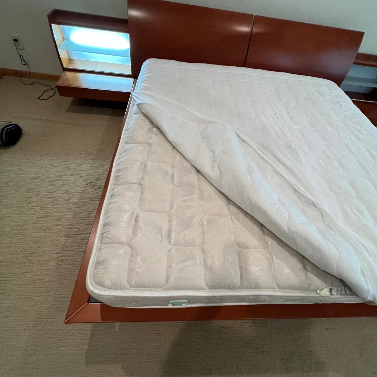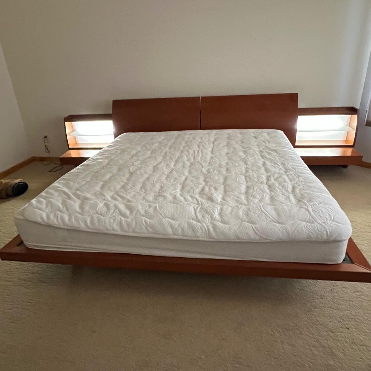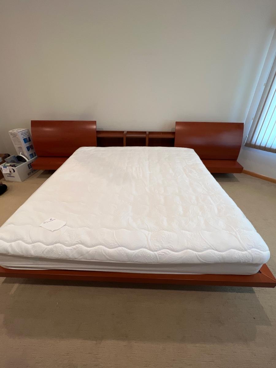 This stunning MCM style bed’s label states it’s a cherry Fushido bed and the mfg. label appears to have the Alfa Italia logo. This unique platform bed has a built in headboard and side sections that include a lower drawer below a glass shelf; both of these sections have lights. Each half of the headboard slides outwards to reveal that the shelves continue all the way to the center. Note there are a few light marks in the wood on top of the drawers. The mattress which has a protective cover on it is available to the winning bidder if they want it. It appears that the headboard can be split into two sections, the last photos show the bolts and screws that will dissemble it, please bring appropriate tools. Note the platform section could only be dissembled into two pieces if the wood surround is dismantled.