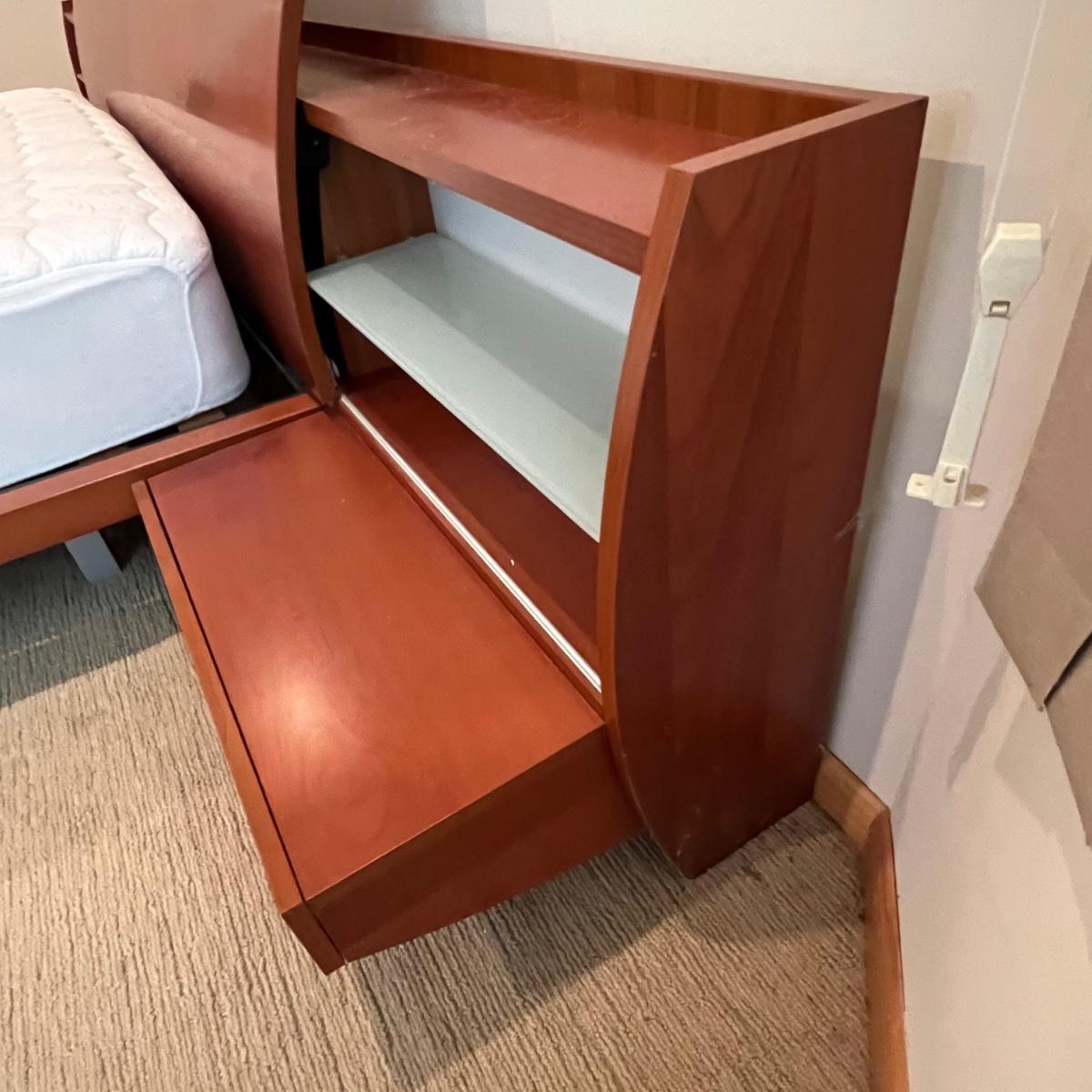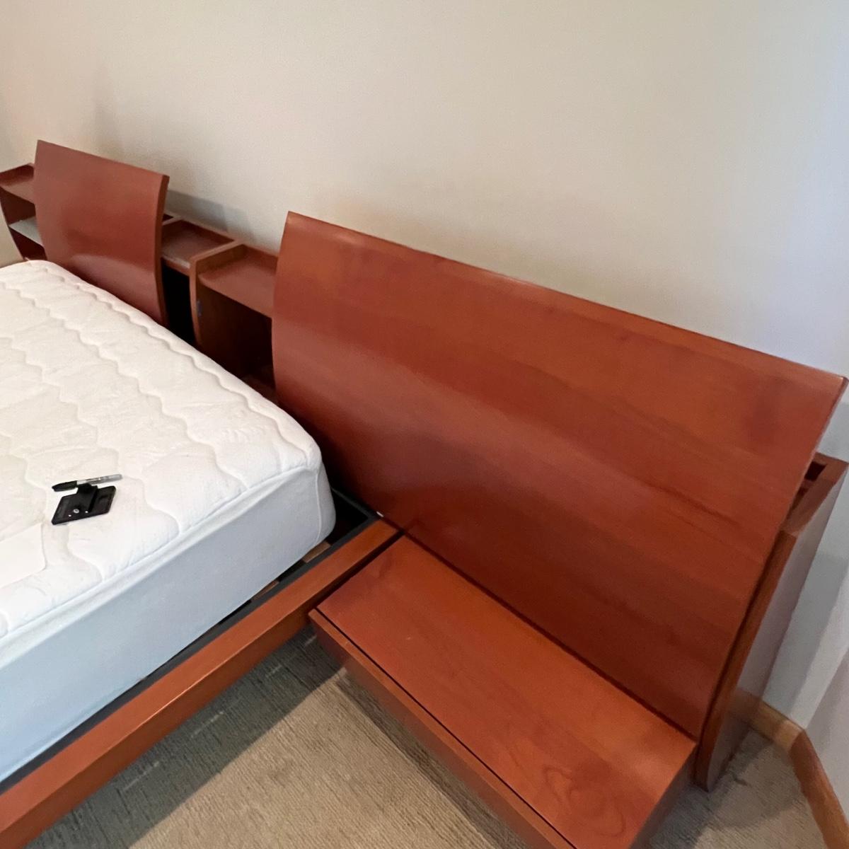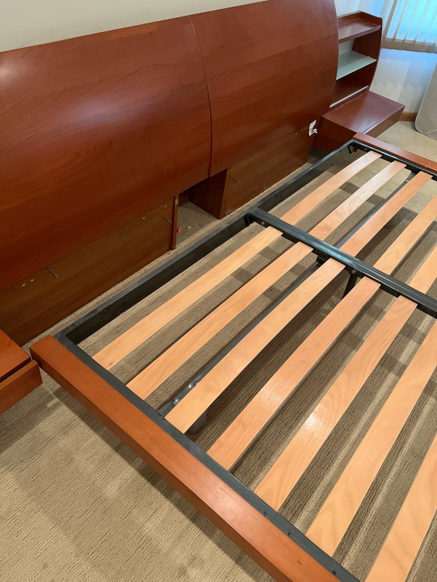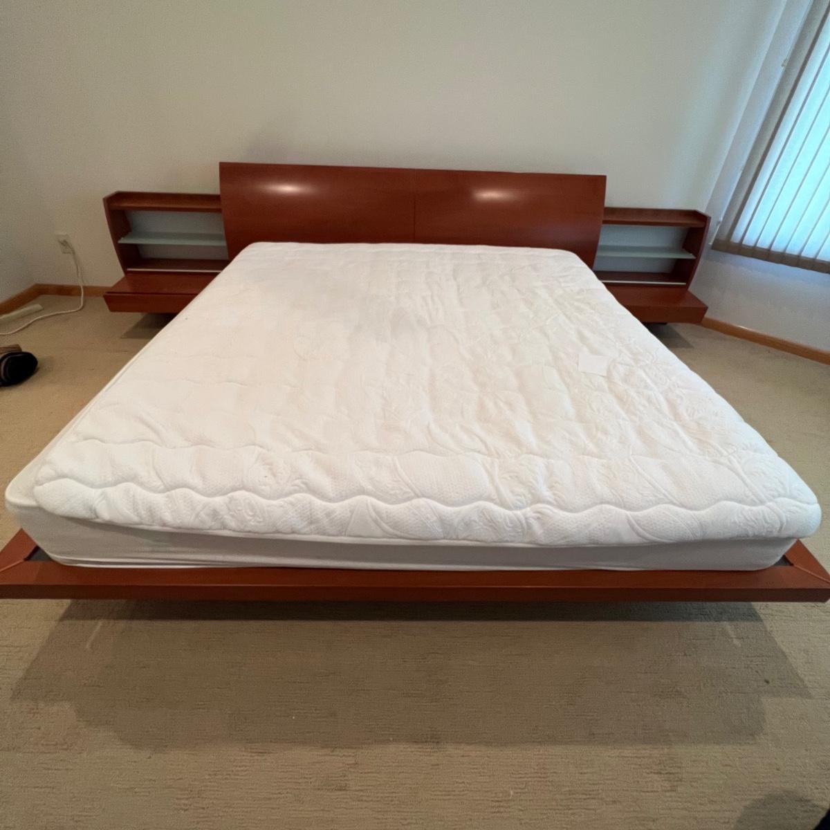 This stunning MCM style bed’s label states it’s a cherry Fushido bed and the mfg. label appears to have the Alfa Italia logo. This unique platform bed has a built in headboard and side sections that include a lower drawer below a glass shelf; both of these sections have lights. Each half of the headboard slides outwards to reveal that the shelves continue all the way to the center. Note there are a few light marks in the wood on top of the drawers. The mattress which has a protective cover on it is available to the winning bidder if they want it. It appears that the headboard can be split into two sections, the last photos show the bolts and screws that will dissemble it, please bring appropriate tools. Note the platform section could only be dissembled into two pieces if the wood surround is dismantled.
