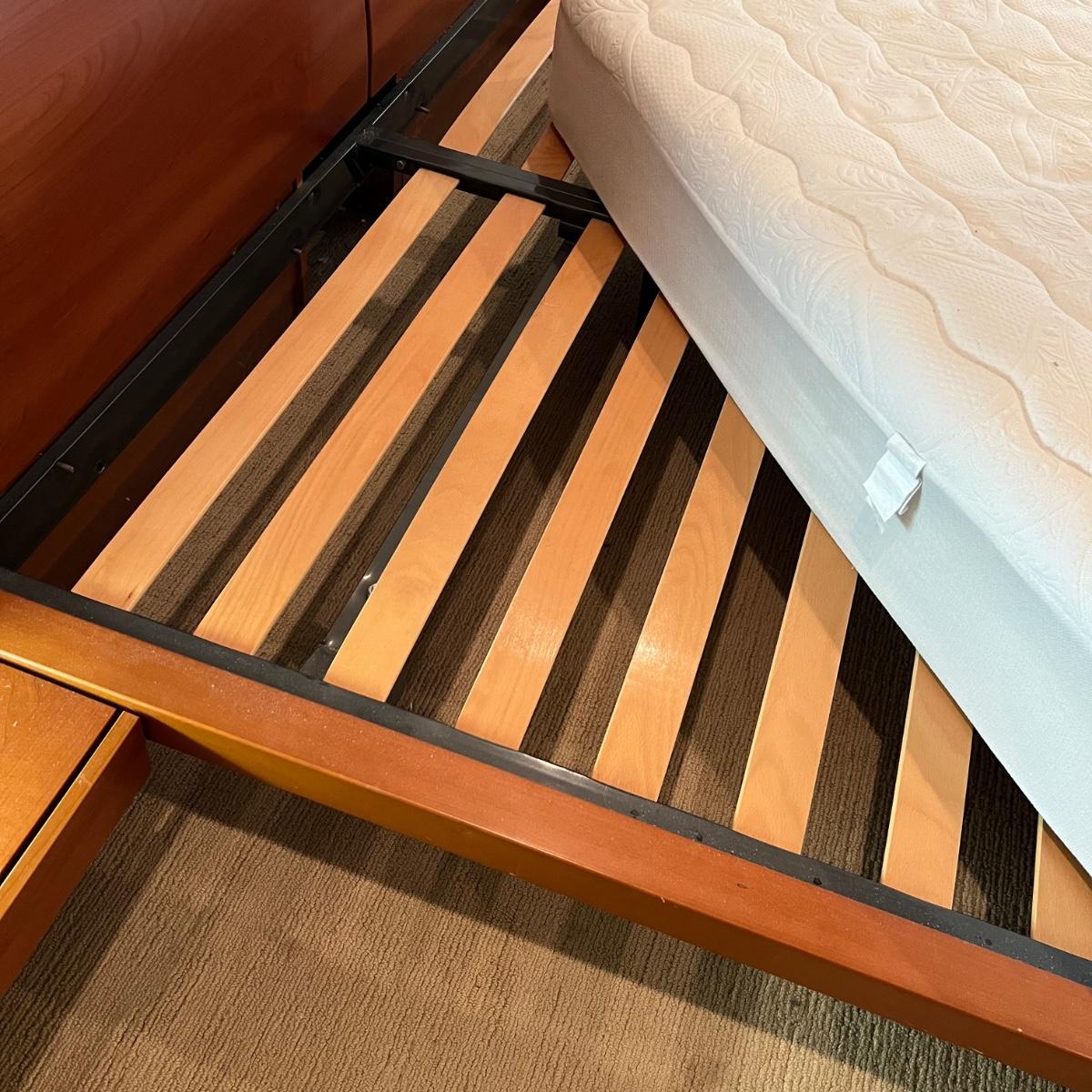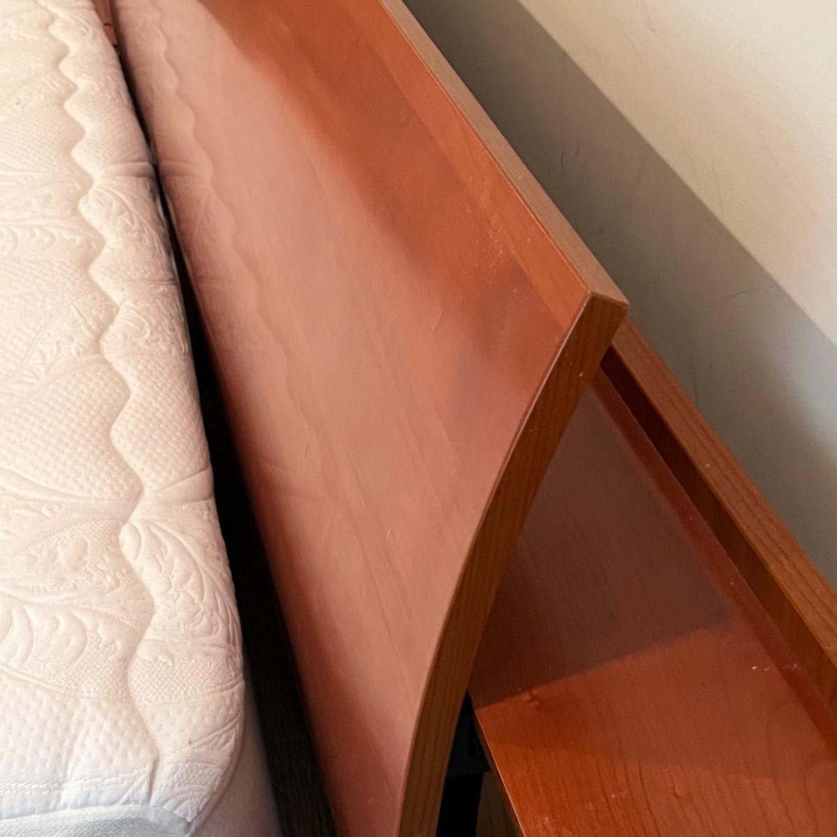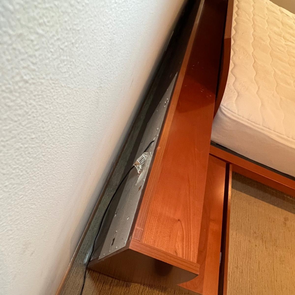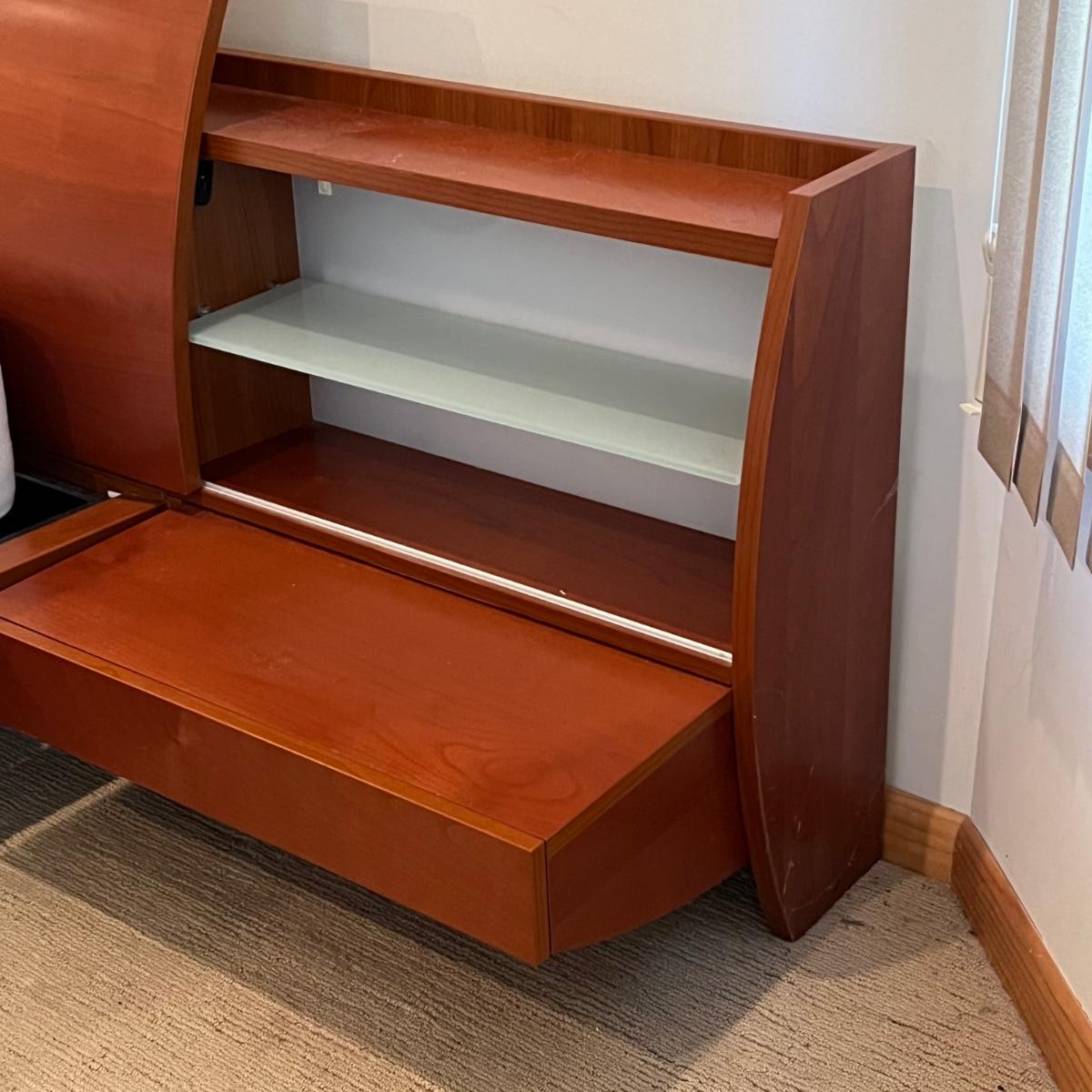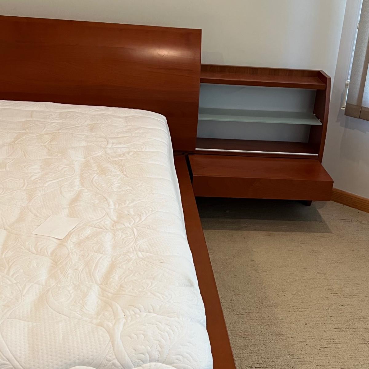 This stunning MCM style bed’s label states it’s a cherry Fushido bed and the mfg. label appears to have the Alfa Italia logo. This unique platform bed has a built in headboard and side sections that include a lower drawer below a glass shelf; both of these sections have lights. Each half of the headboard slides outwards to reveal that the shelves continue all the way to the center. Note there are a few light marks in the wood on top of the drawers. The mattress which has a protective cover on it is available to the winning bidder if they want it. It appears that the headboard can be split into two sections, the last photos show the bolts and screws that will dissemble it, please bring appropriate tools. Note the platform section could only be dissembled into two pieces if the wood surround is dismantled.