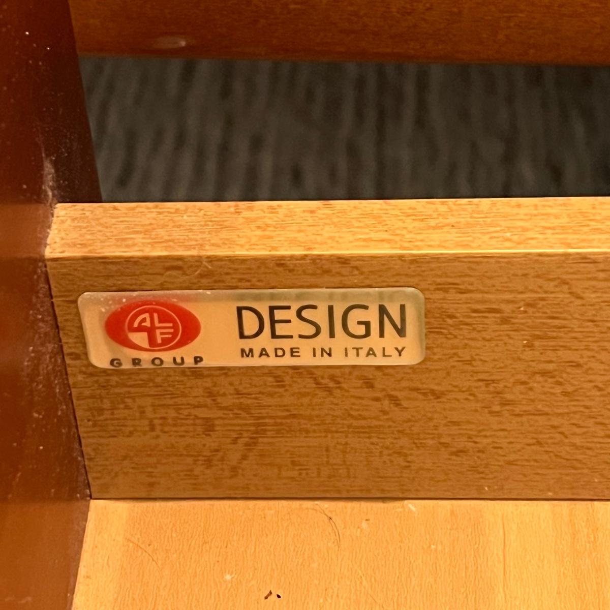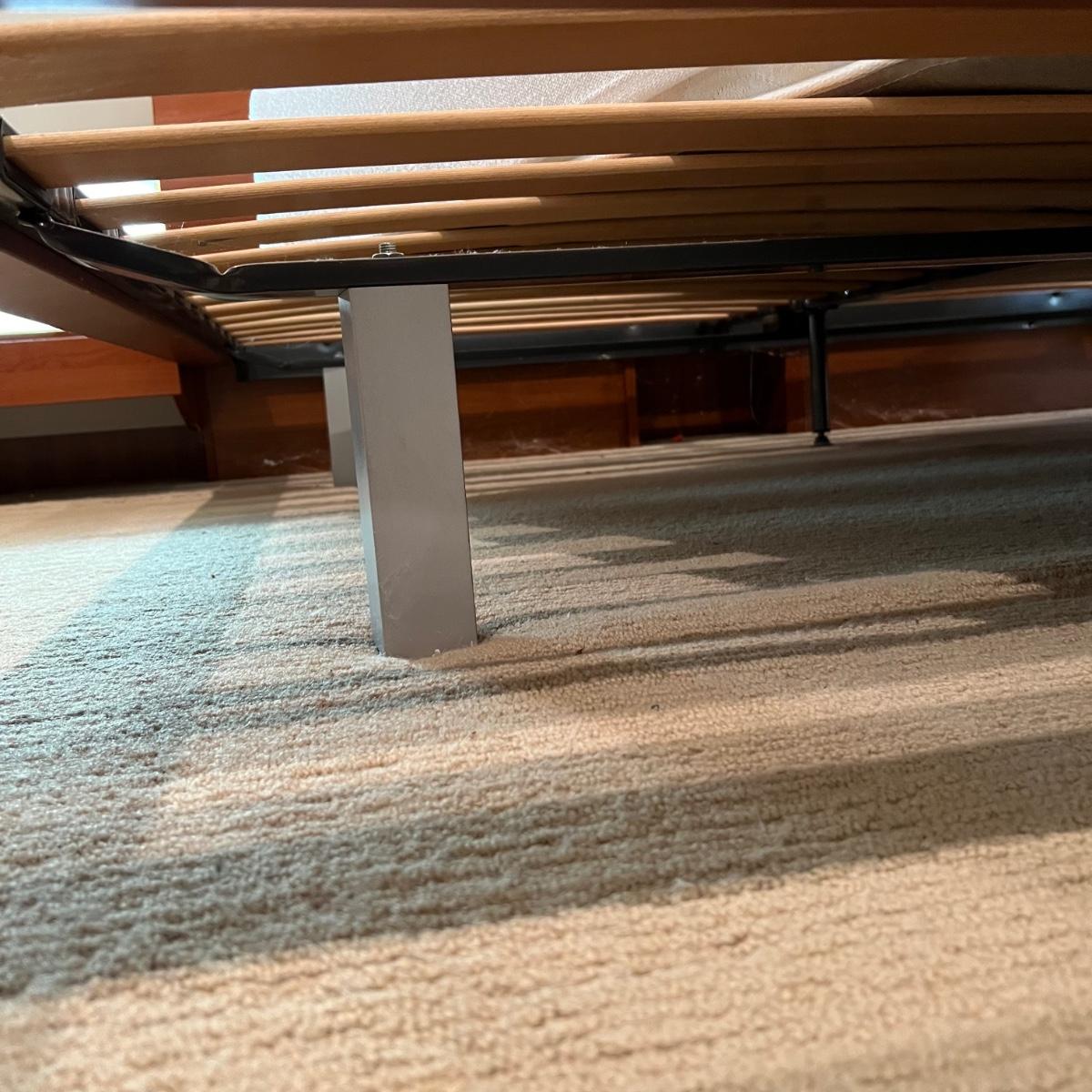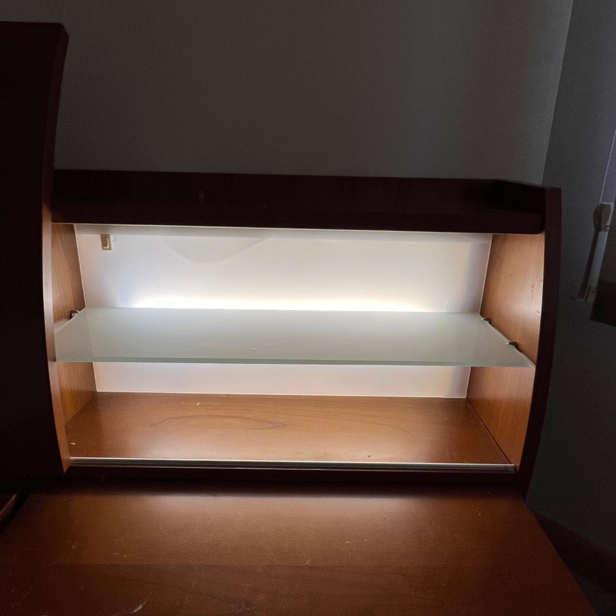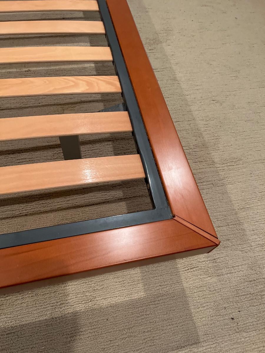 This stunning MCM style bed’s label states it’s a cherry Fushido bed and the mfg. label appears to have the Alfa Italia logo. This unique platform bed has a built in headboard and side sections that include a lower drawer below a glass shelf; both of these sections have lights. Each half of the headboard slides outwards to reveal that the shelves continue all the way to the center. Note there are a few light marks in the wood on top of the drawers. The mattress which has a protective cover on it is available to the winning bidder if they want it. It appears that the headboard can be split into two sections, the last photos show the bolts and screws that will dissemble it, please bring appropriate tools. Note the platform section could only be dissembled into two pieces if the wood surround is dismantled.