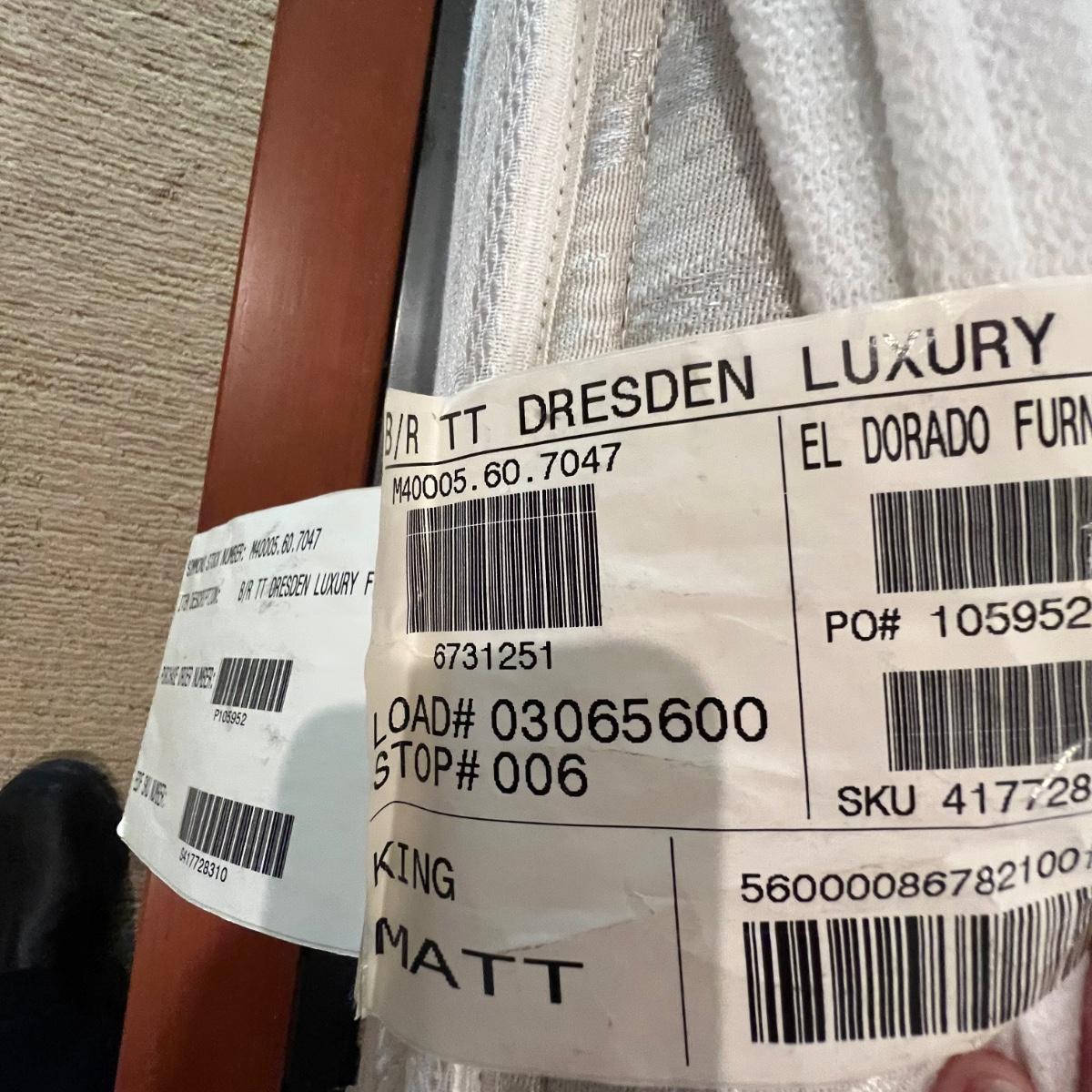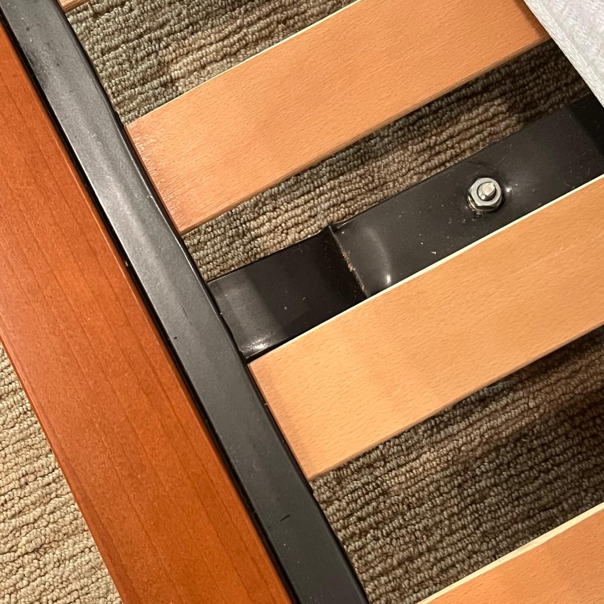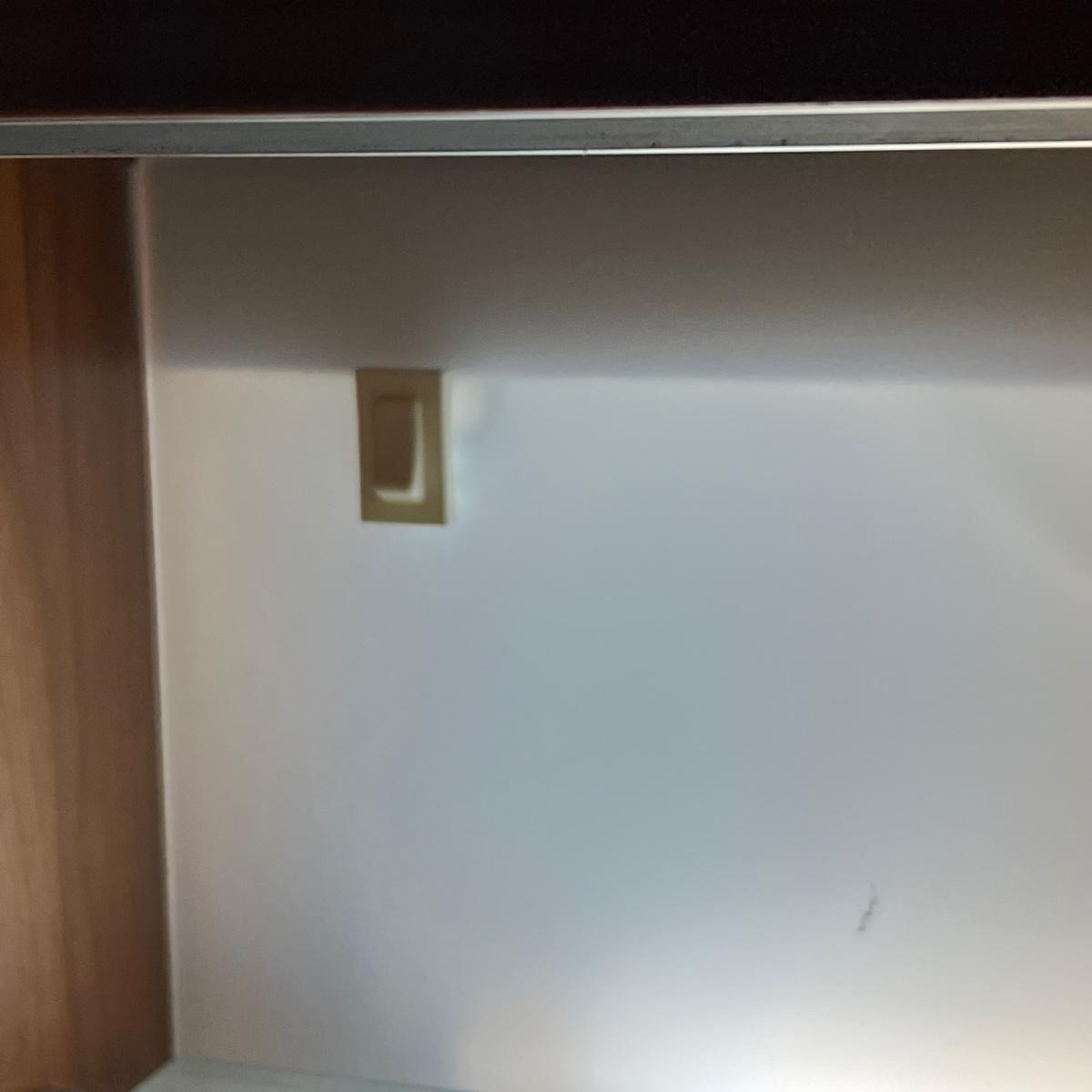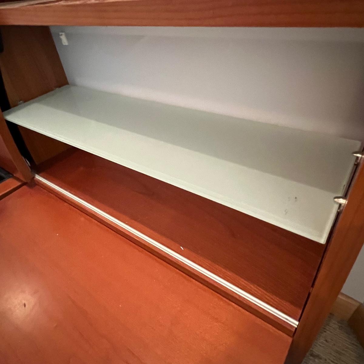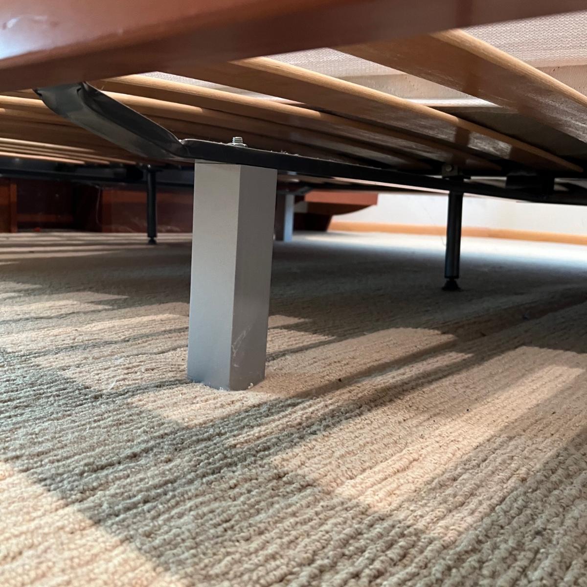 This stunning MCM style bed’s label states it’s a cherry Fushido bed and the mfg. label appears to have the Alfa Italia logo. This unique platform bed has a built in headboard and side sections that include a lower drawer below a glass shelf; both of these sections have lights. Each half of the headboard slides outwards to reveal that the shelves continue all the way to the center. Note there are a few light marks in the wood on top of the drawers. The mattress which has a protective cover on it is available to the winning bidder if they want it. It appears that the headboard can be split into two sections, the last photos show the bolts and screws that will dissemble it, please bring appropriate tools. Note the platform section could only be dissembled into two pieces if the wood surround is dismantled.