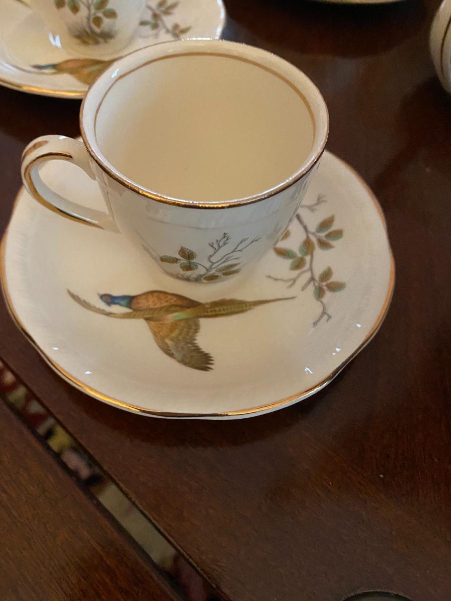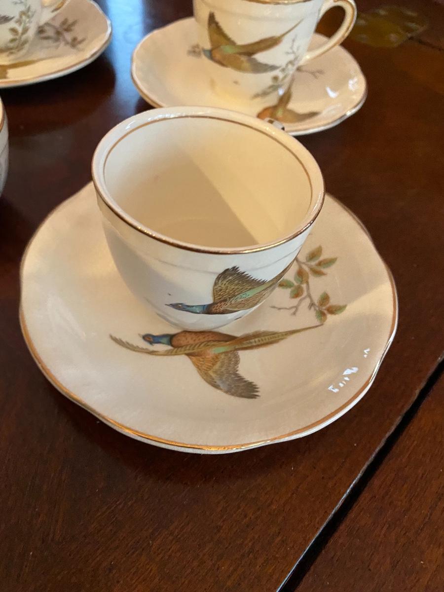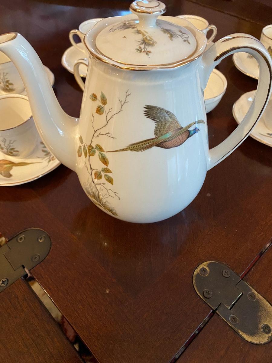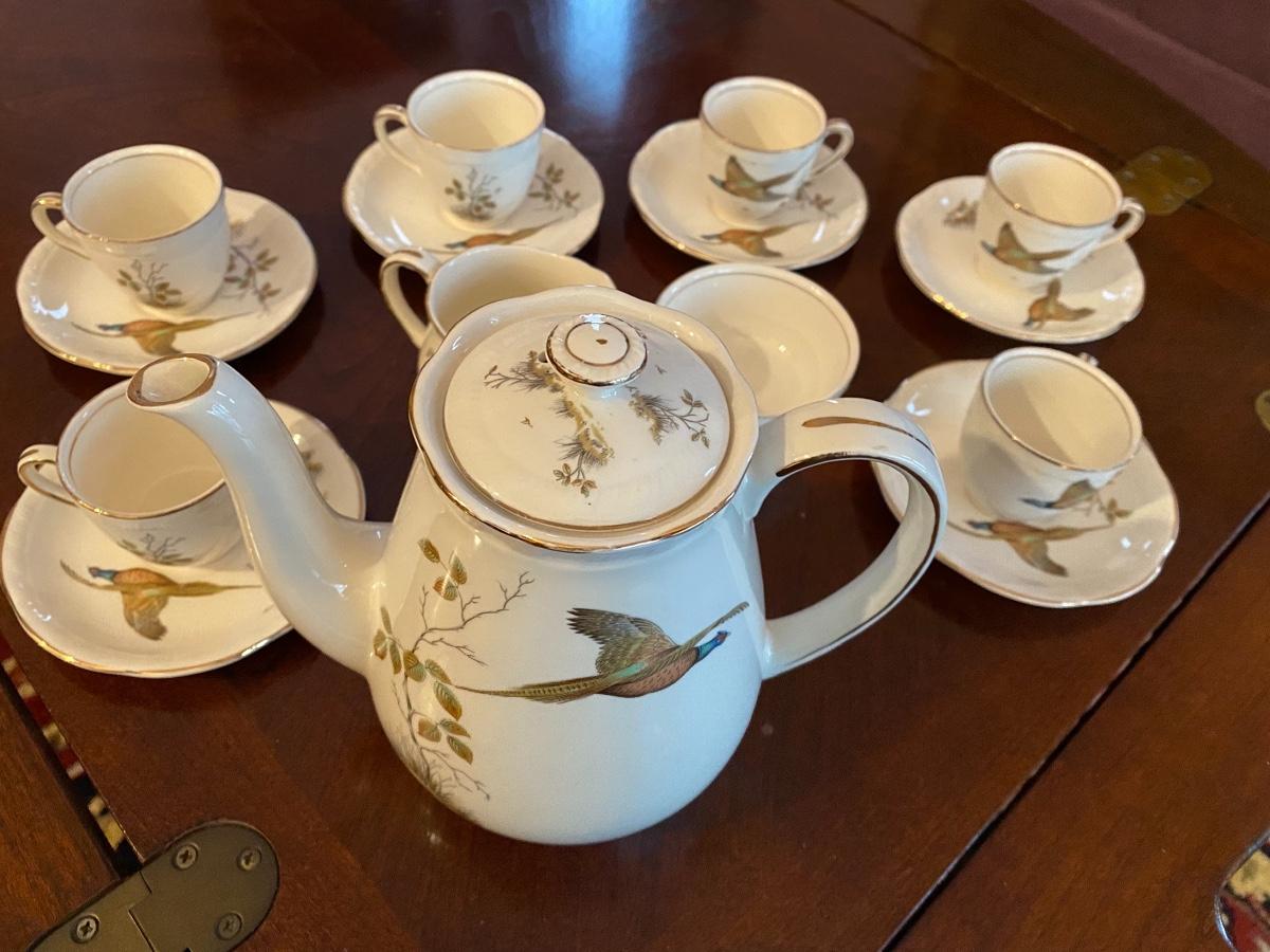 A coffee service for six comprising six cups and saucers, coffee pot, creamer and sugar bowl.