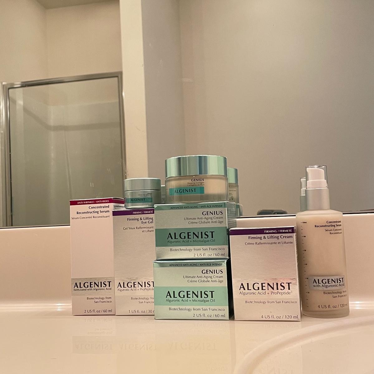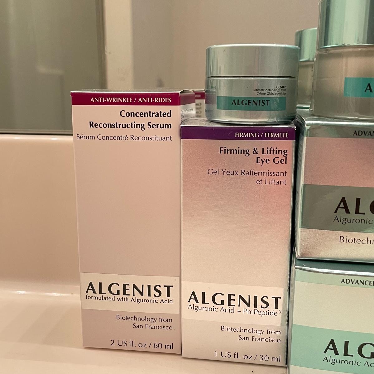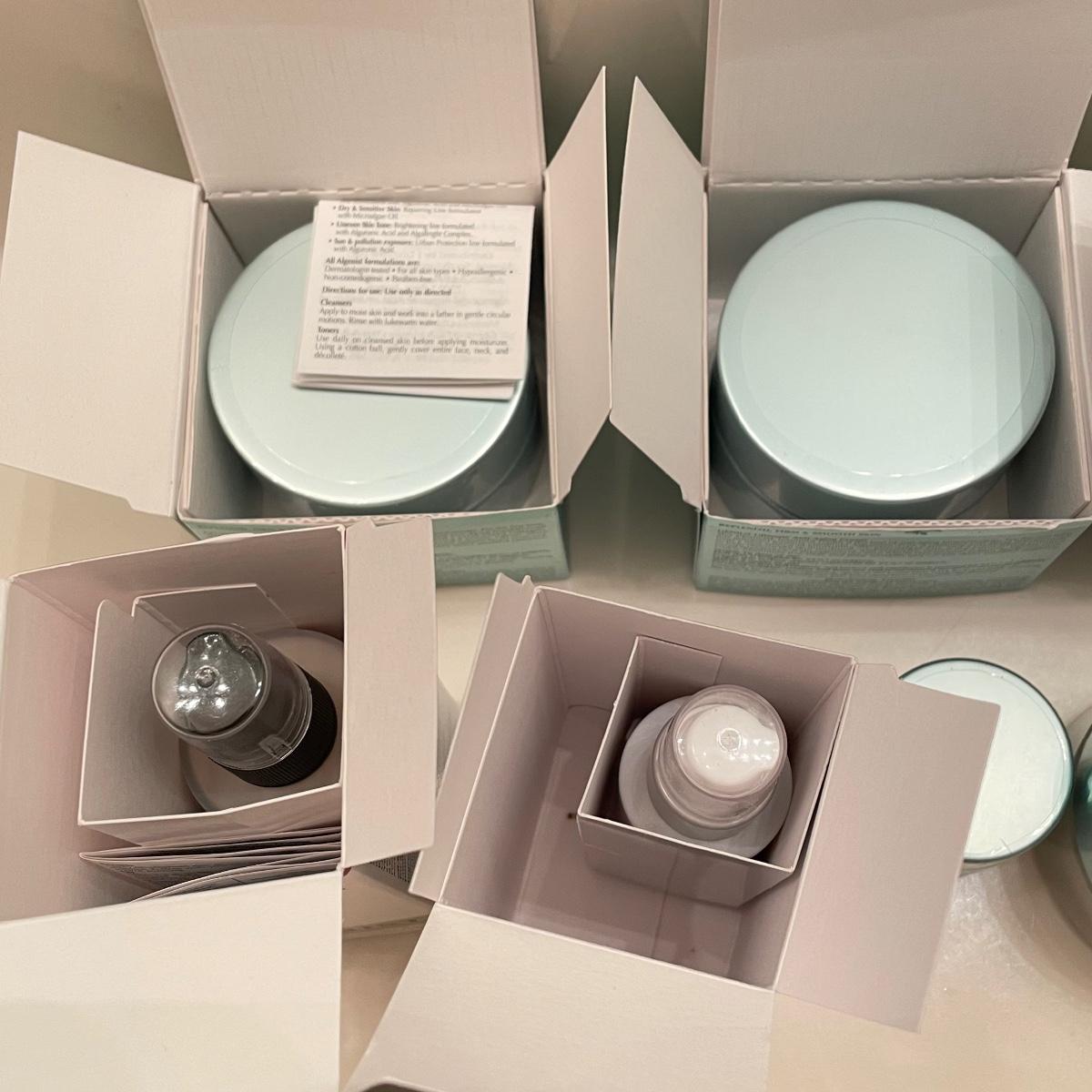 New in packaging, seven Algenist skin care products. All pieces have safety seals or original packaging, expiration dates were not found. Lot includes one 4oz and one 2 oz Concentrated Reconstructing Serum, Firming & Lifting Eye Gel, three 2oz and one half oz Genius, Firming & Lifting Cream. Local pick up only.