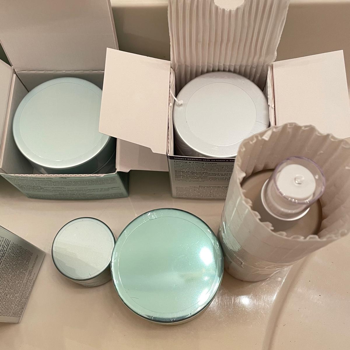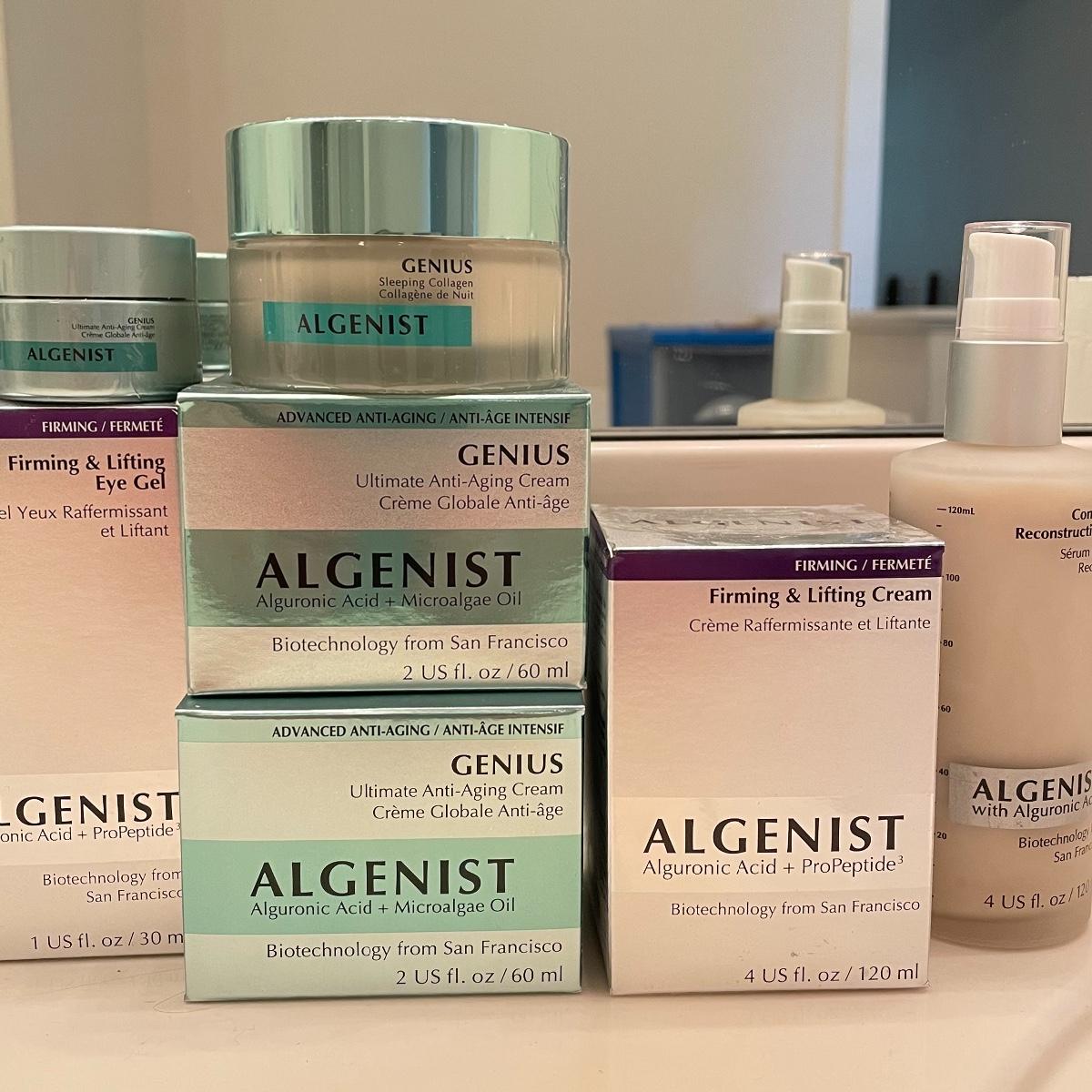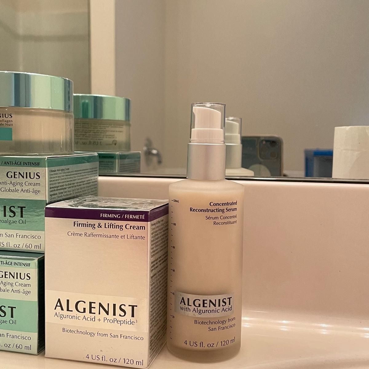 New in packaging, seven Algenist skin care products. All pieces have safety seals or original packaging, expiration dates were not found. Lot includes one 4oz and one 2 oz Concentrated Reconstructing Serum, Firming & Lifting Eye Gel, three 2oz and one half oz Genius, Firming & Lifting Cream. Local pick up only.