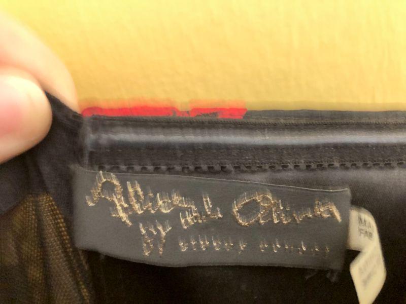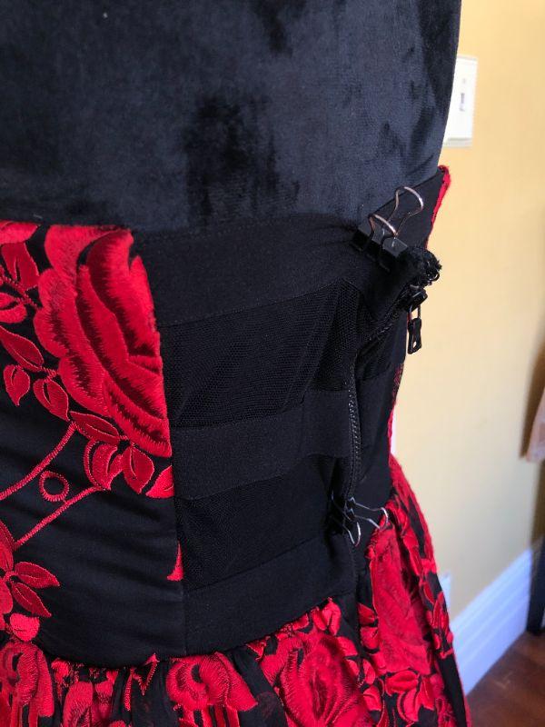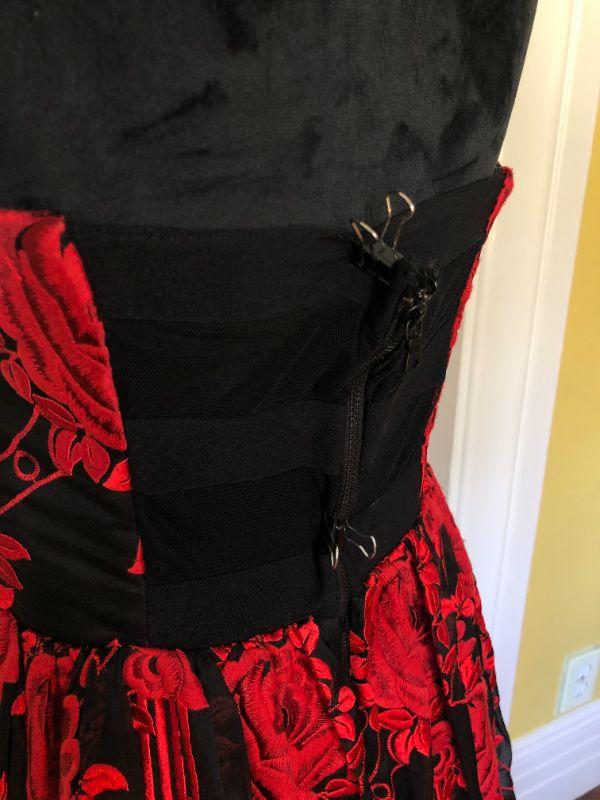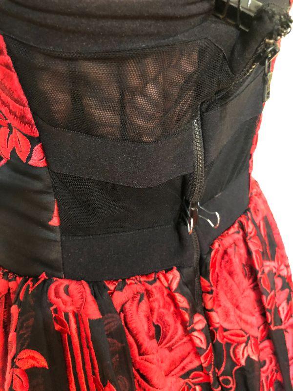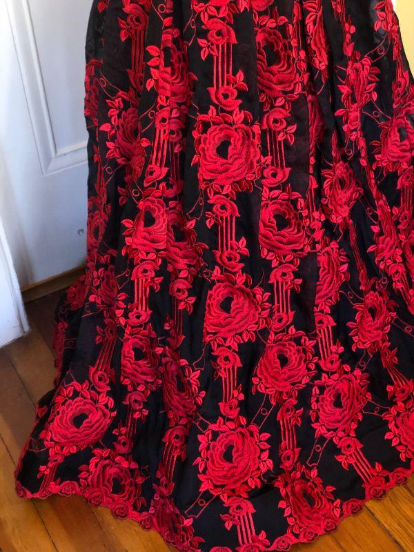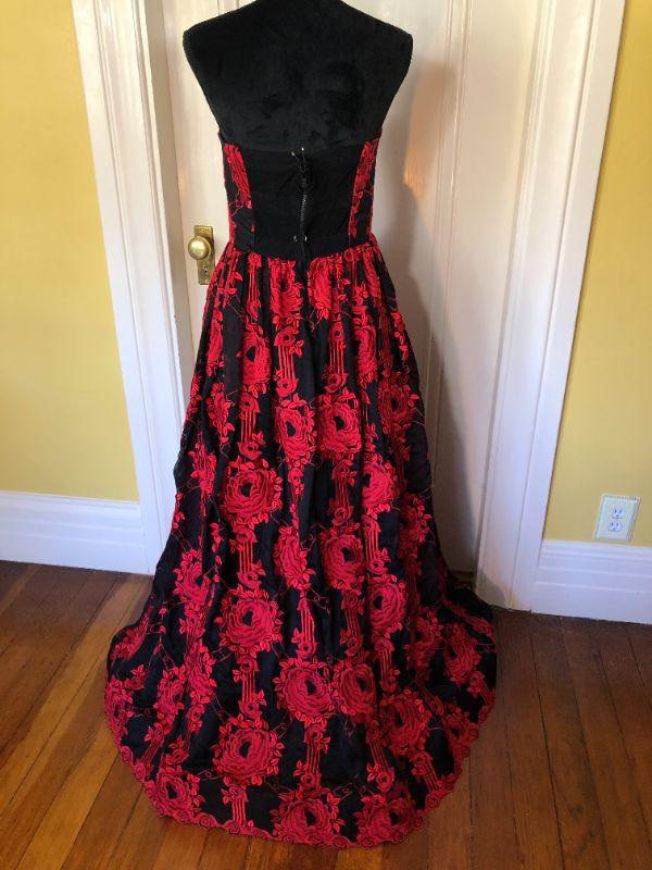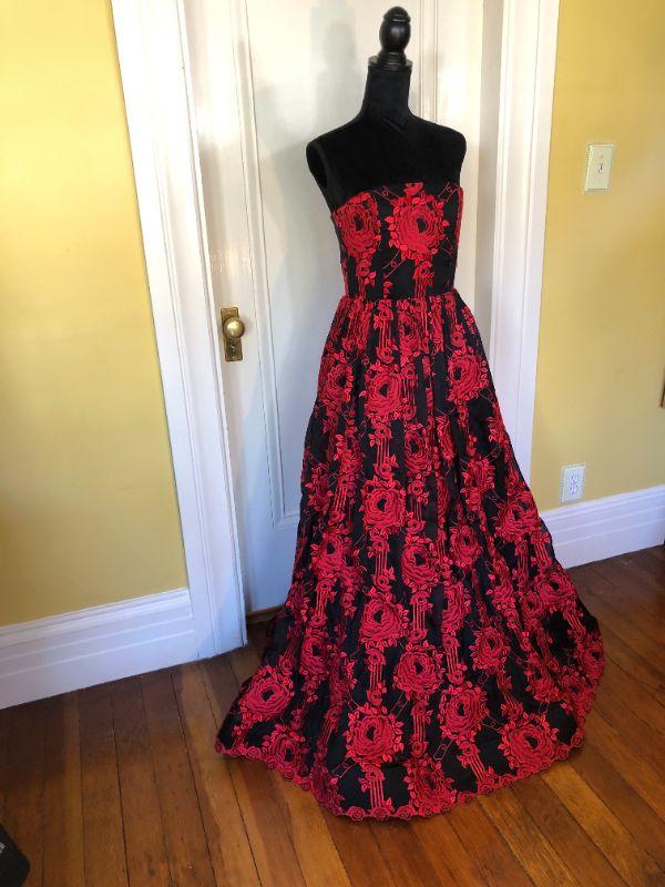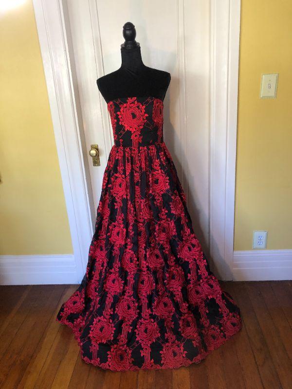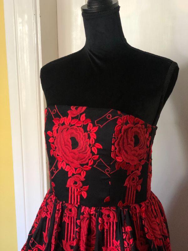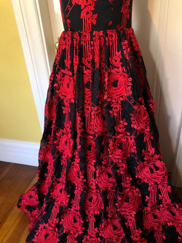 Gorgeous black and red rose gown. Labeled Alice and Olivia by Stacey Bendet, Size 10. Fabric corset has nice stretch, shown in photo. In excellent condition (one small visible run in fabric, shown), was dry cleaned by owner. From the fashion collection of a San Francisco Presidio Heights estate.