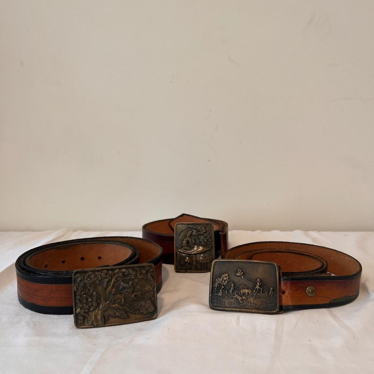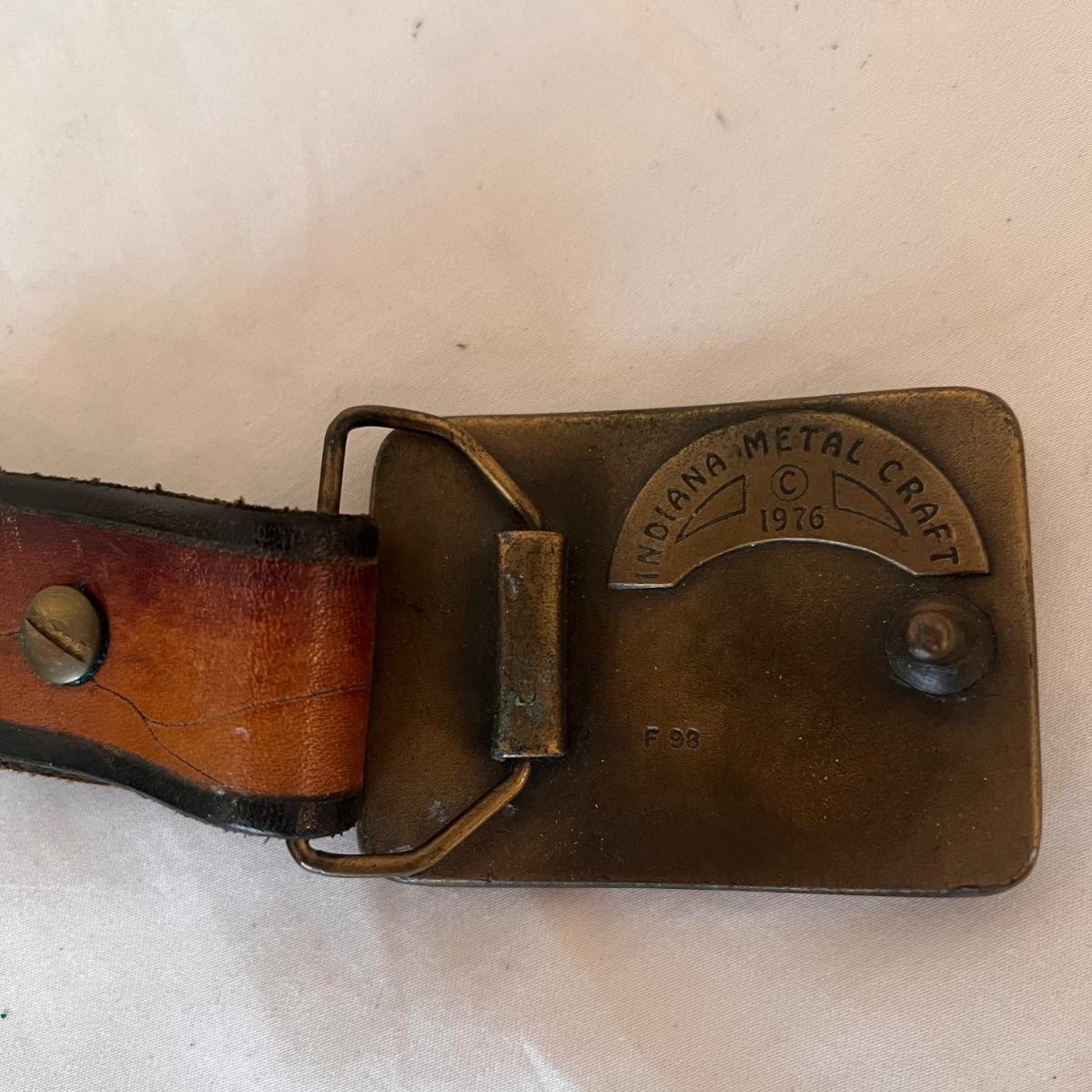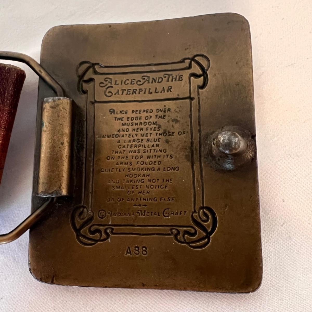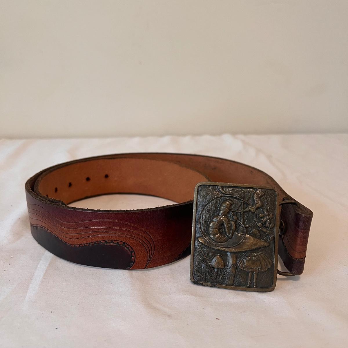 This lot includes three leather belts with vintage metal belt buckles. All belts are made of leather, with their buckles made of metal. The longest belt (54” x 2”) has the Cheshire Cat buckle. The belt with the Indiana Metal Clay Winnie the Pooh buckle measures 41” x 2”H. It is stamped 1976. The Alice and The Caterpillar buckle measures 41” x 2.75”H. Shipping available.