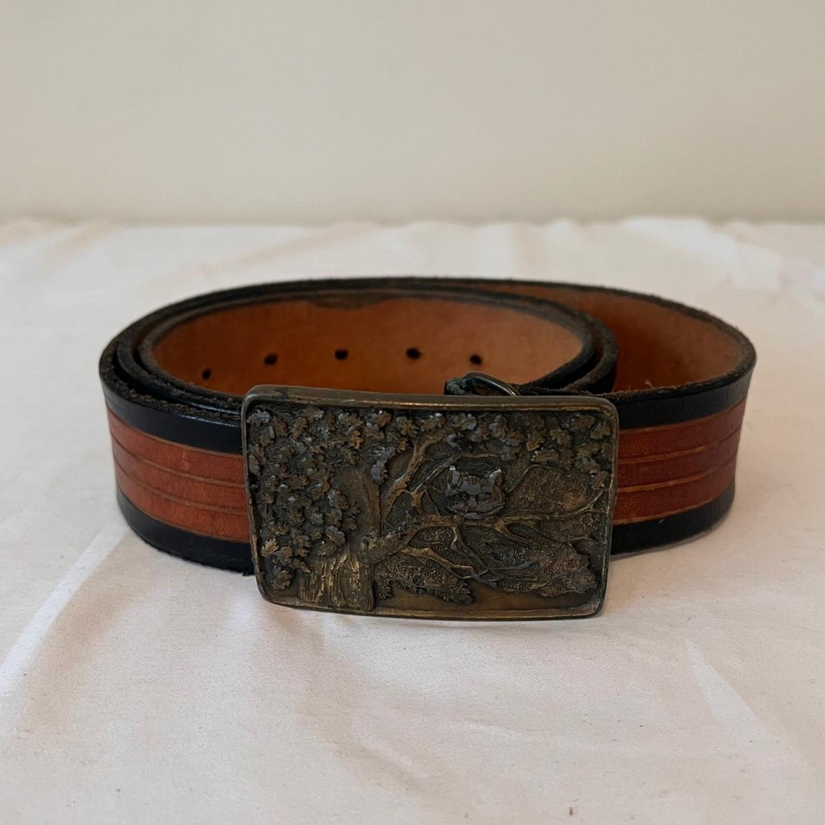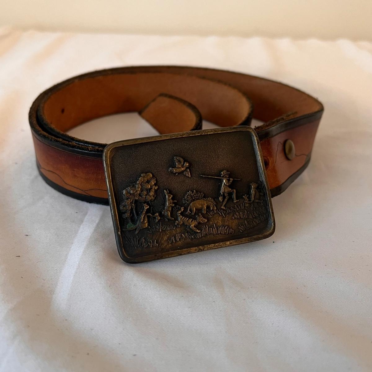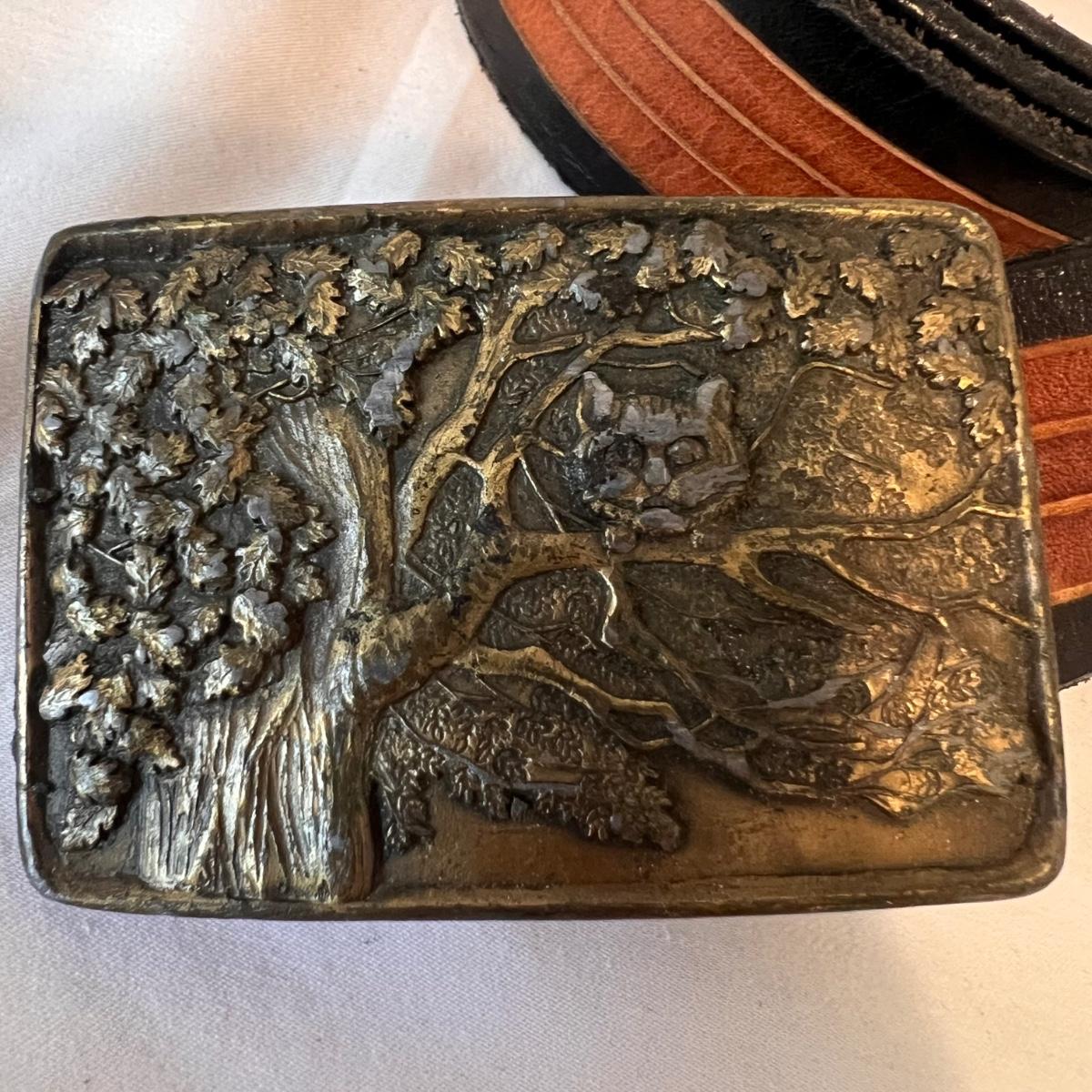 This lot includes three leather belts with vintage metal belt buckles. All belts are made of leather, with their buckles made of metal. The longest belt (54” x 2”) has the Cheshire Cat buckle. The belt with the Indiana Metal Clay Winnie the Pooh buckle measures 41” x 2”H. It is stamped 1976. The Alice and The Caterpillar buckle measures 41” x 2.75”H. Shipping available.