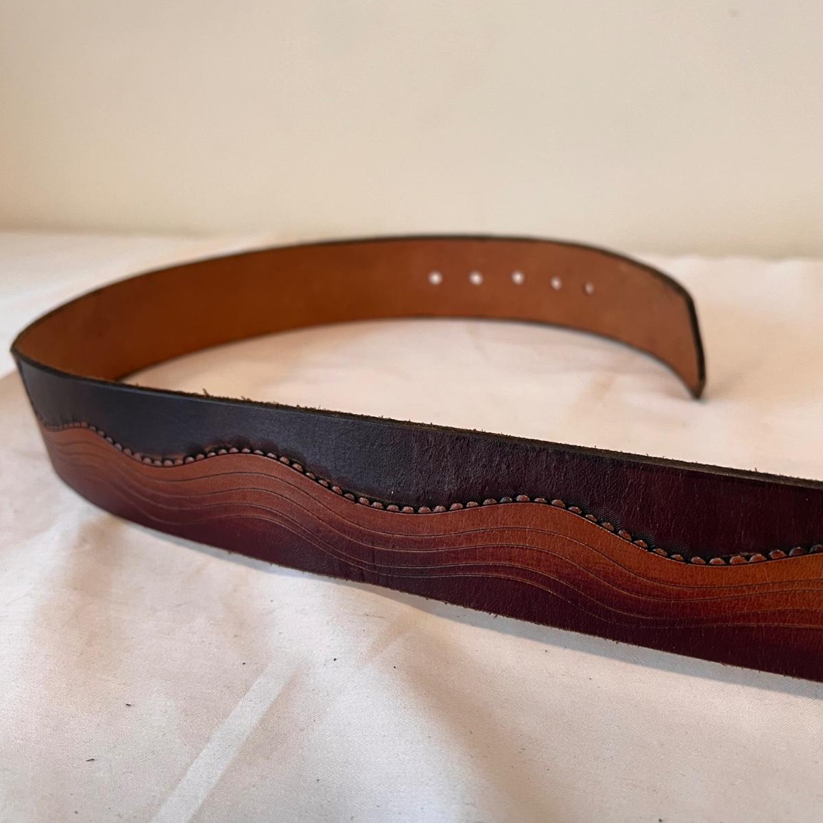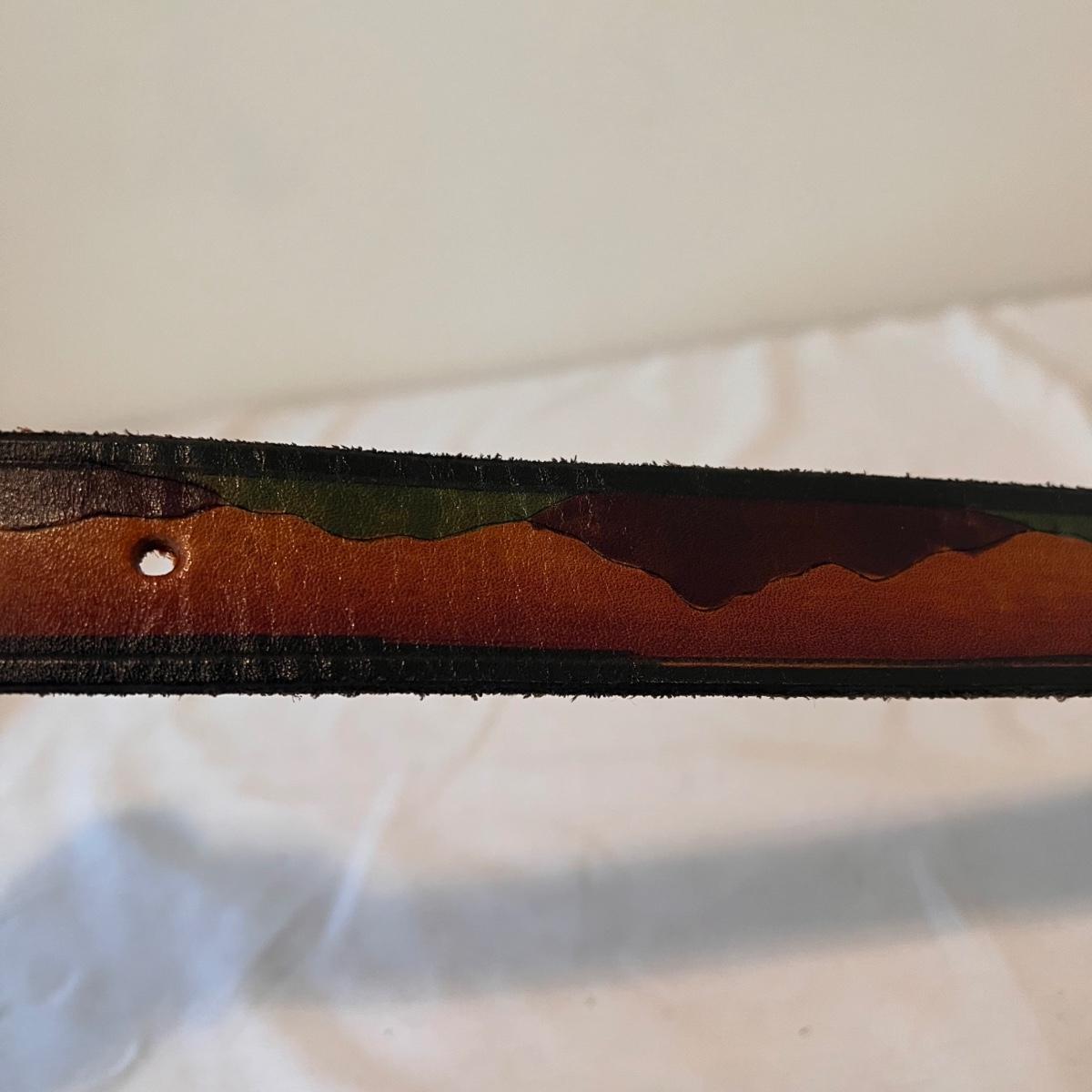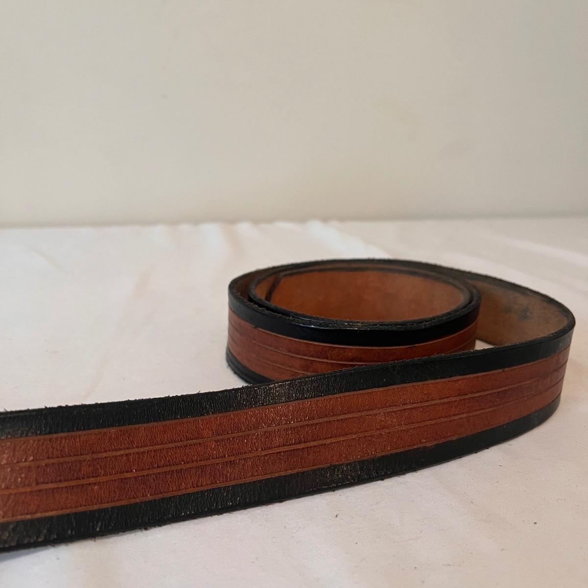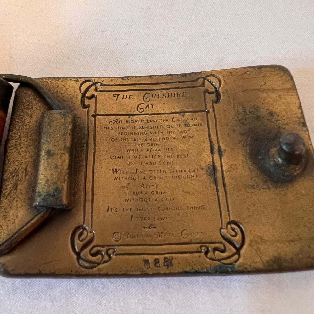 This lot includes three leather belts with vintage metal belt buckles. All belts are made of leather, with their buckles made of metal. The longest belt (54” x 2”) has the Cheshire Cat buckle. The belt with the Indiana Metal Clay Winnie the Pooh buckle measures 41” x 2”H. It is stamped 1976. The Alice and The Caterpillar buckle measures 41” x 2.75”H. Shipping available.
