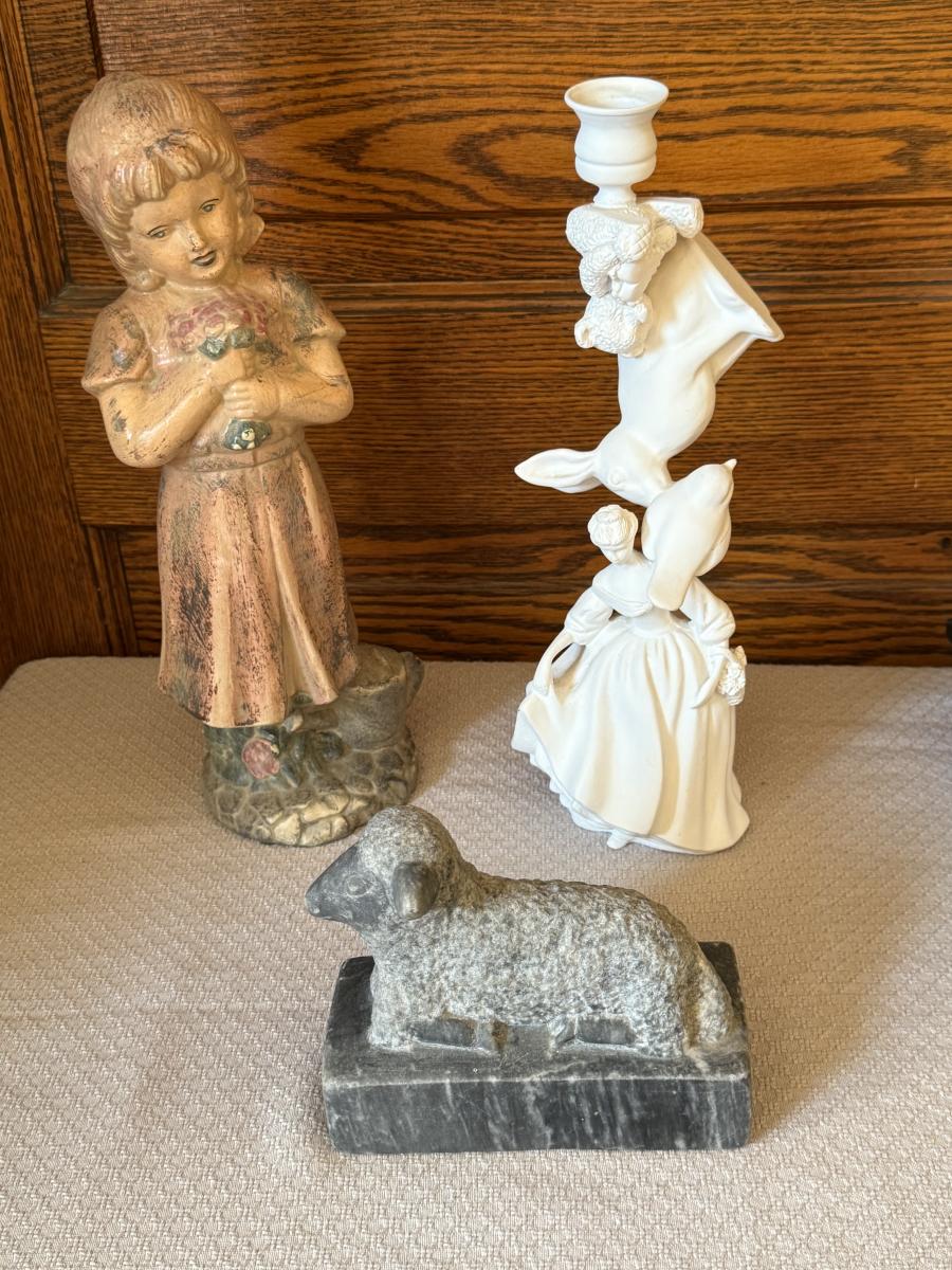 Alice in Wonderland Candle Holder, Marble Lamb Sculpture, Ceramic Doll w/flowers