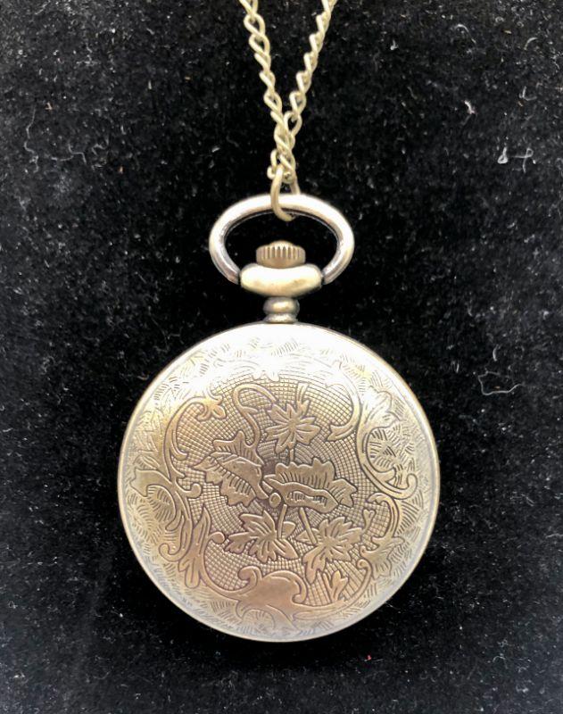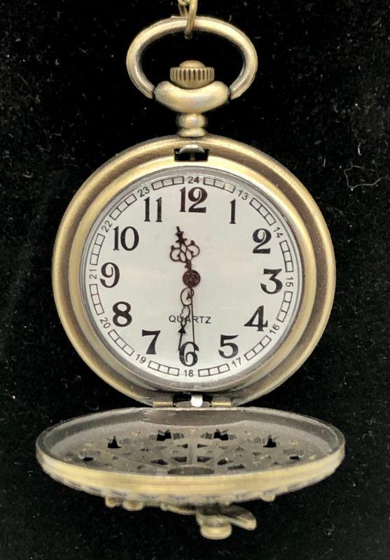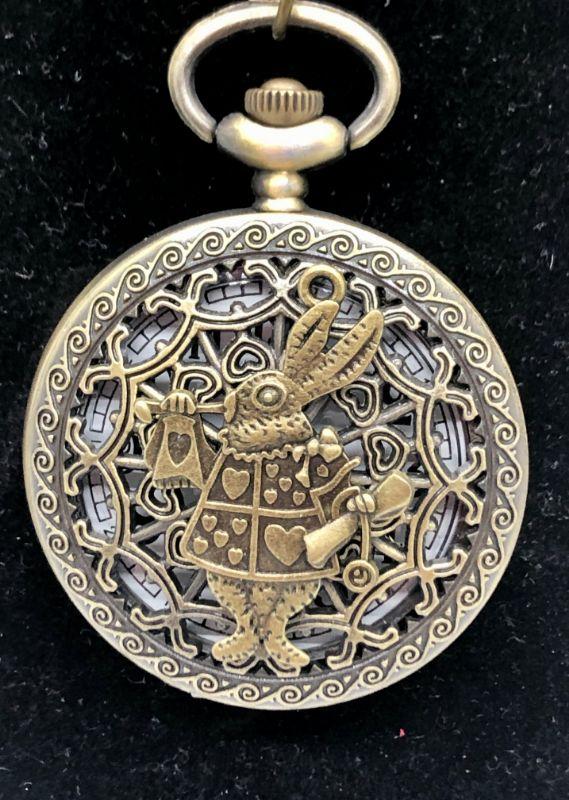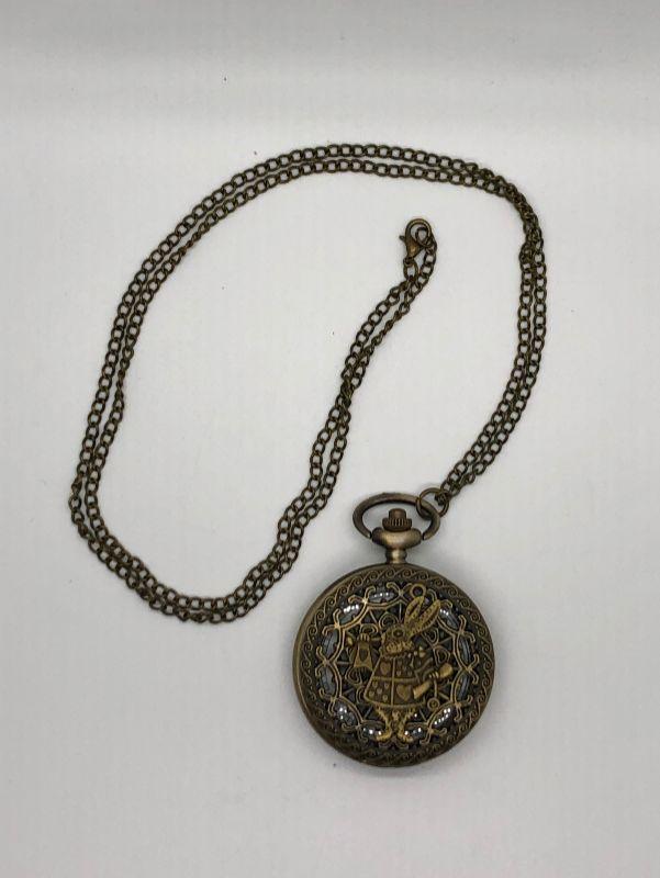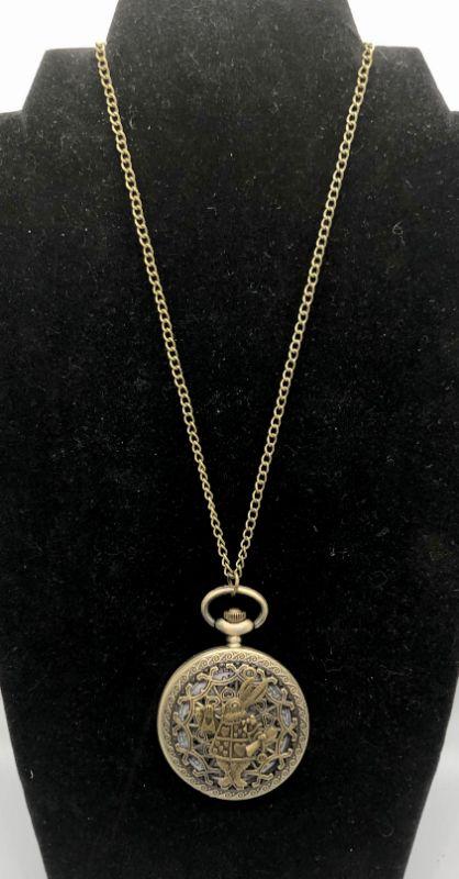 Alice in Wonderland White Rabbit pocket watch pendant necklace. Dark brass tone metal. Unbranded watch. Currently not running. Watch is about 2.5" length.
