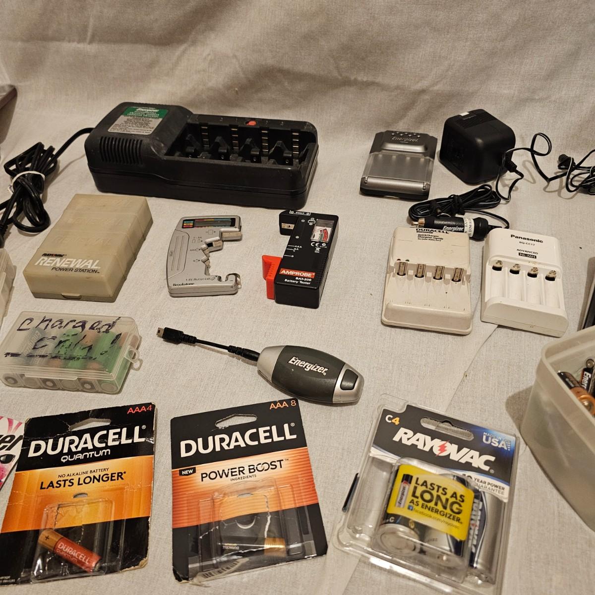 Large assortment of batteries and battery equipment. Batteries from flat cells to D cells, Duracell, Rayovac, Energizer and more. Several different types of testers. Rechargeable batteries and chargers. Some new, some used. No guarantee on any if these items. Testers and chargers not tested. See photos for details. Local pickup only. All sales are final. No returns or refunds. Please bid accordingly.