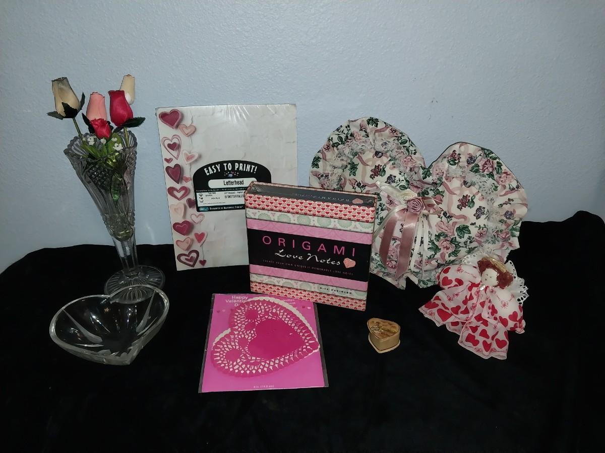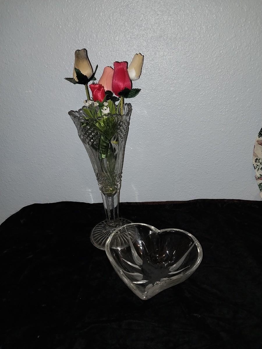 WOOD ROSES-CRYSTAL ORIGAMI OVASE 10" TALL-CRYSTAL CANDY DISH-ORIGAMI NOTE PAPER-TRINKET BOX-PILLOW-MORE