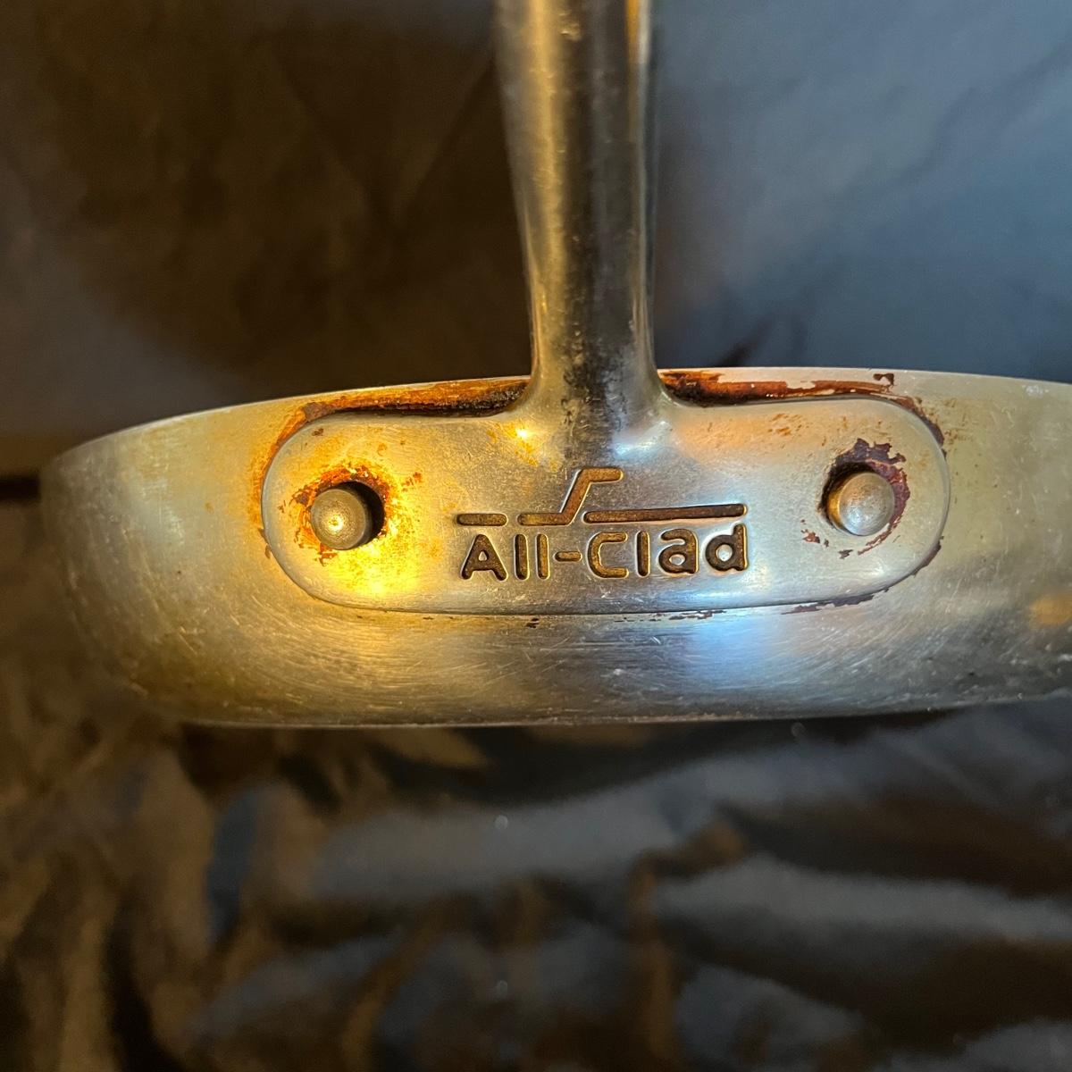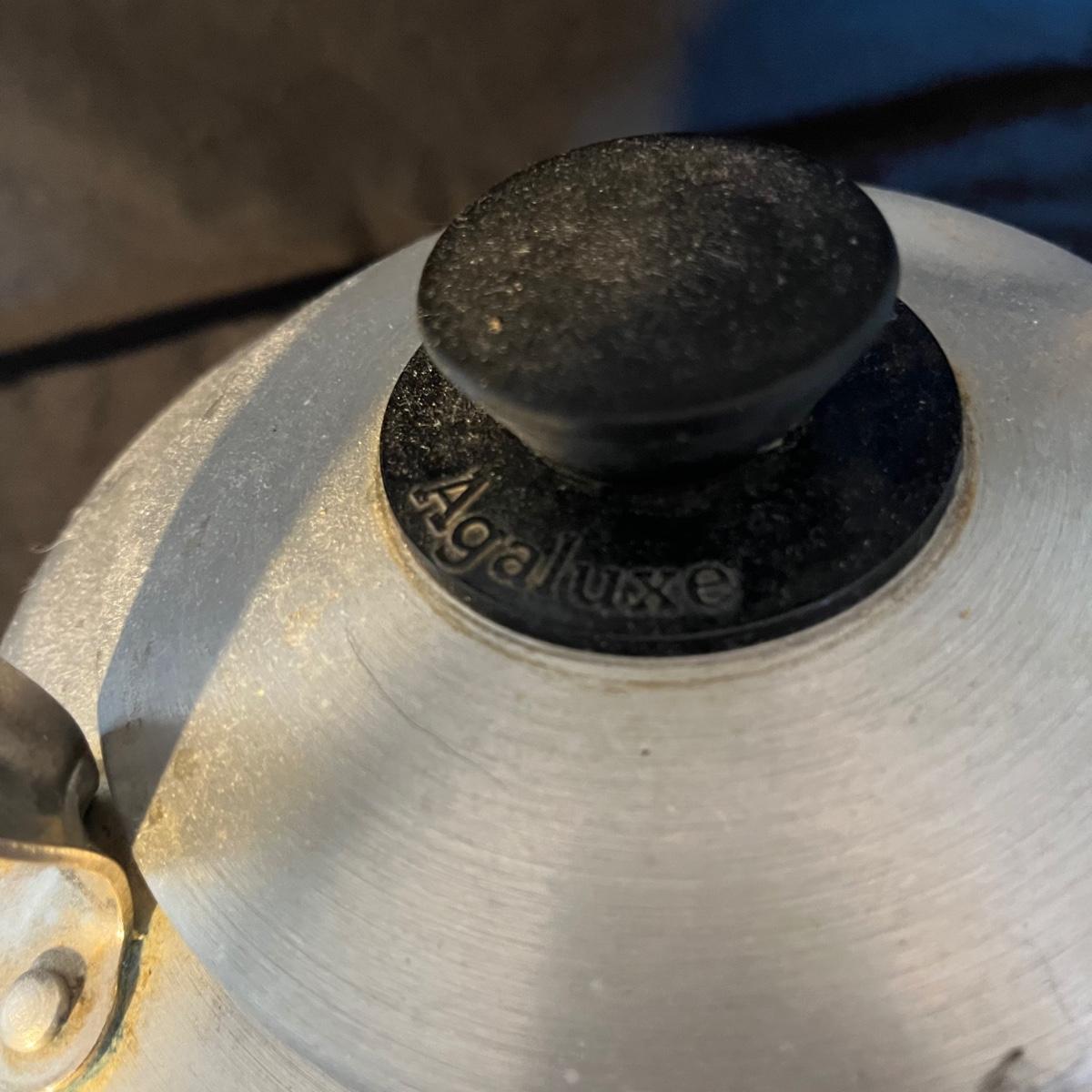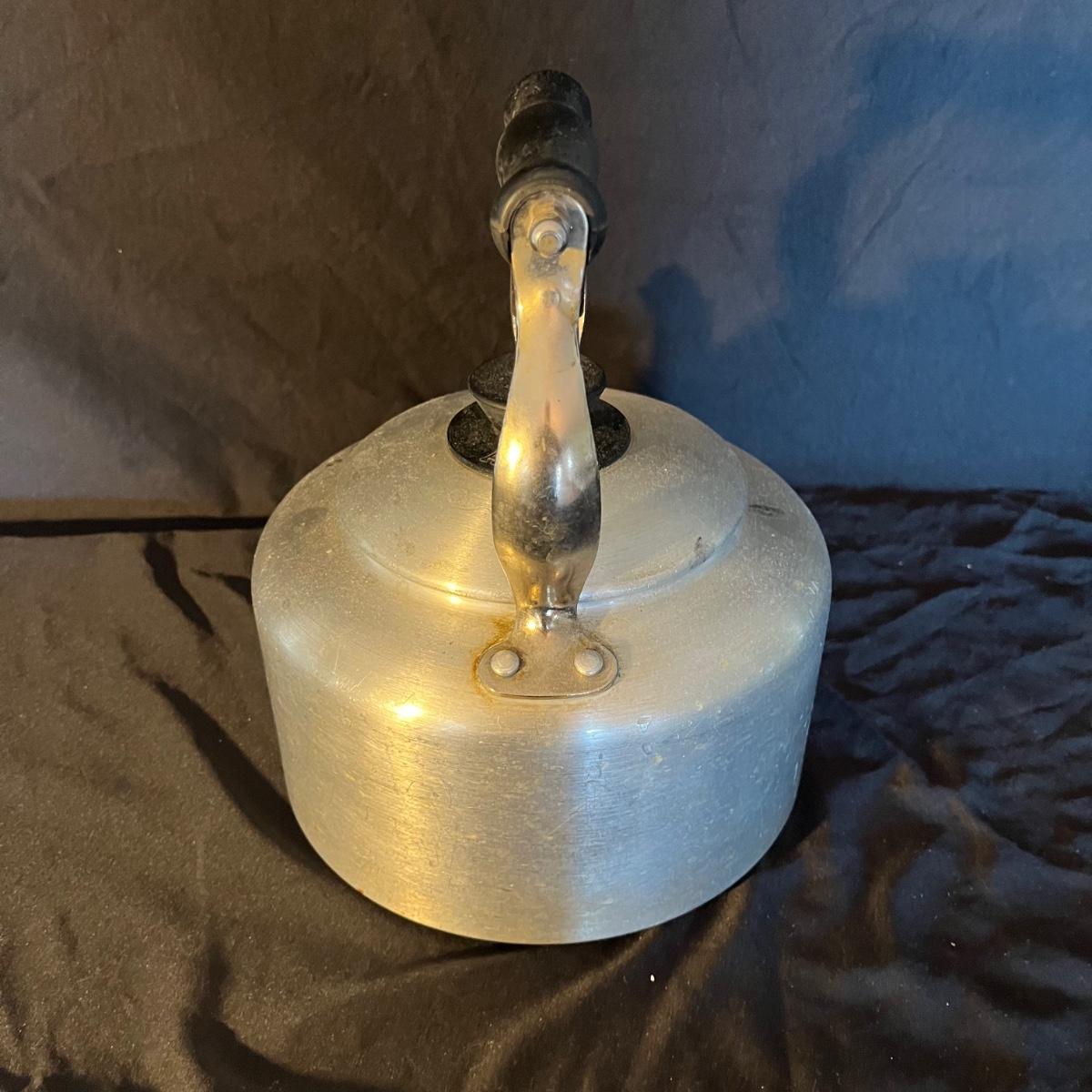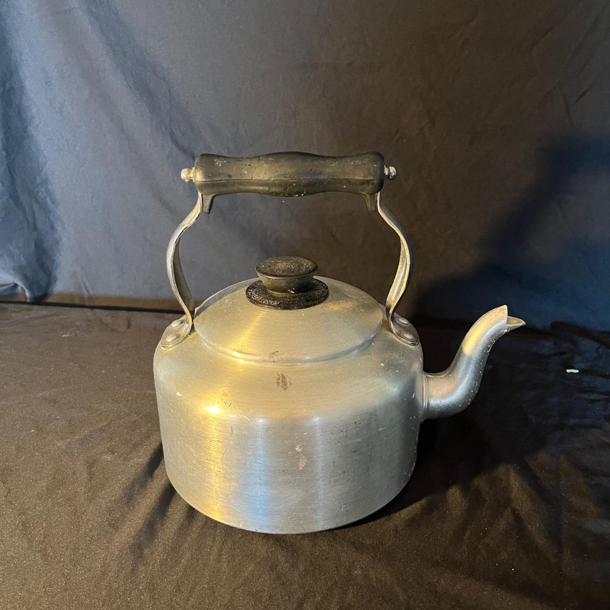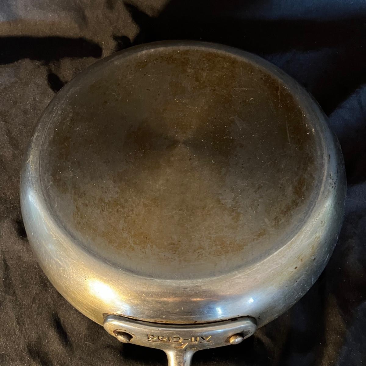 Lot includes an All Clad 9.5”D frying pan and a Agaluxe aluminum teapot. These items show some wear but are otherwise in good condition.