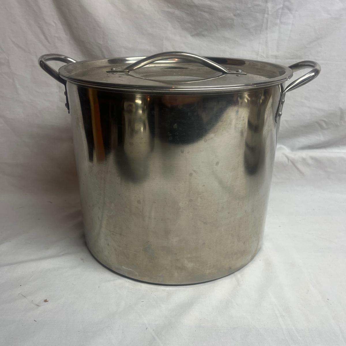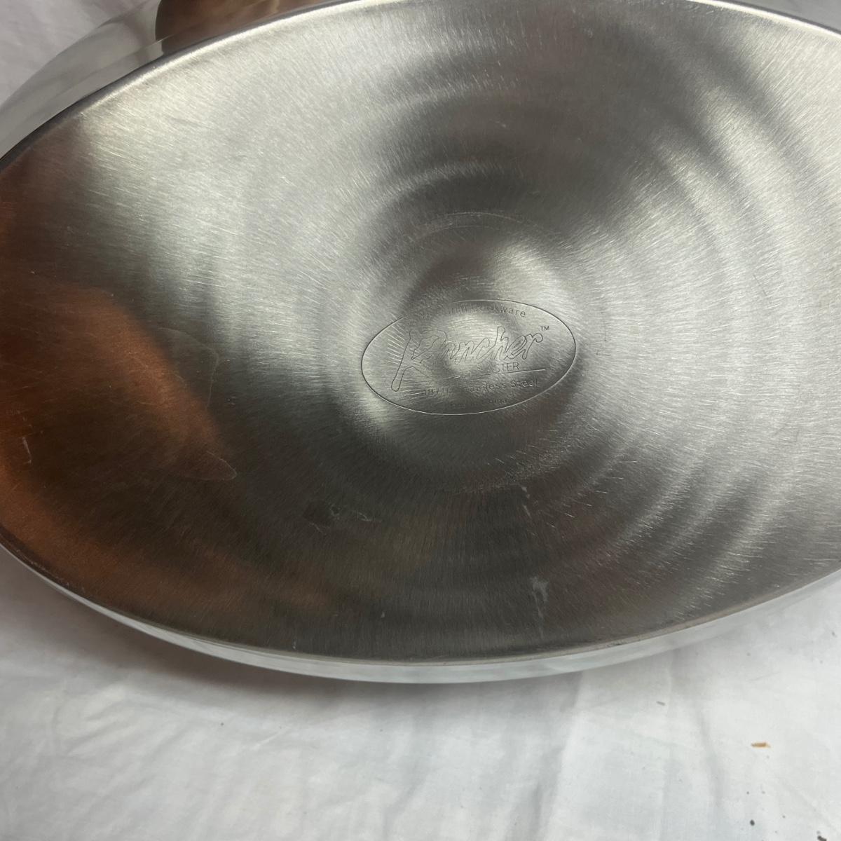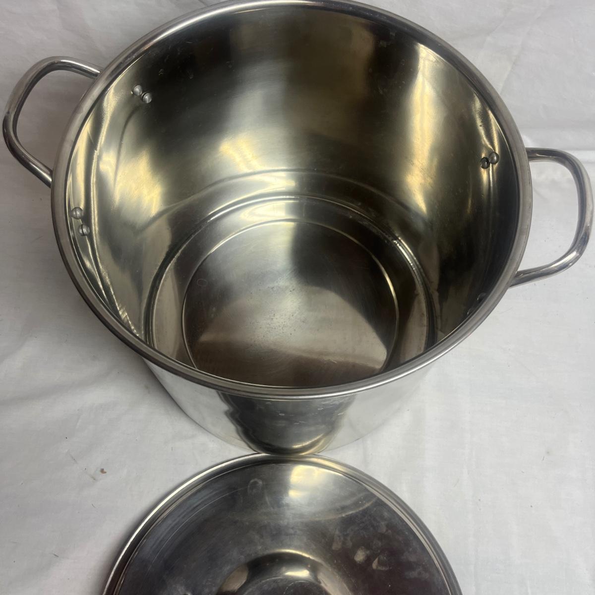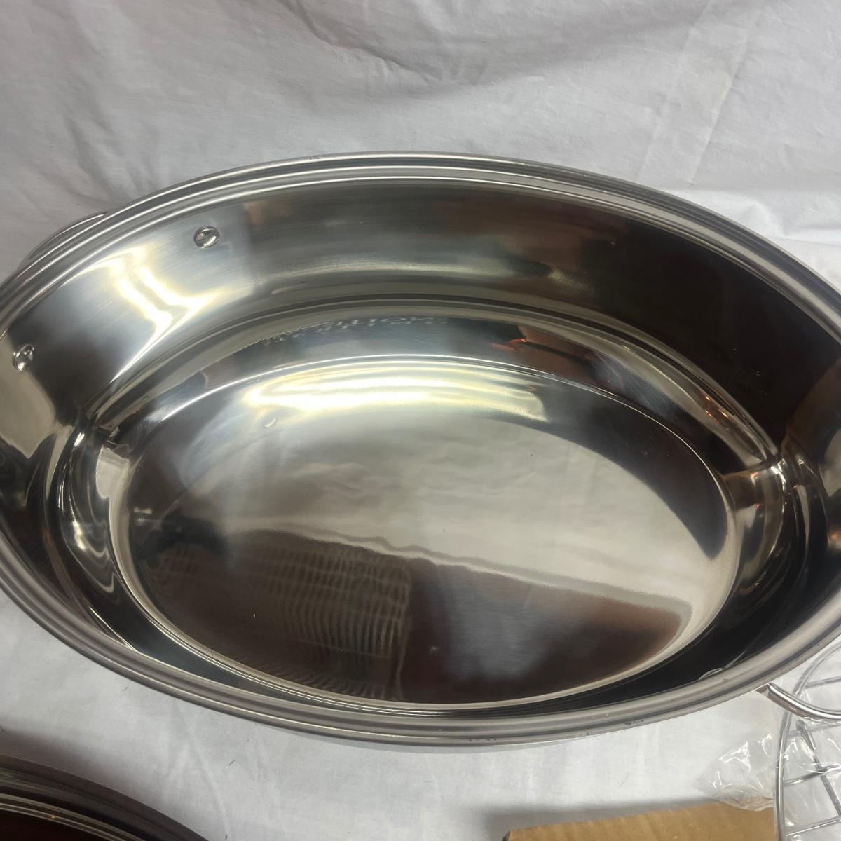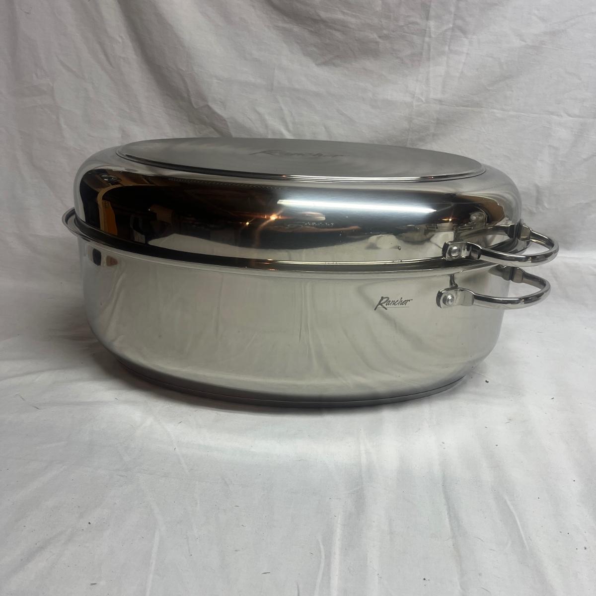 Lot includes an All Clad steamer, Rancher roaster pan and a large pot with lid. Roaster measures 19” x 12” x 9”H.