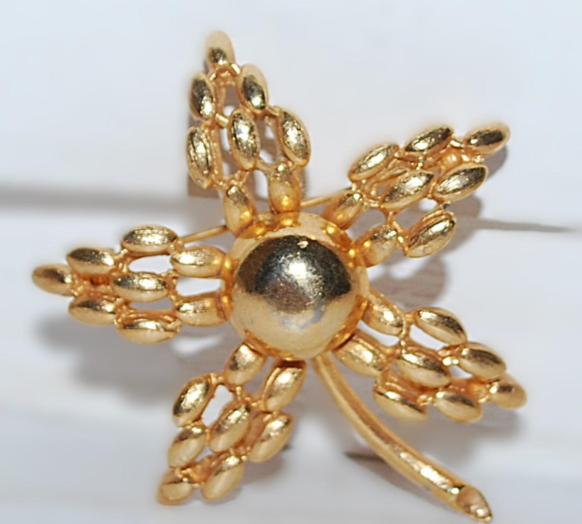 All Gold Colored 5 Petals BROOCH (2" x 2") with Half Globe and Stem Brushed Gold Tone Setting