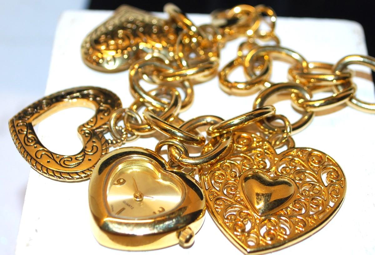 ALL HEARTS Bracelet with Locket, Clock and Gold Tone Hearts 7 " L