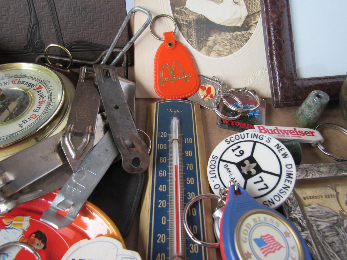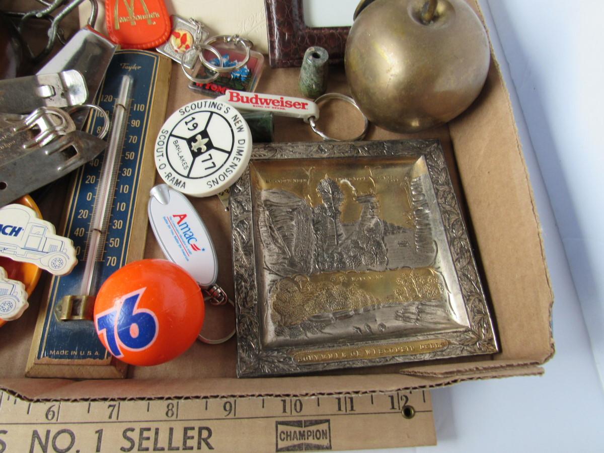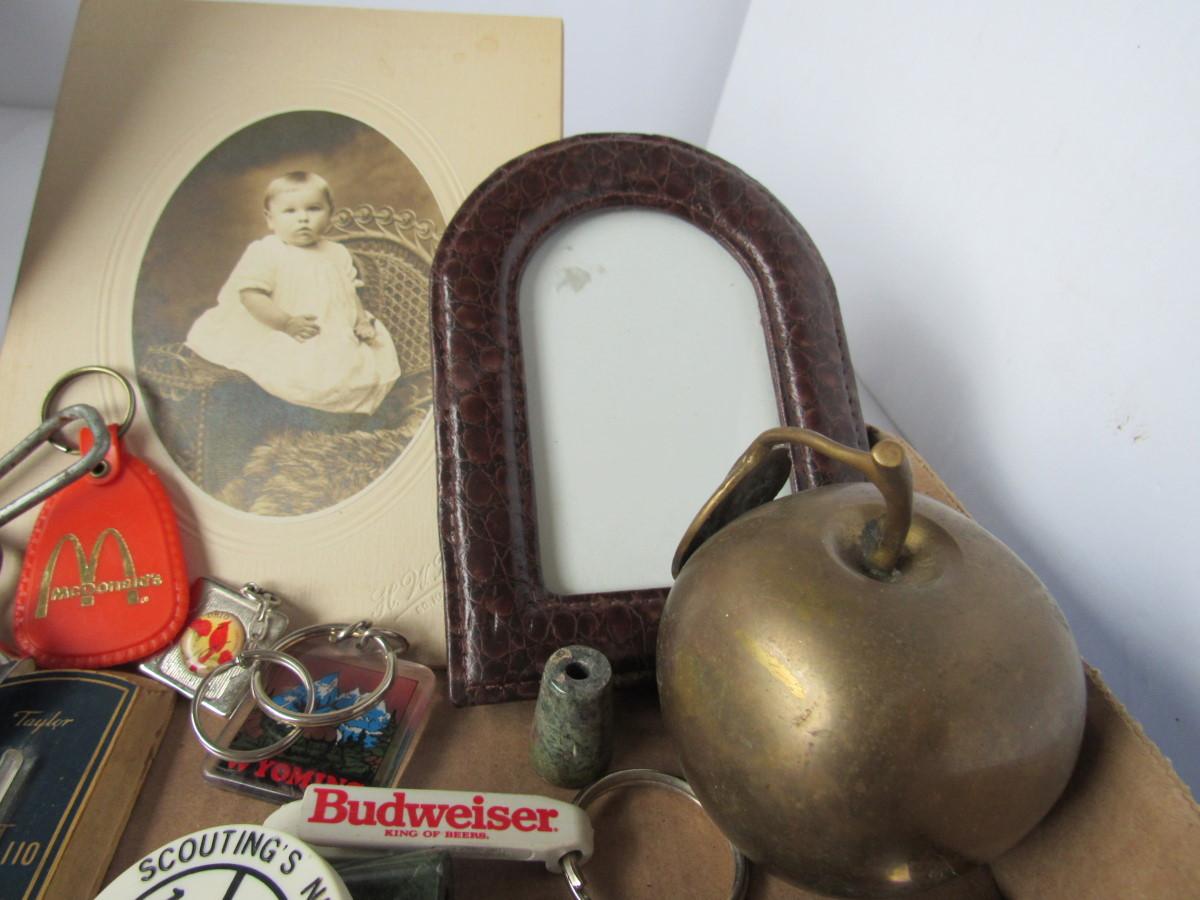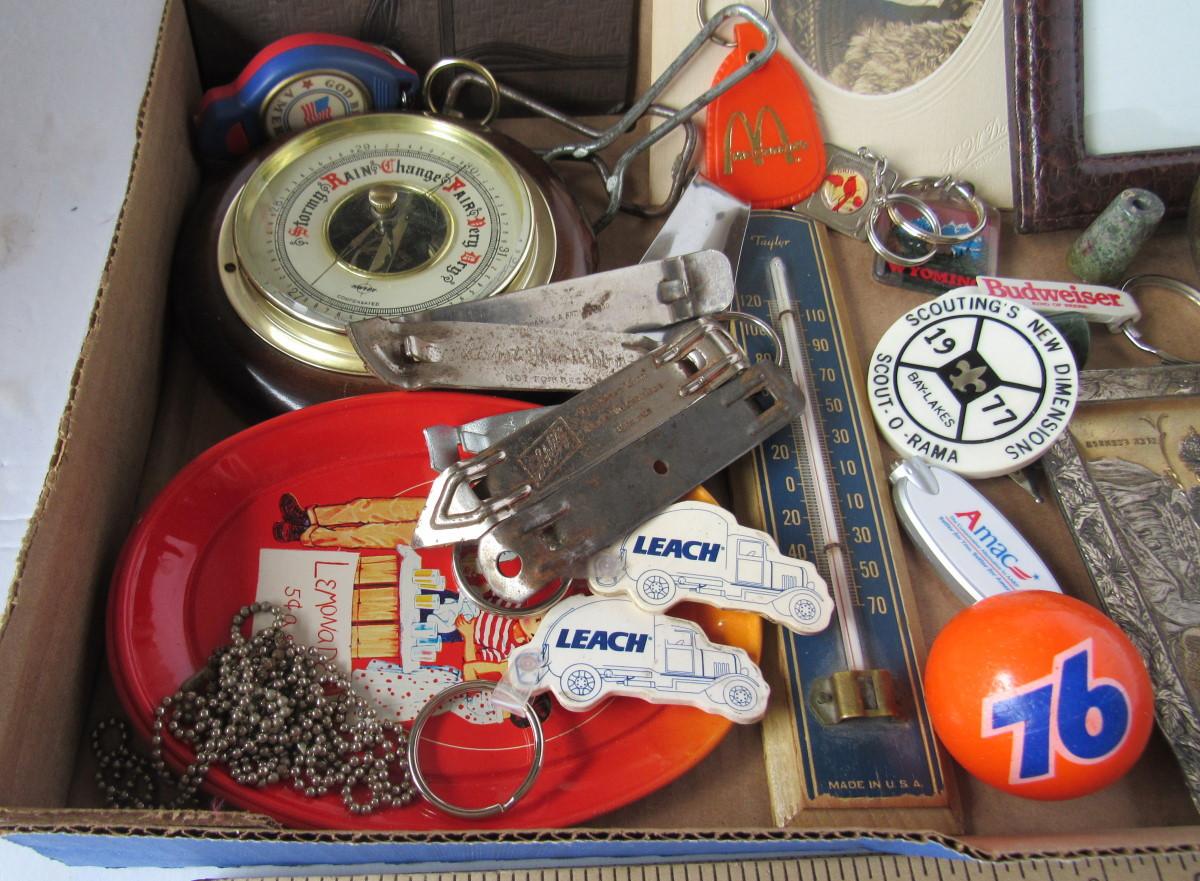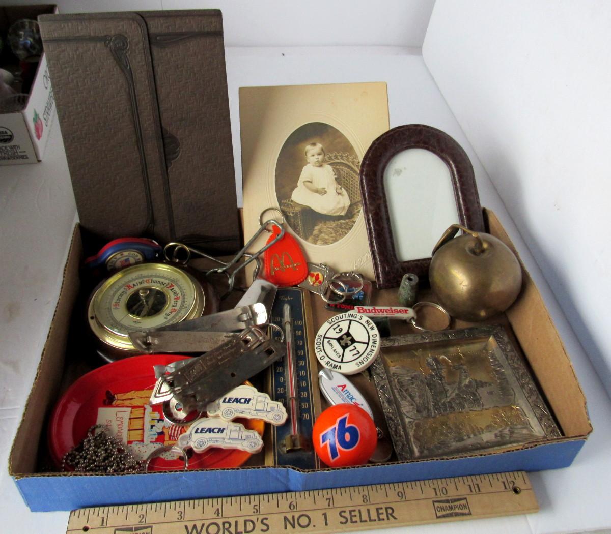 Key rings, small trays, ashtrays, frame, antique photo, much more. Shipping is available at actual shipping cost plus $5.00 handling fee per box for supplies/labor. See our terms for details. All sales are final. Condition notes may not be all inclusive, we may miss some issues as most vintage items are not in mint condition and have some degree of wear, paint loss, etc, but we always try to note obvious damage.
