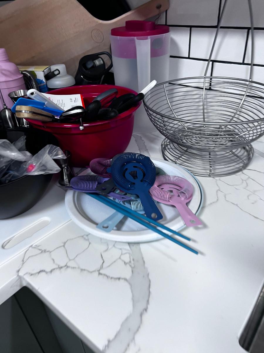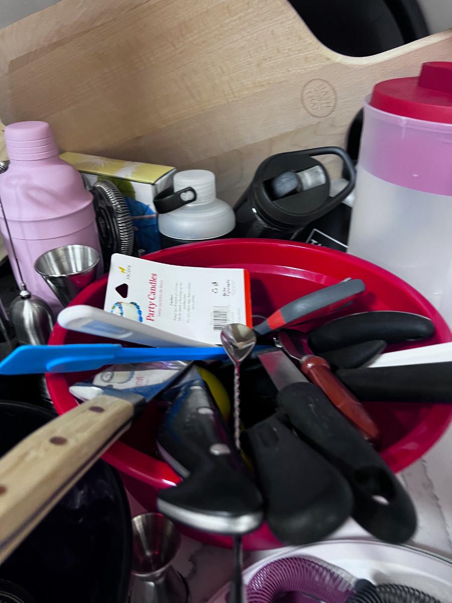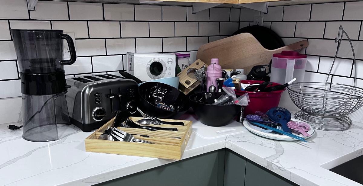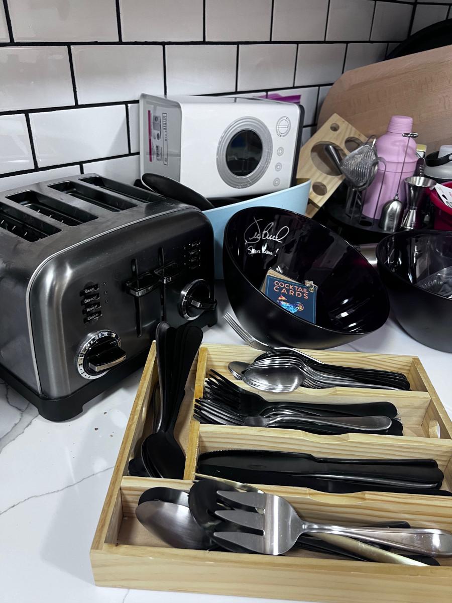 All Manner of Kitchen Stuff: Utensils (2 sets), Toaster, Fruit Bowl