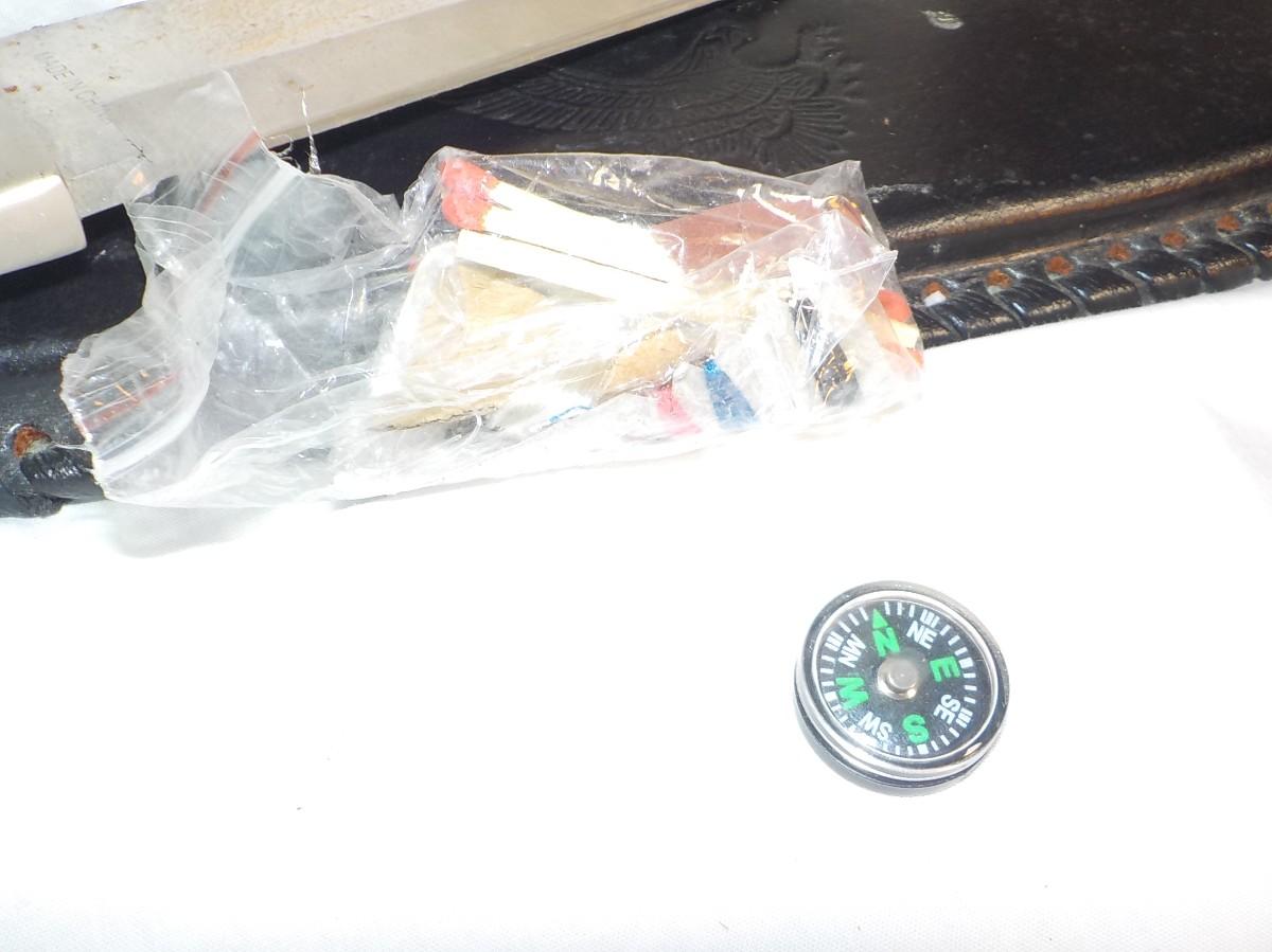 Has scabbard of leather solid and new...handle has fish drop line and matches, and compass.