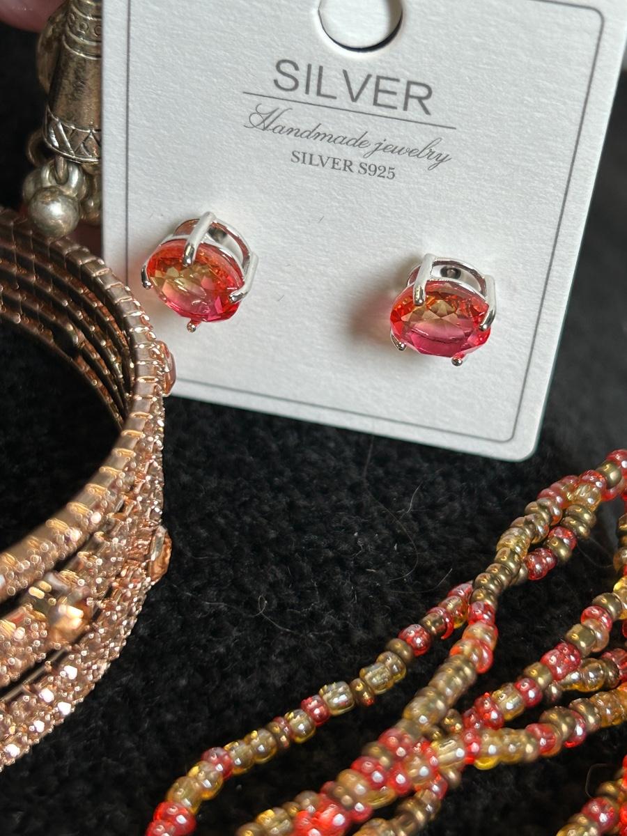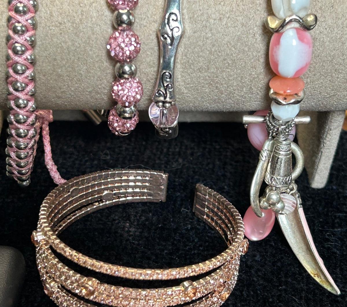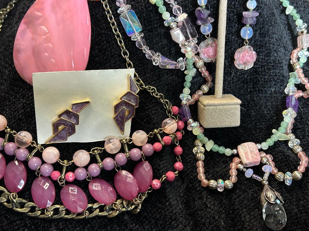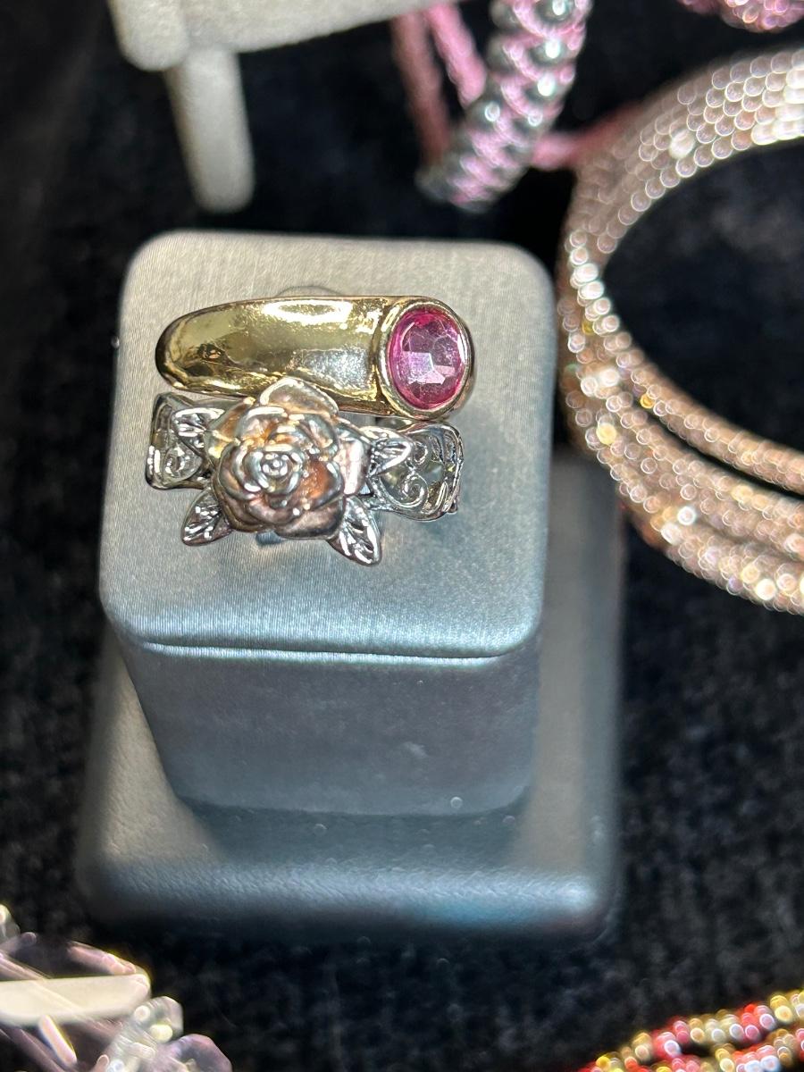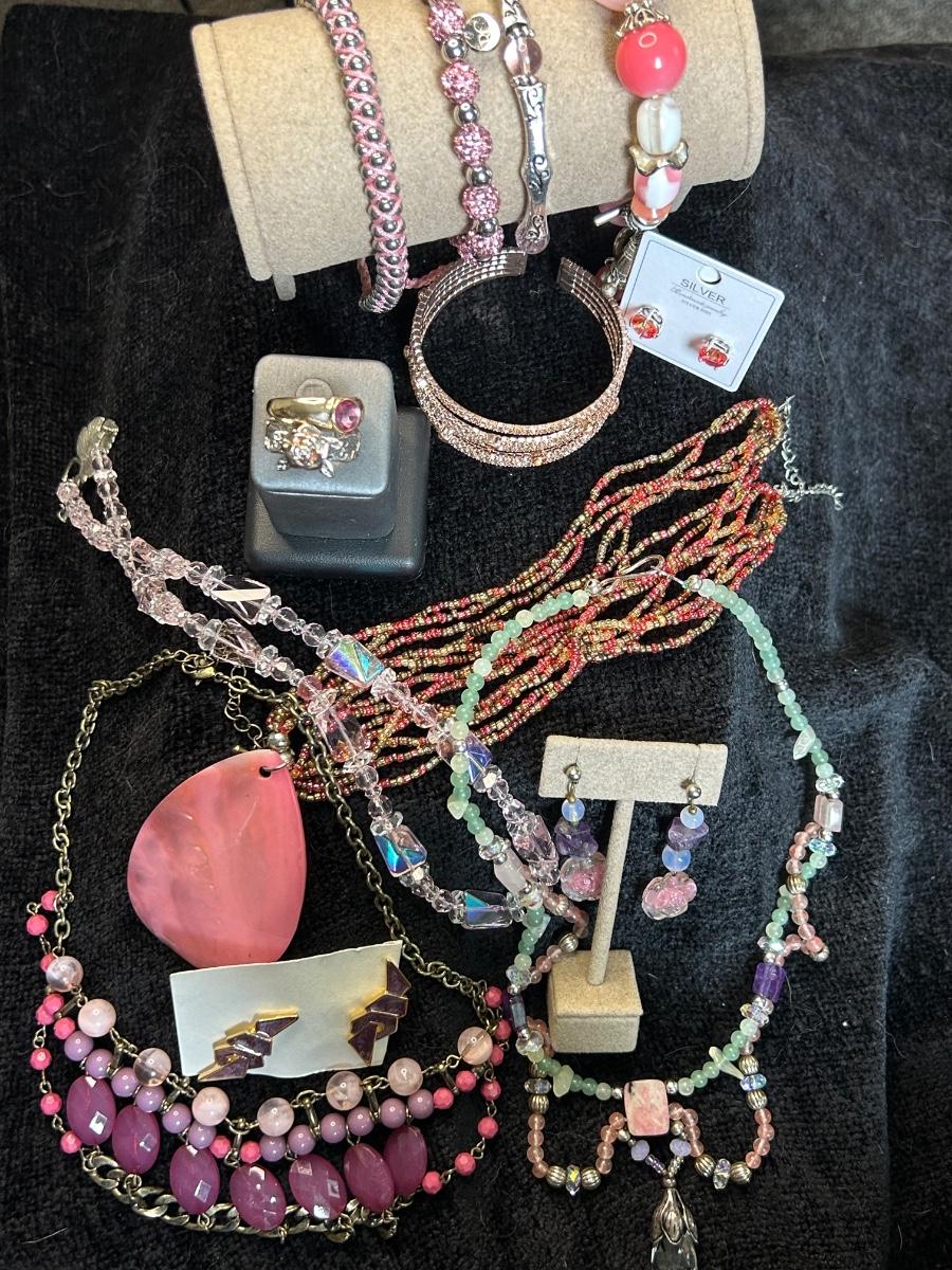 Five bracelets, three pair of earrings, four necklaces & 2 rings. Flower ring is a size 8 & the other is a 6.5.