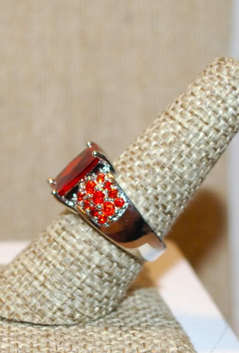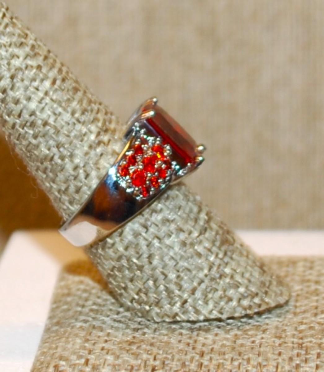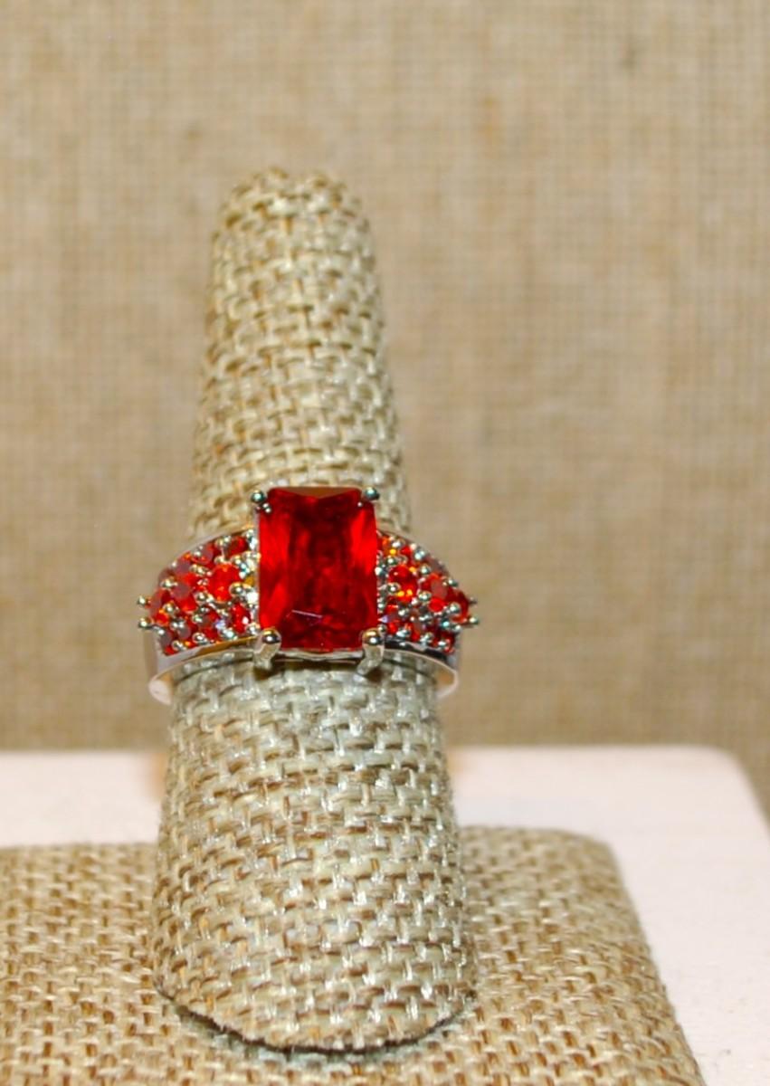 Size 8 Deep Red Emerald Cut Center Stone Ring and Red Accents Stone on a .925 Silver Band (6.8g)