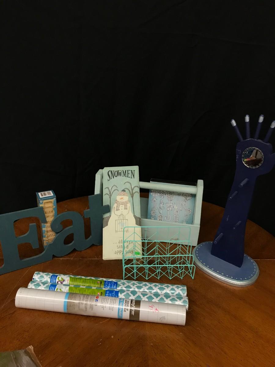 decor: all seeing hand jewelry holder, eat sign, shelf paper/contact paper, wire holder, wooden box, jenga, snowman decor;