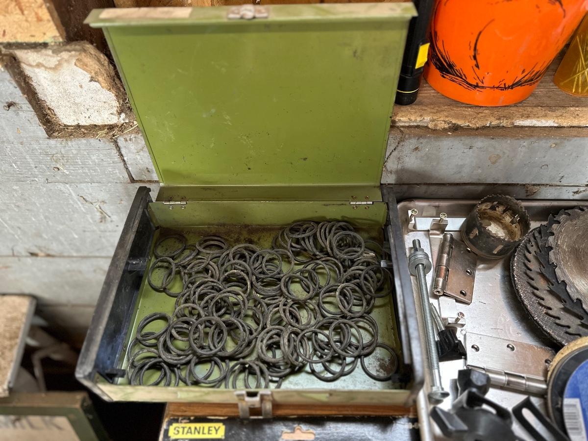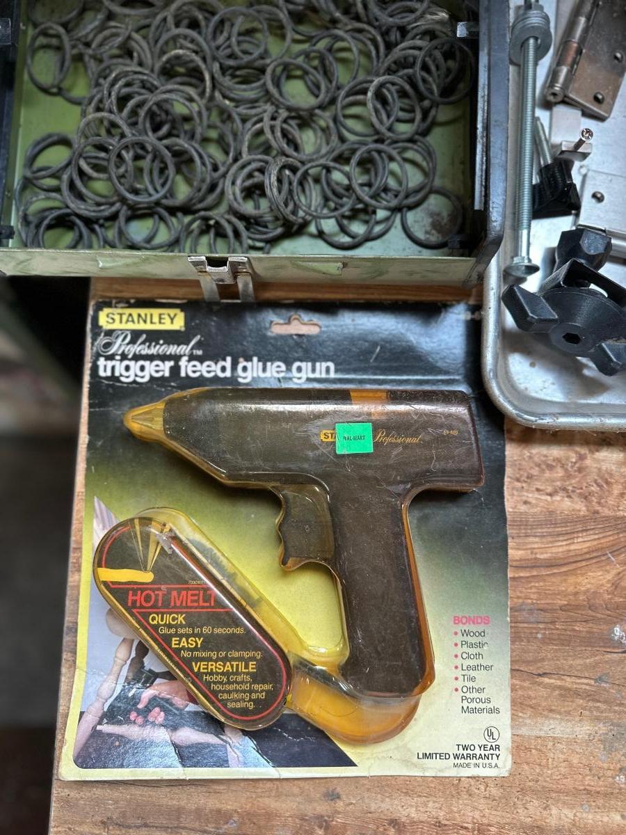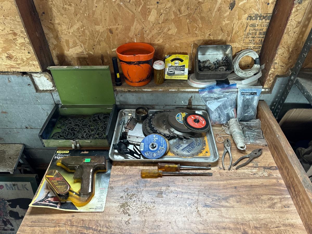 ALL SORTS OF GARAGE GOODIES INCLUDING A GLUE GUN, SAW BLADES, AN ASSORTMENT OF O-RINGS, HAND TOOLS AND MORE
