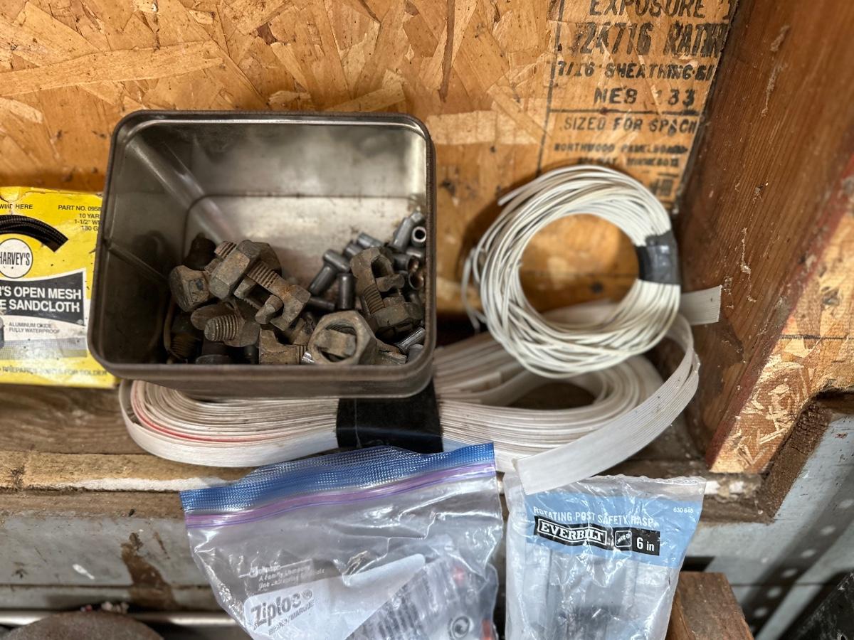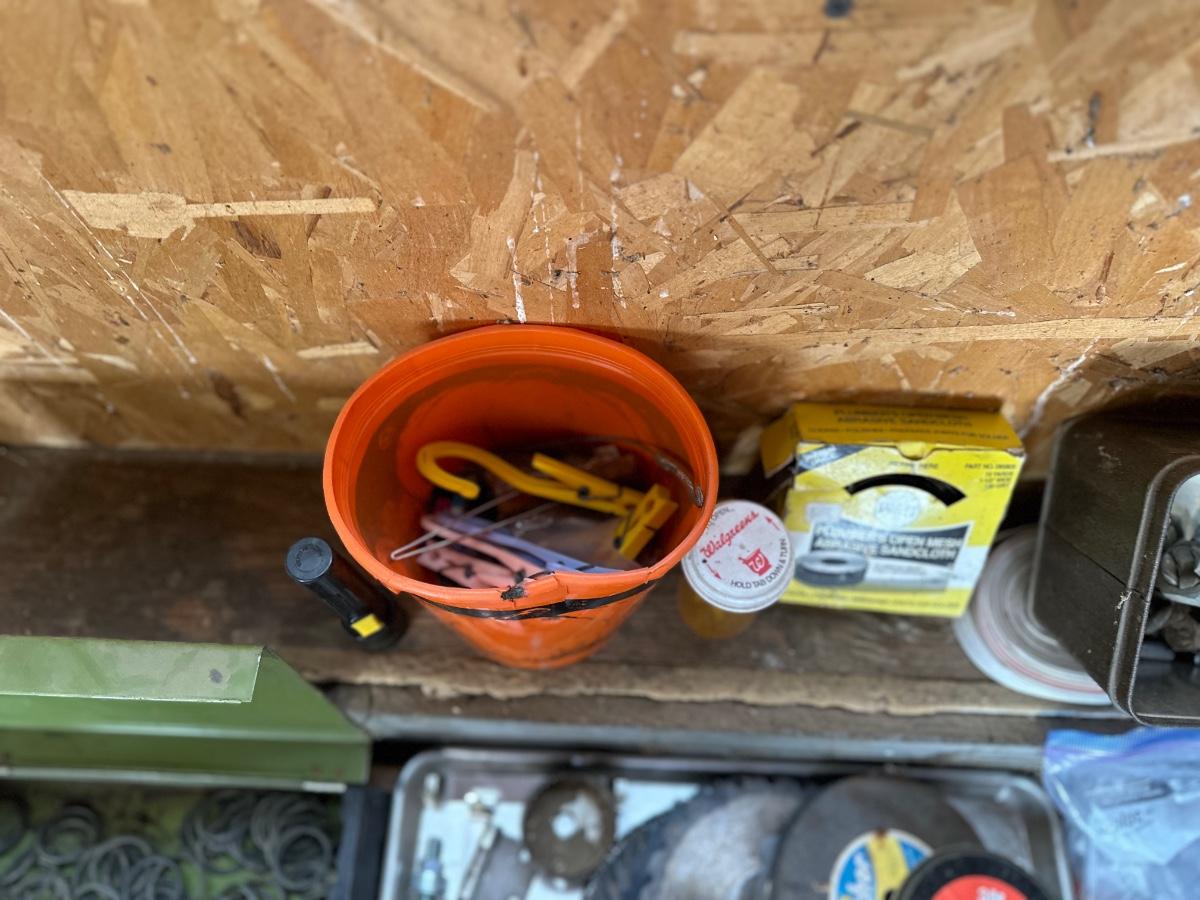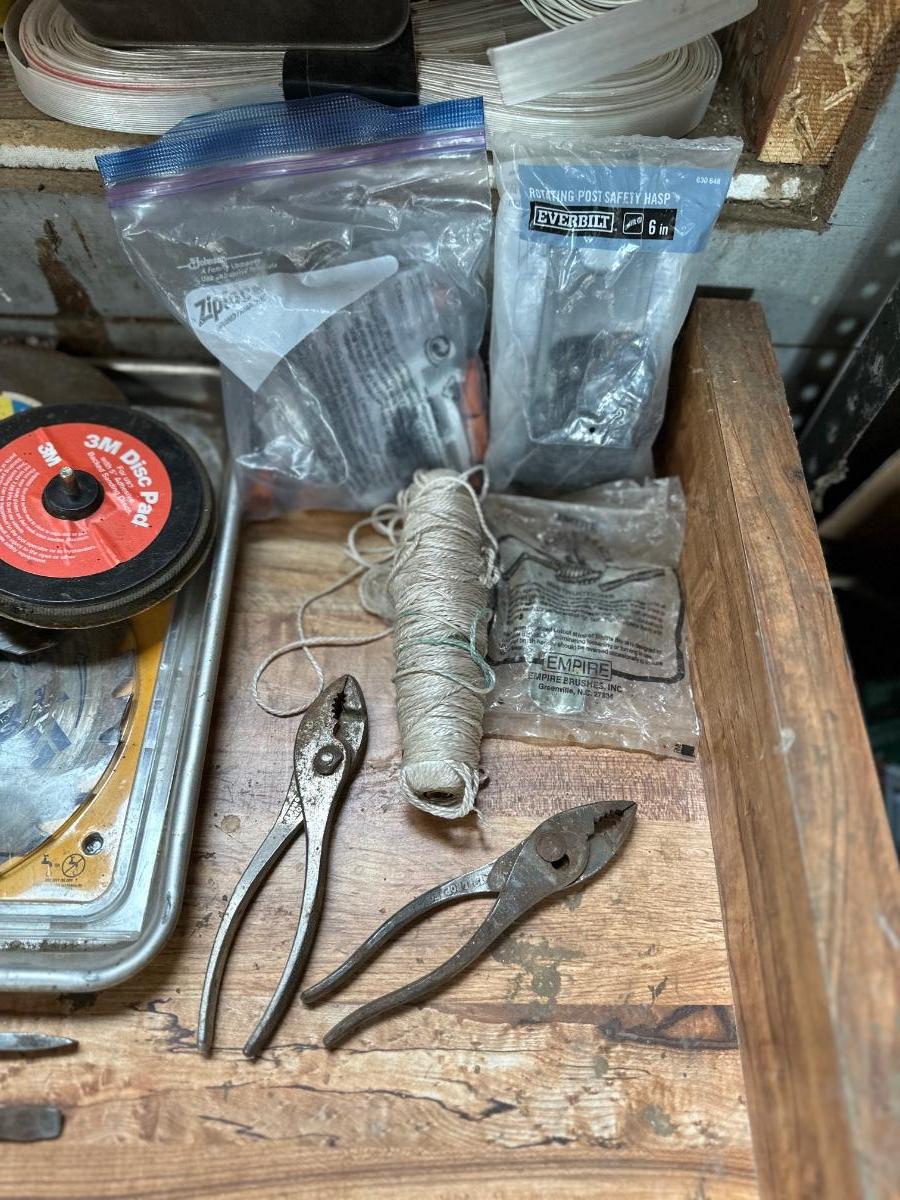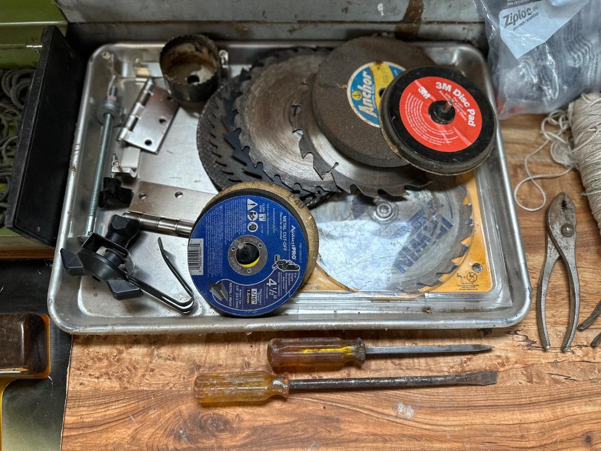 ALL SORTS OF GARAGE GOODIES INCLUDING A GLUE GUN, SAW BLADES, AN ASSORTMENT OF O-RINGS, HAND TOOLS AND MORE