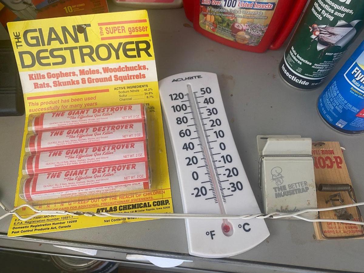 ALL SORTS OF GOOD STUFF FOR TAKING OUT BUGS AND RODENTS, EVEN AN ACCURITE THERMOMETER