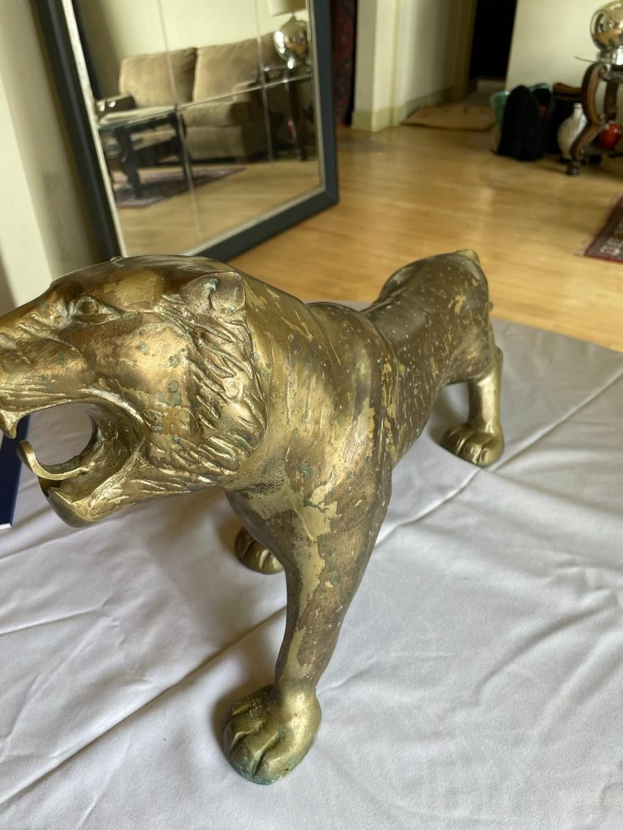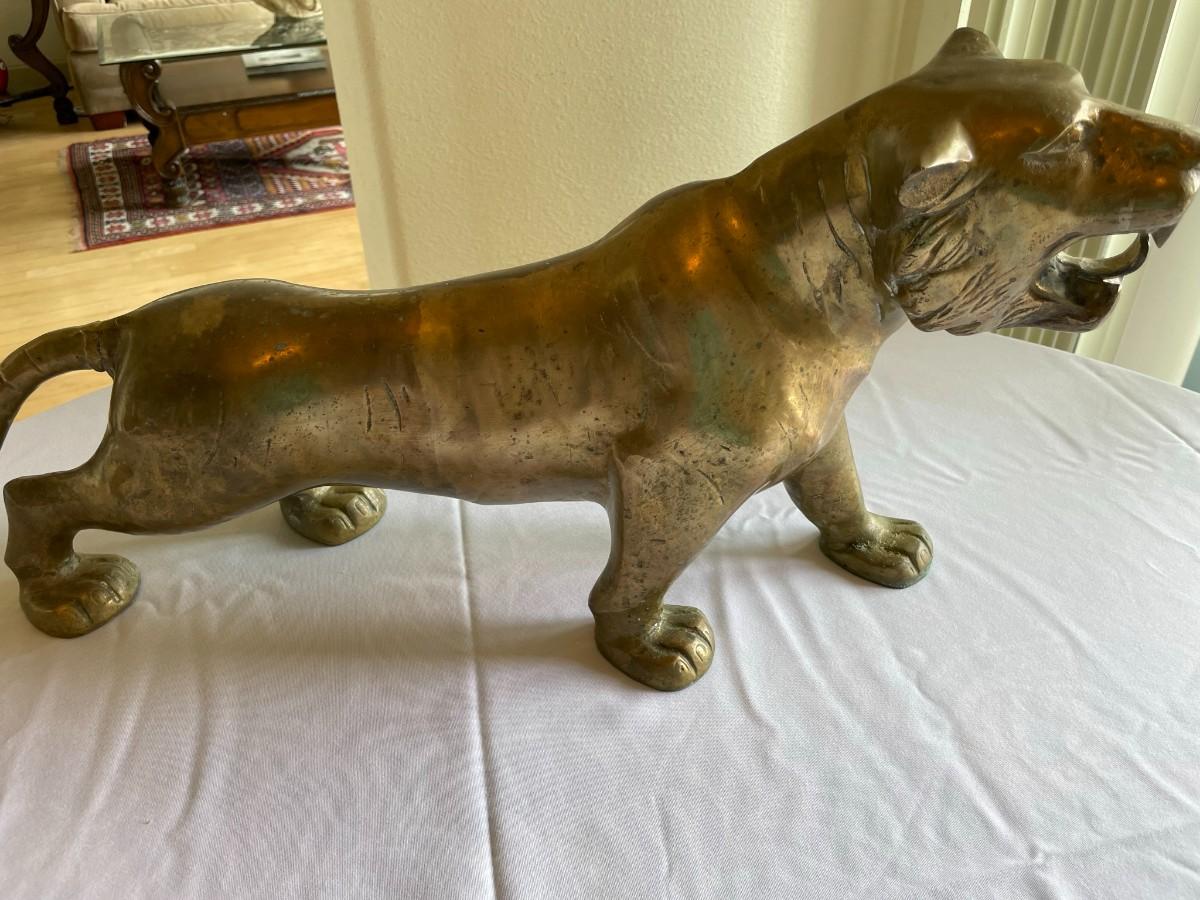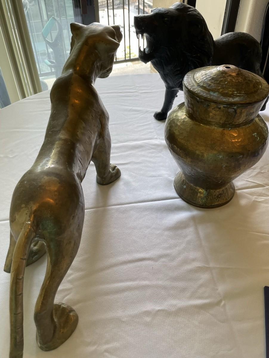 Brass Tiger - heavy - 26" L X 12" H, Brass Lion (has been painted) with a Broken Tail 16" L x 12" H, Brass Urn 10" H