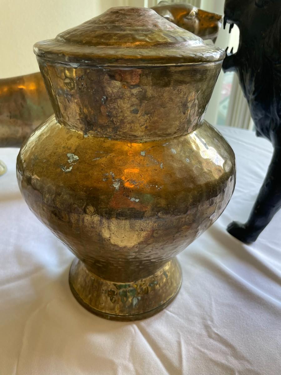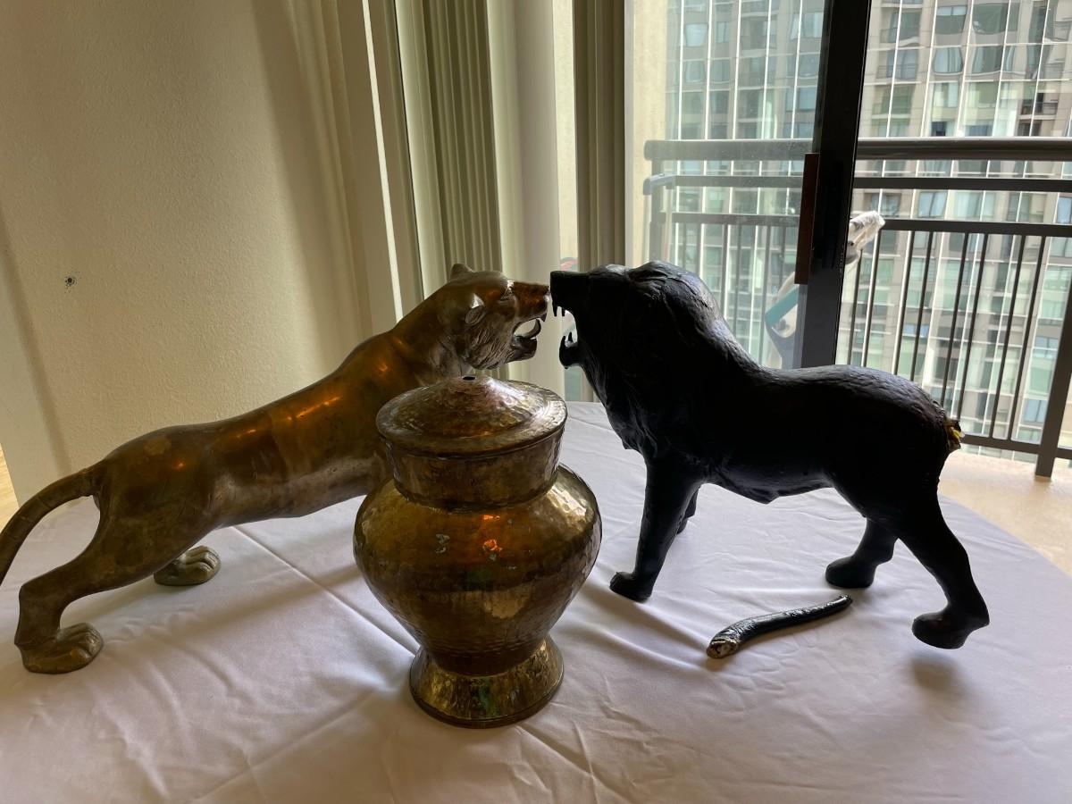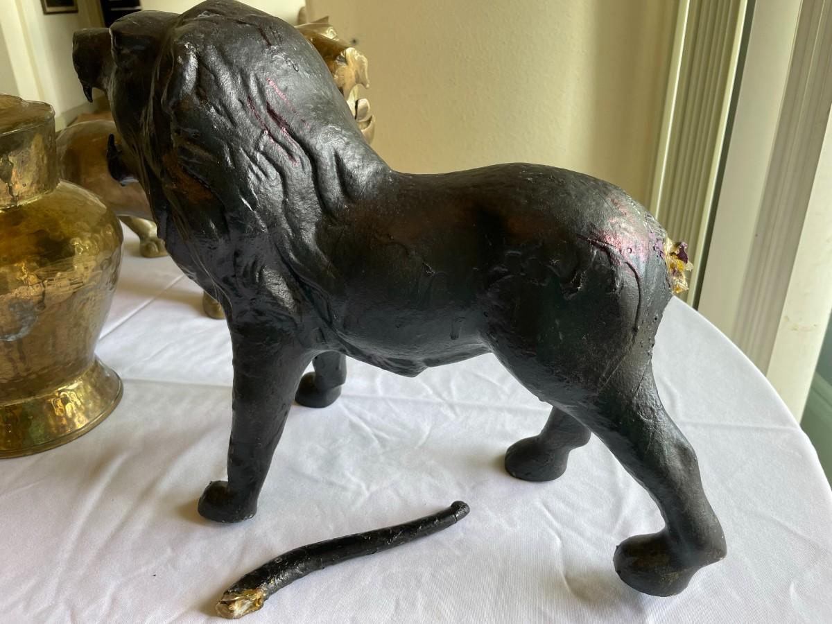 Brass Tiger - heavy - 26" L X 12" H, Brass Lion (has been painted) with a Broken Tail 16" L x 12" H, Brass Urn 10" H