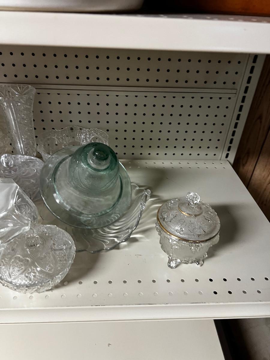 Bowls, Bells, Glass etc., Bring Boxes and Paper and This Lot is located in the Basement with Difficult Steep Stairs. BRING 2 ADULTS PLEASE. We can not help you bring these items ups the Stair.