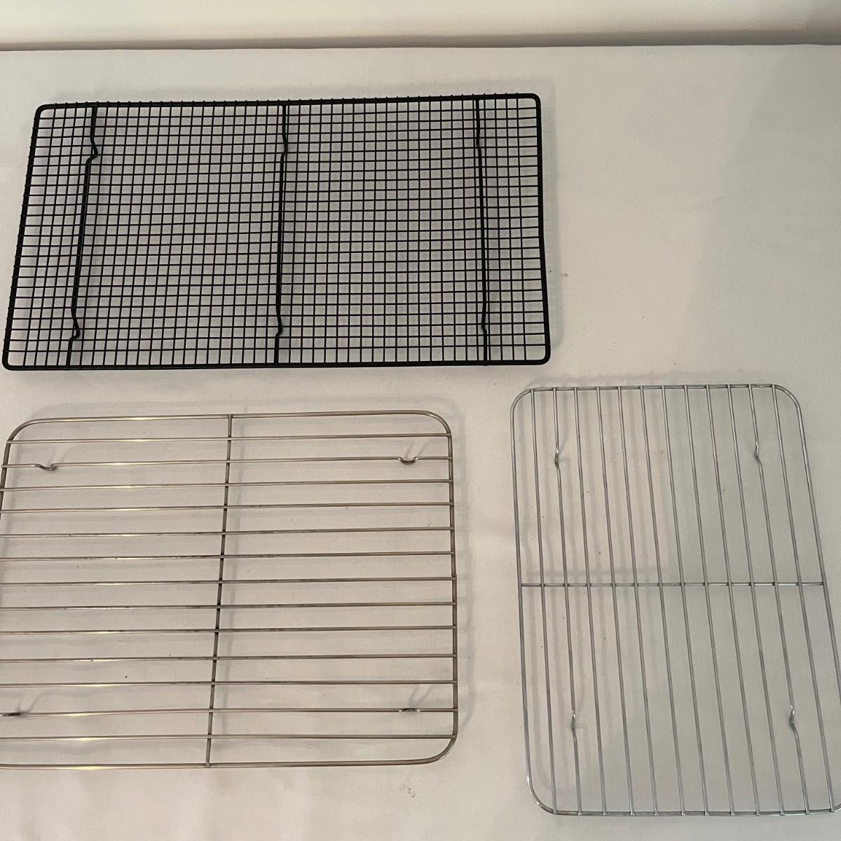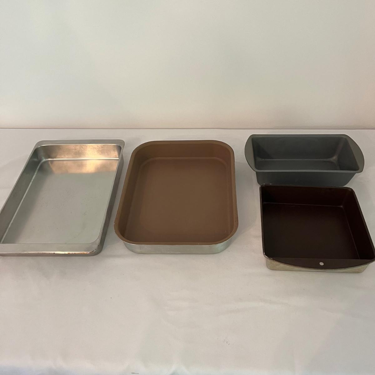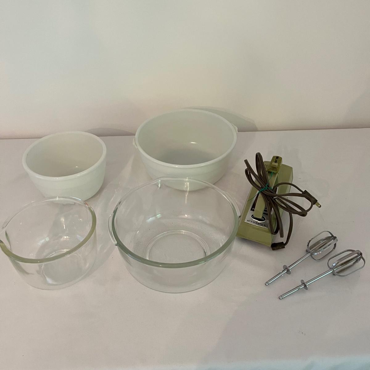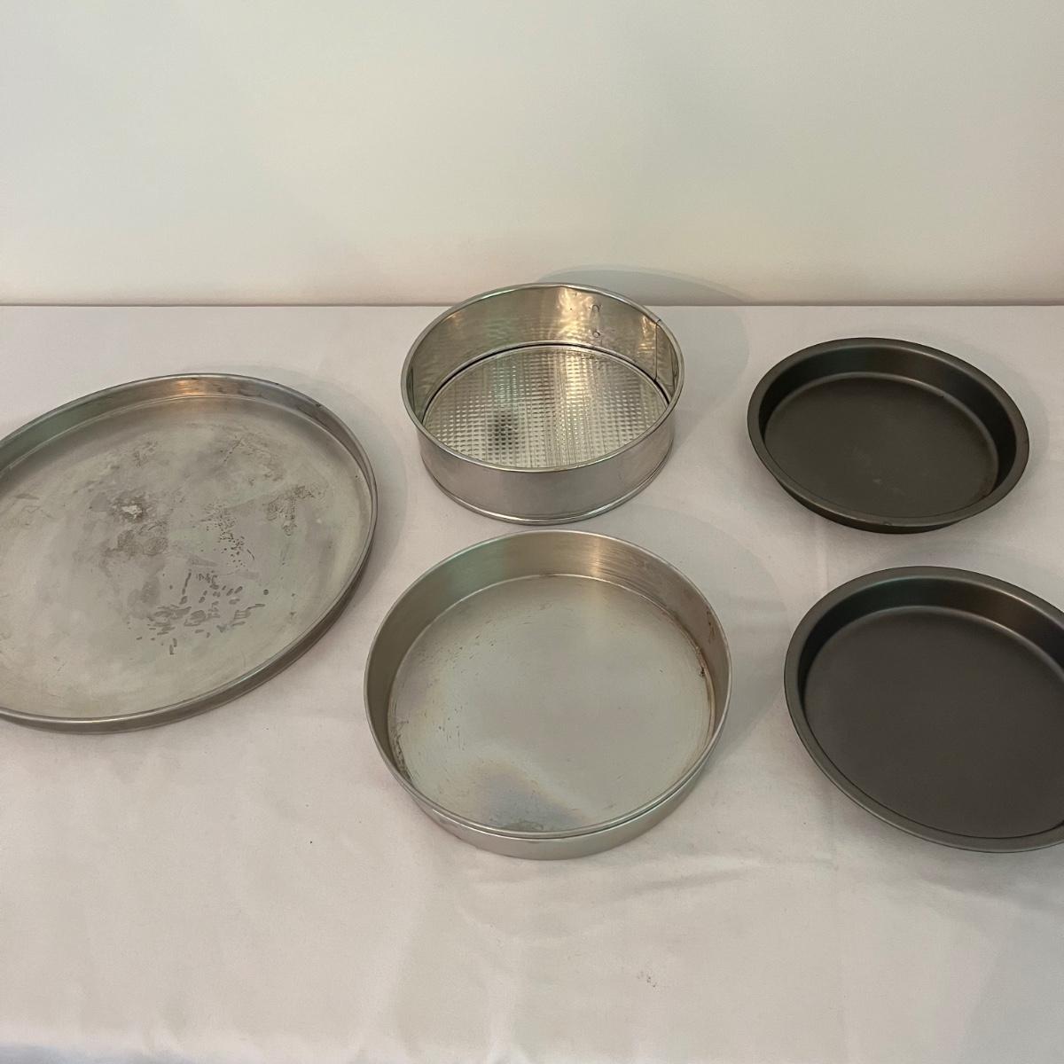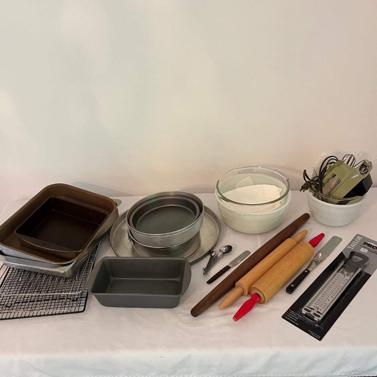 This lot includes baking pans, glass mixing bowls, an electric mixer, cooling racks, rolling pins, a baking thermometer, measuring spoons, and more. Some of the pans have scratches and wear on them (see photos). The mixer did not power on when plugged in. The largest pan measures about 14.5”D x 1.5”H and the mixer measures about 3.5” x 8” x 5”H. Shipping available.