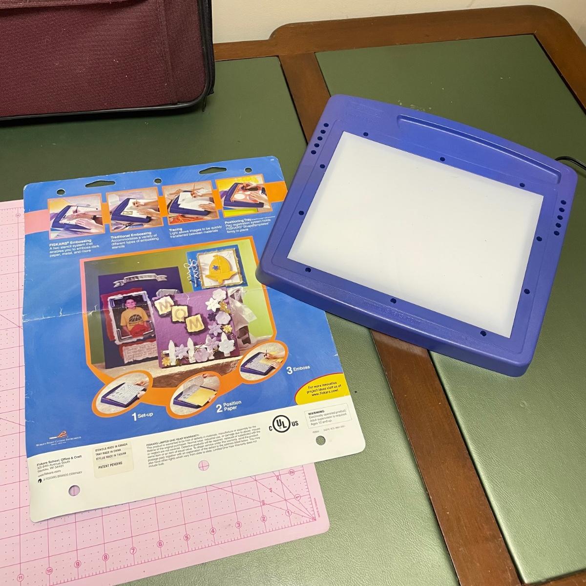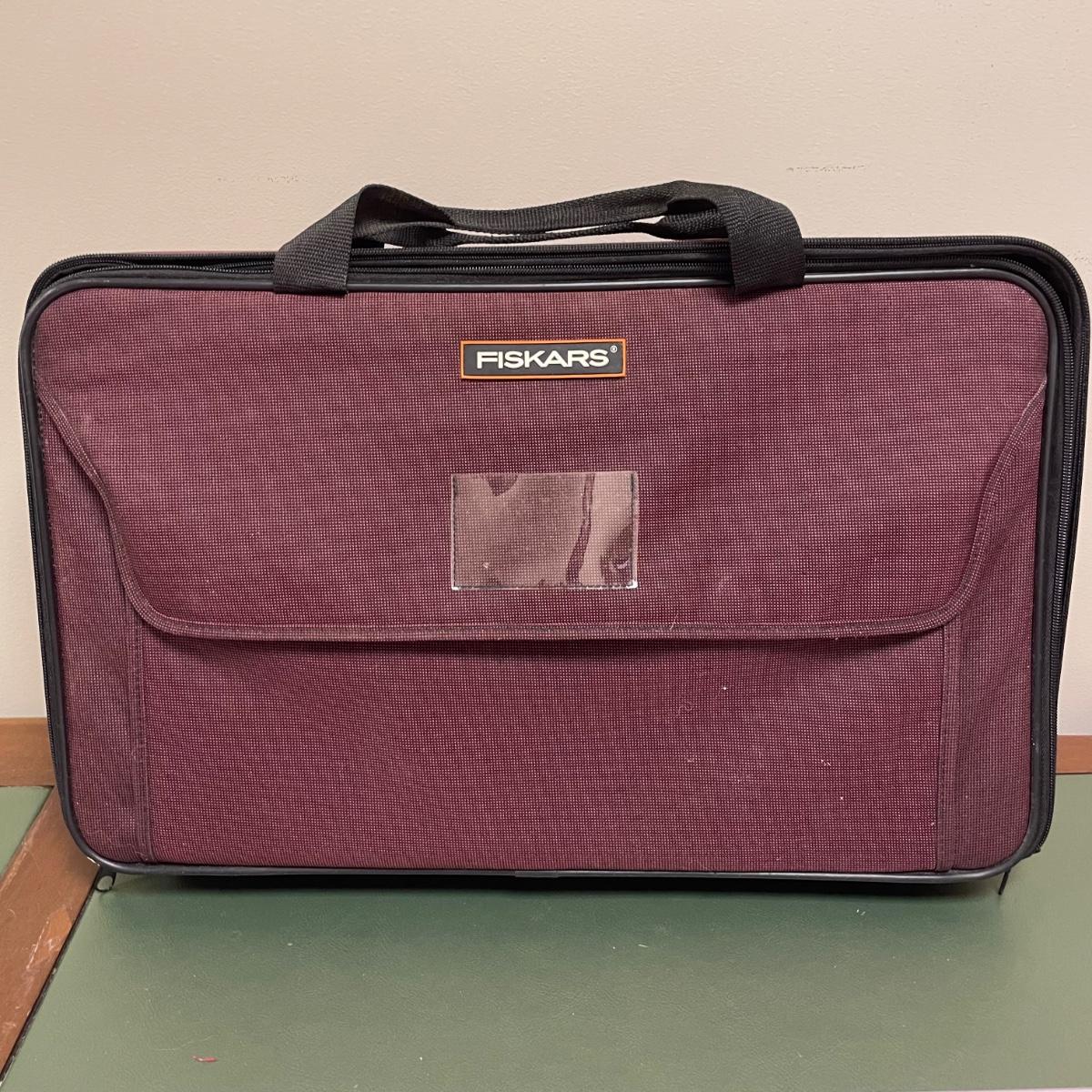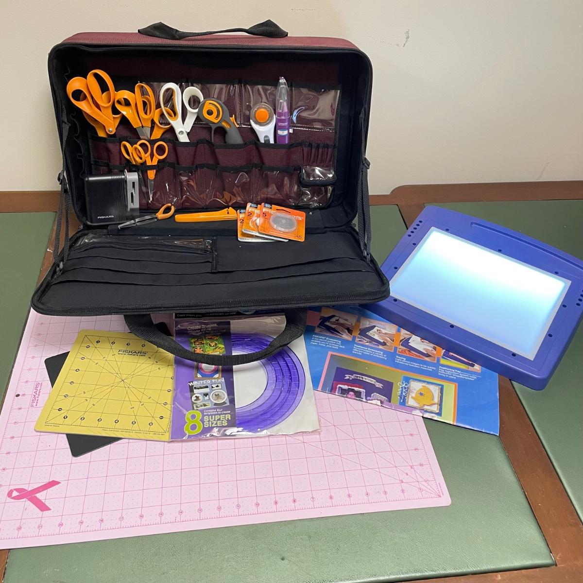 A lot for the Fiskar enthusiasts! Lot features a maroon crafting suitcase with removable organizer and plenty of pockets. Suitcase measures 22” x 13” x 5”H. Lot also includes scissors, rules, rotary blades, Light Boss light box and more. Lightbox turned on when plugged in. See images. Shipping available.