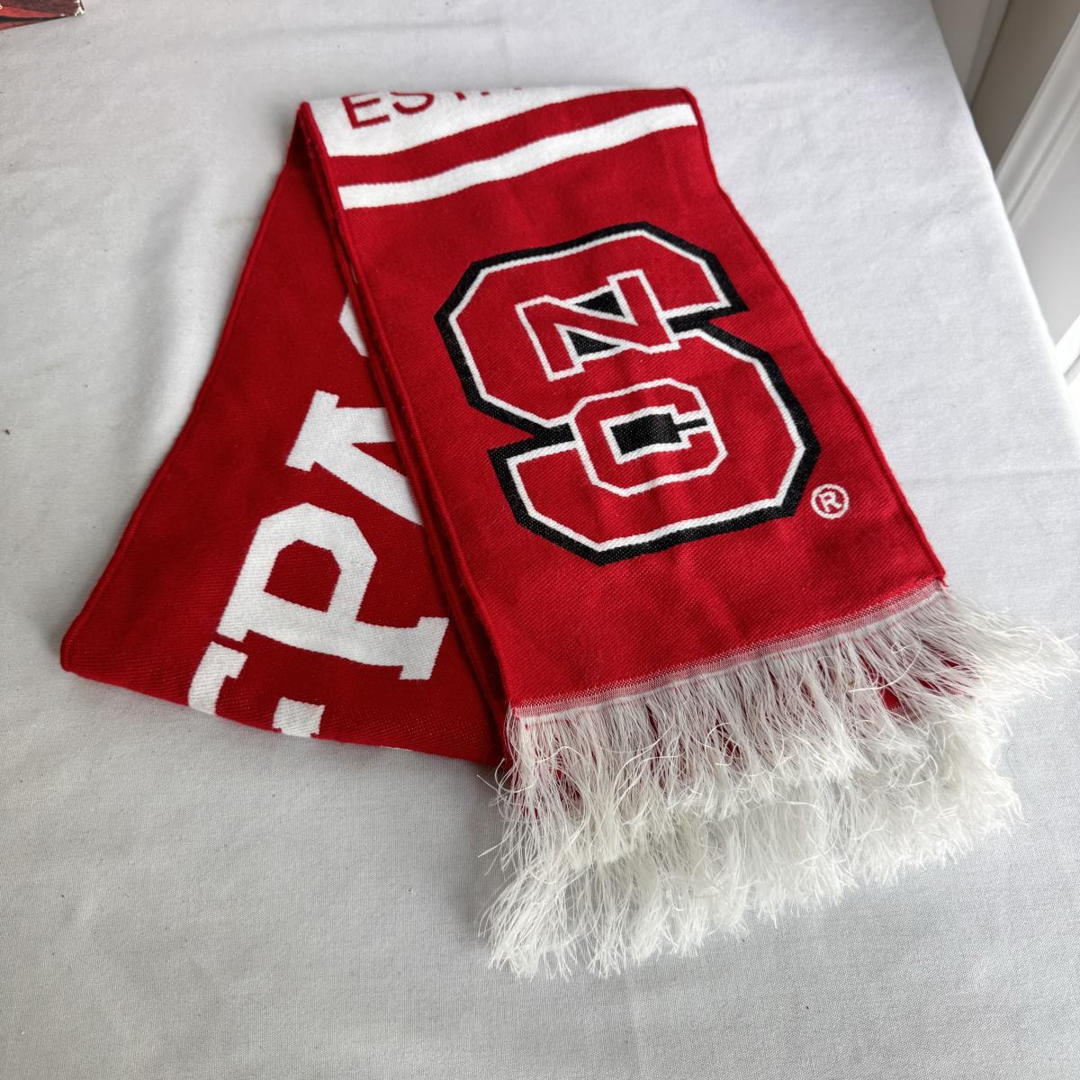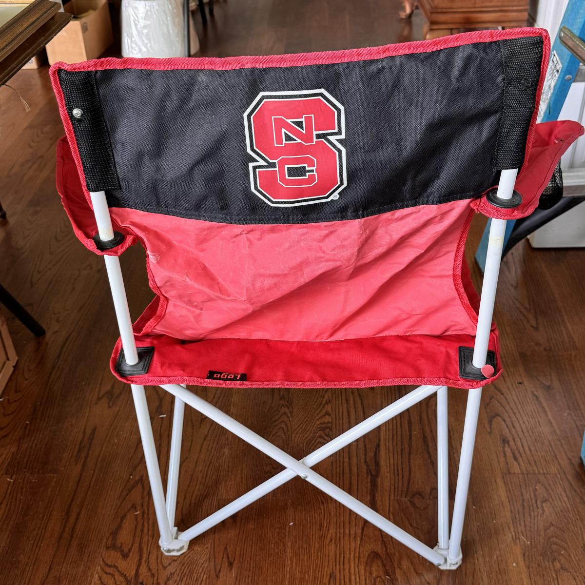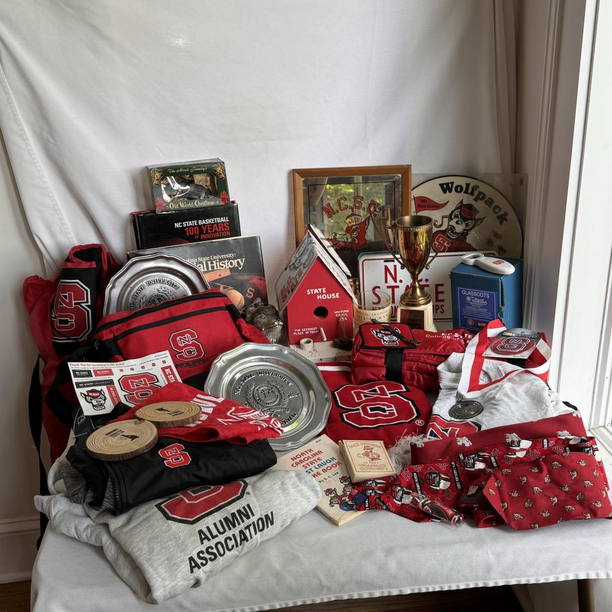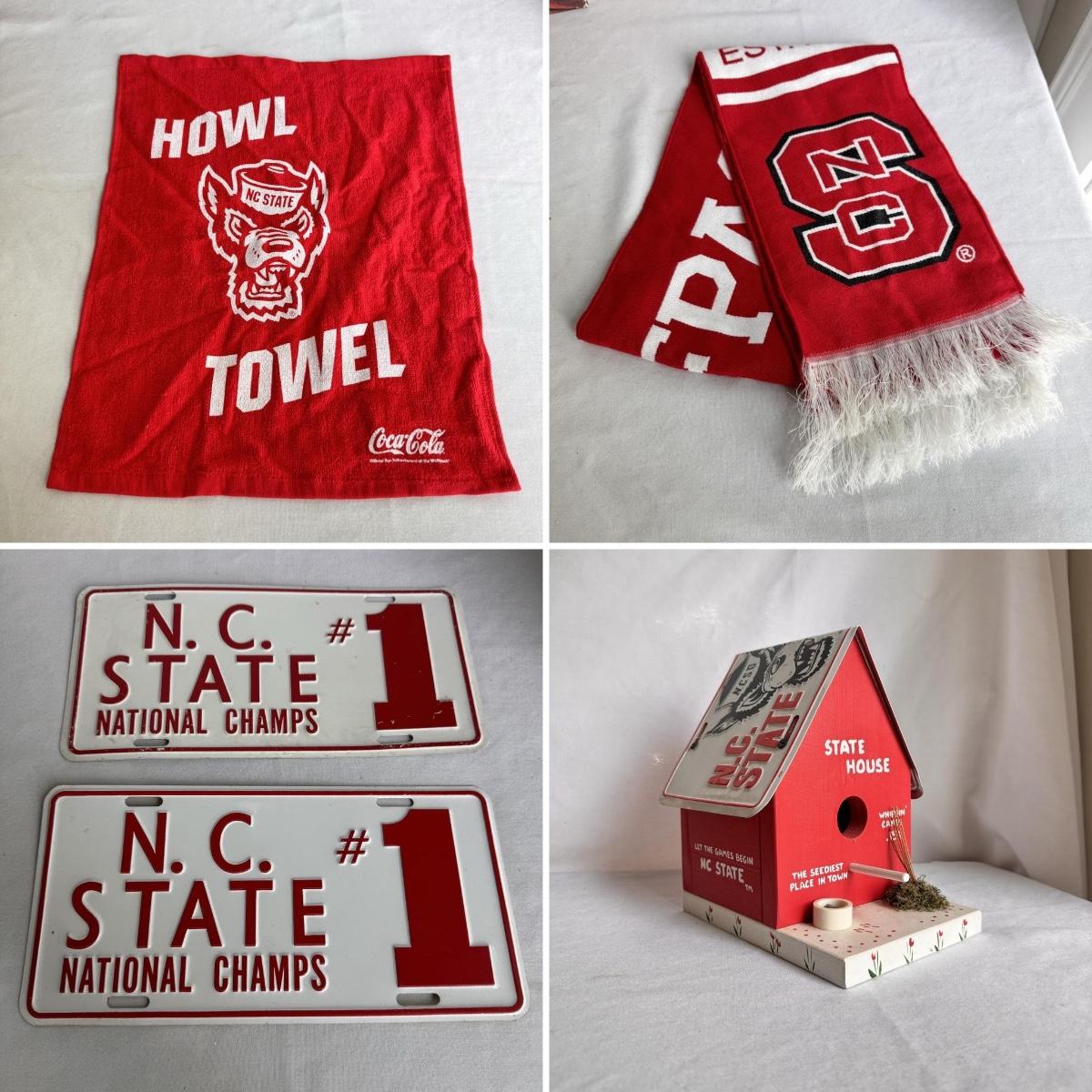 This lot includes several NC State themed items including one foldable chair, one outdoor blanket, two wooden coasters, one deck of cards, one small shoulder cooler, five books, one sweatshirt (size L) , one vest (size 1XB), one t shirt (size L), three ties, one Howl towel, one bottle opener, one pin, one medal, one scarf, two silver plates, two license plates, one decorative mirror and clock, one bird house, and much more. The shoulder cooler measures 12” x 10” x 7”H. The chair has some worn pieces - see pictures included.