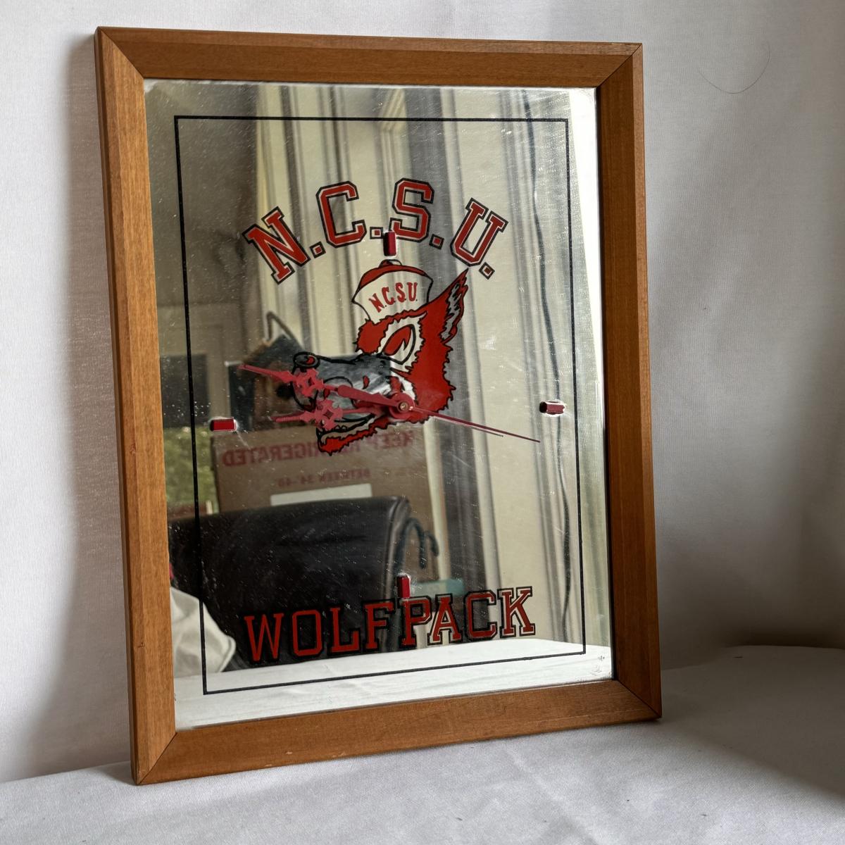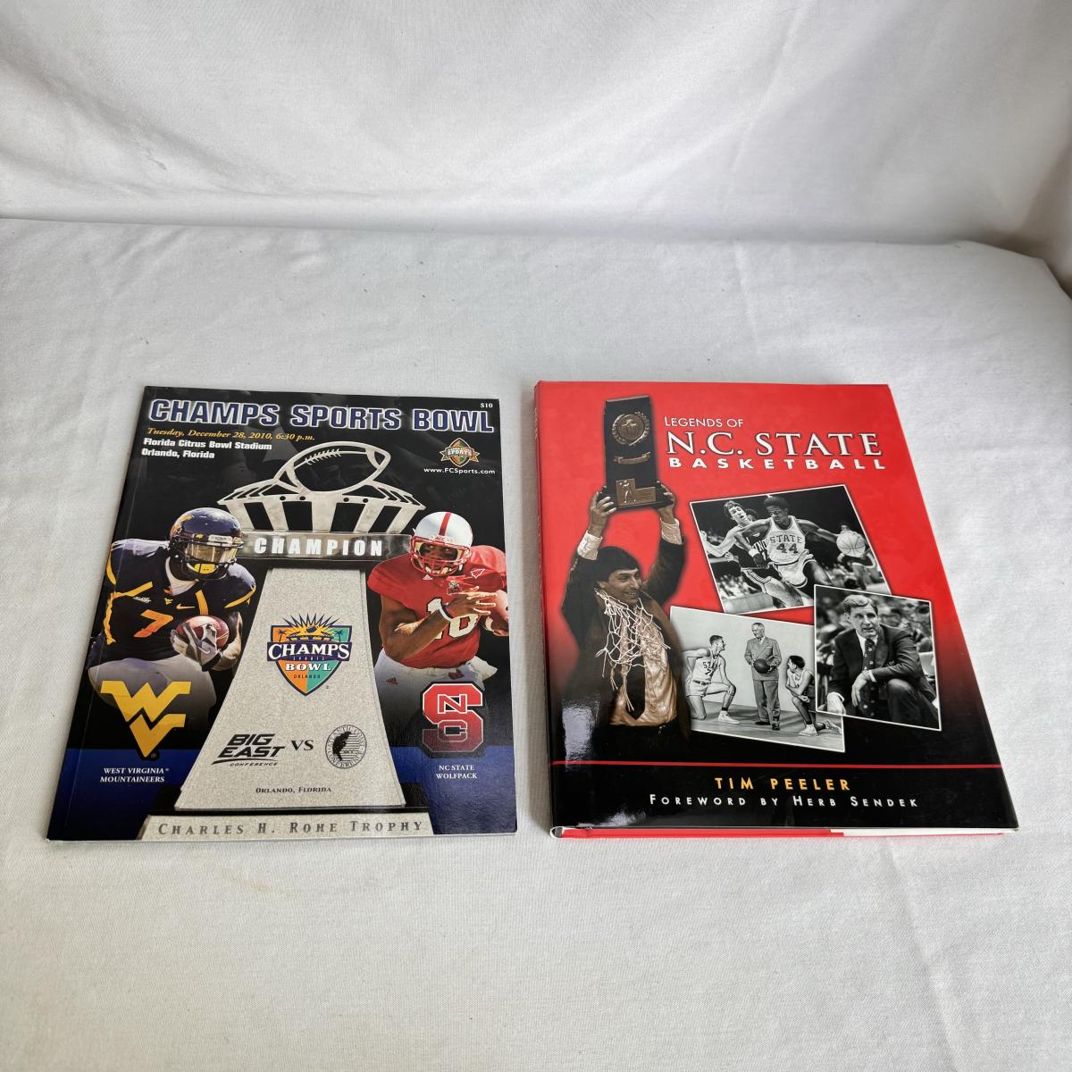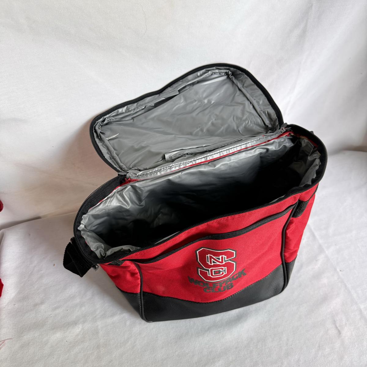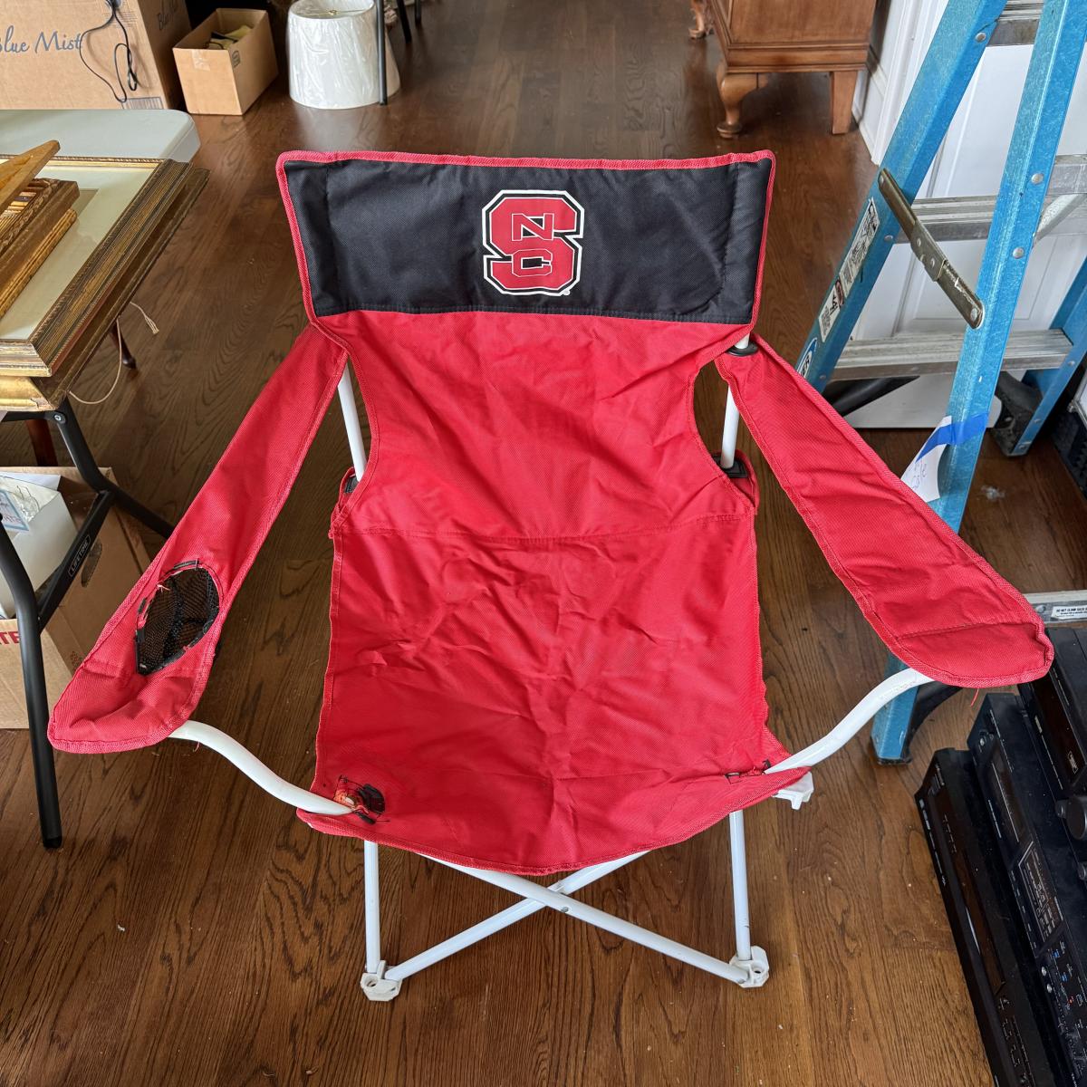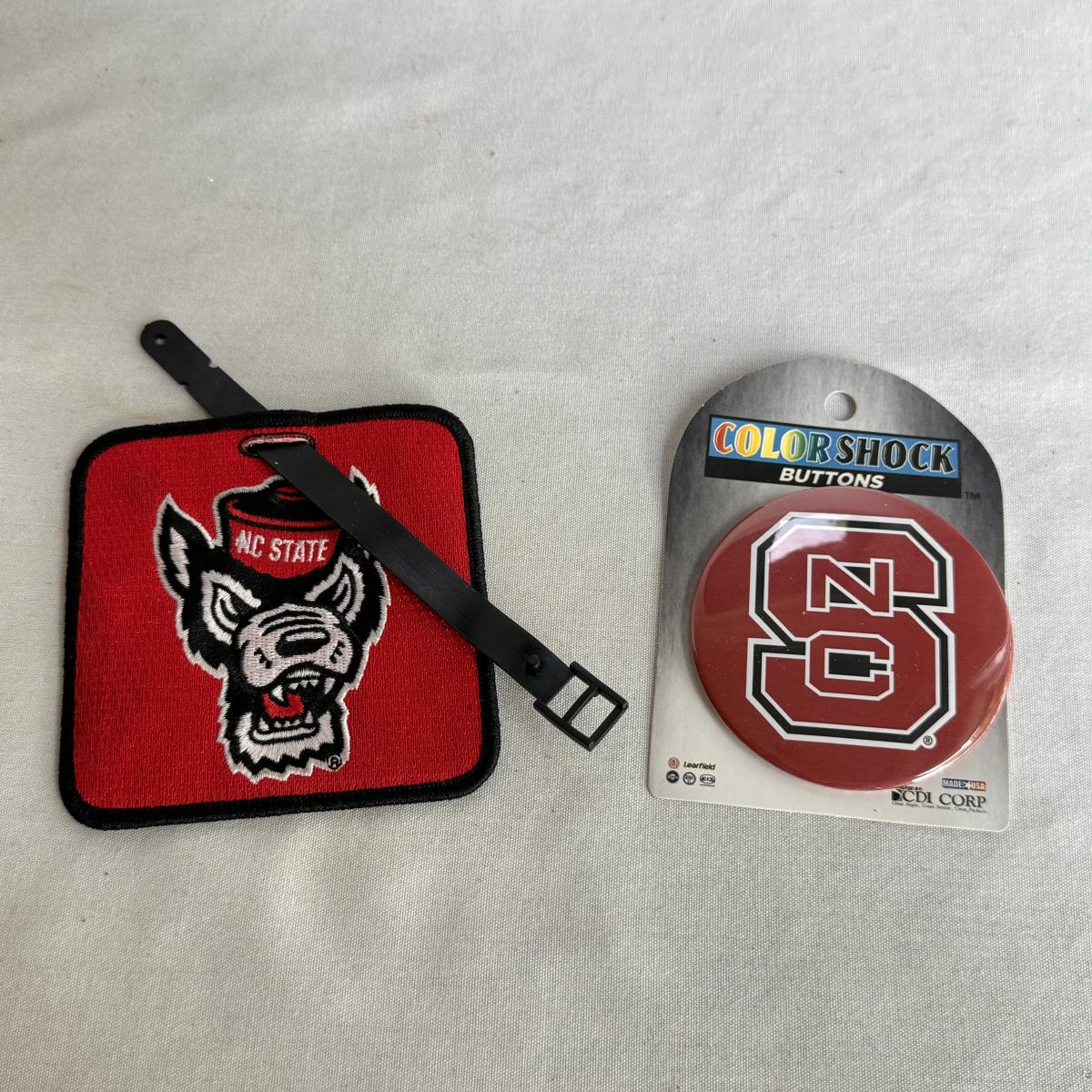 This lot includes several NC State themed items including one foldable chair, one outdoor blanket, two wooden coasters, one deck of cards, one small shoulder cooler, five books, one sweatshirt (size L) , one vest (size 1XB), one t shirt (size L), three ties, one Howl towel, one bottle opener, one pin, one medal, one scarf, two silver plates, two license plates, one decorative mirror and clock, one bird house, and much more. The shoulder cooler measures 12” x 10” x 7”H. The chair has some worn pieces - see pictures included.