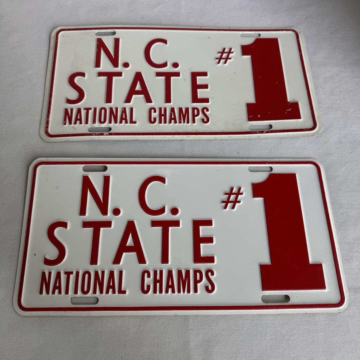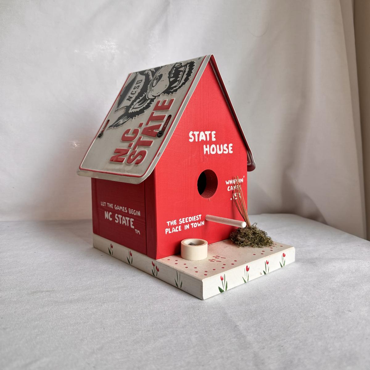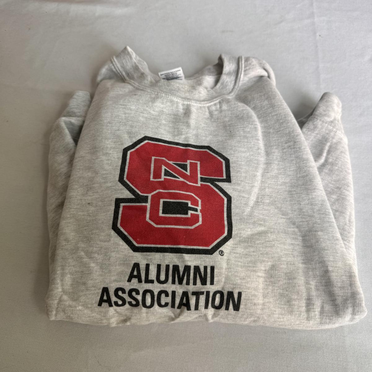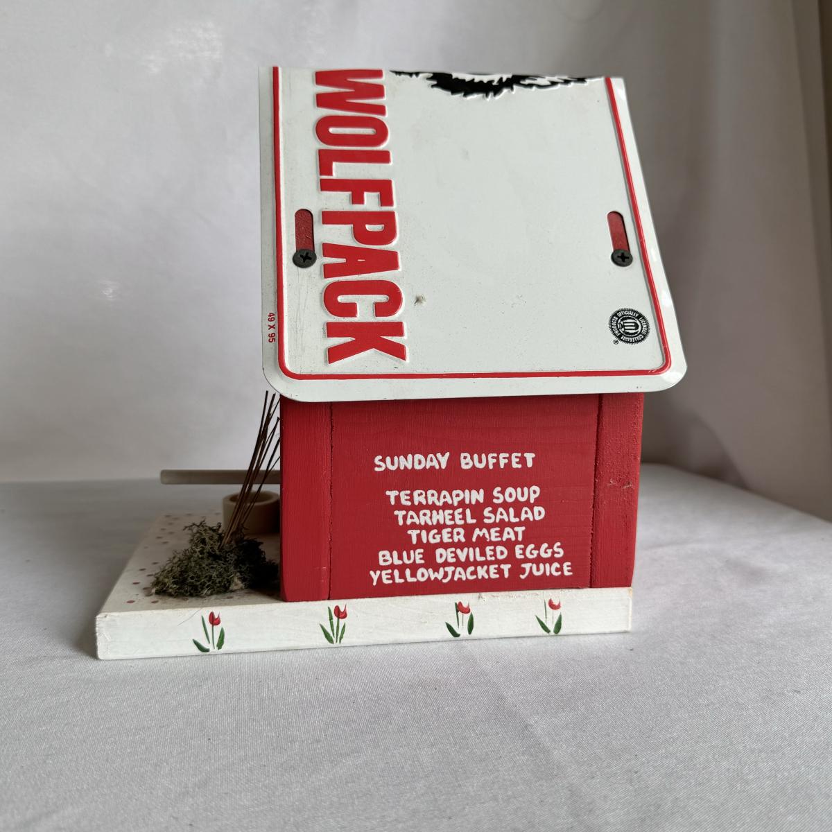 This lot includes several NC State themed items including one foldable chair, one outdoor blanket, two wooden coasters, one deck of cards, one small shoulder cooler, five books, one sweatshirt (size L) , one vest (size 1XB), one t shirt (size L), three ties, one Howl towel, one bottle opener, one pin, one medal, one scarf, two silver plates, two license plates, one decorative mirror and clock, one bird house, and much more. The shoulder cooler measures 12” x 10” x 7”H. The chair has some worn pieces - see pictures included.