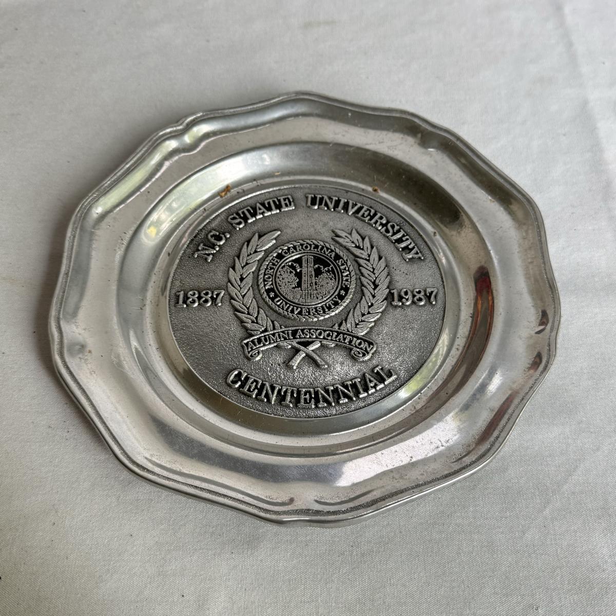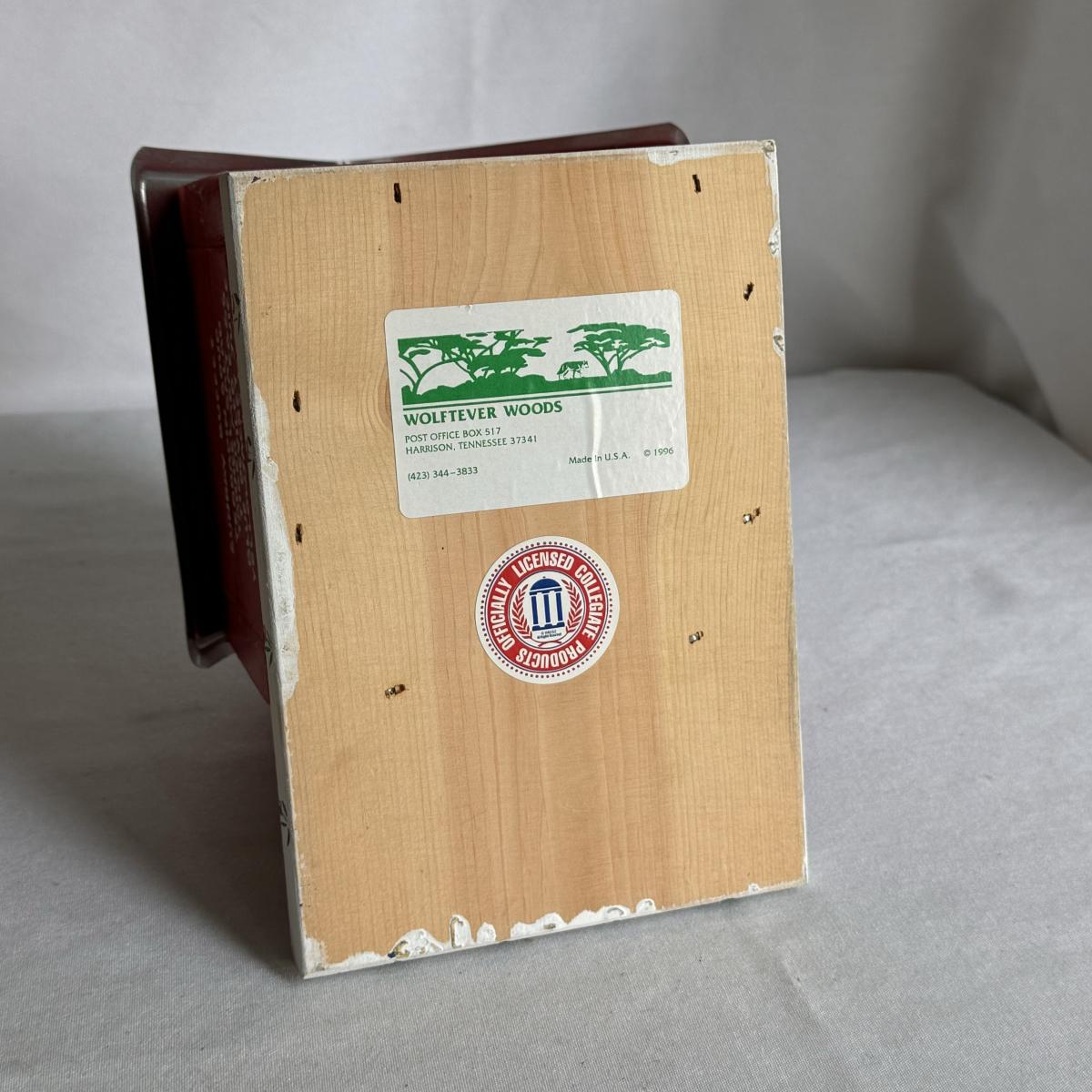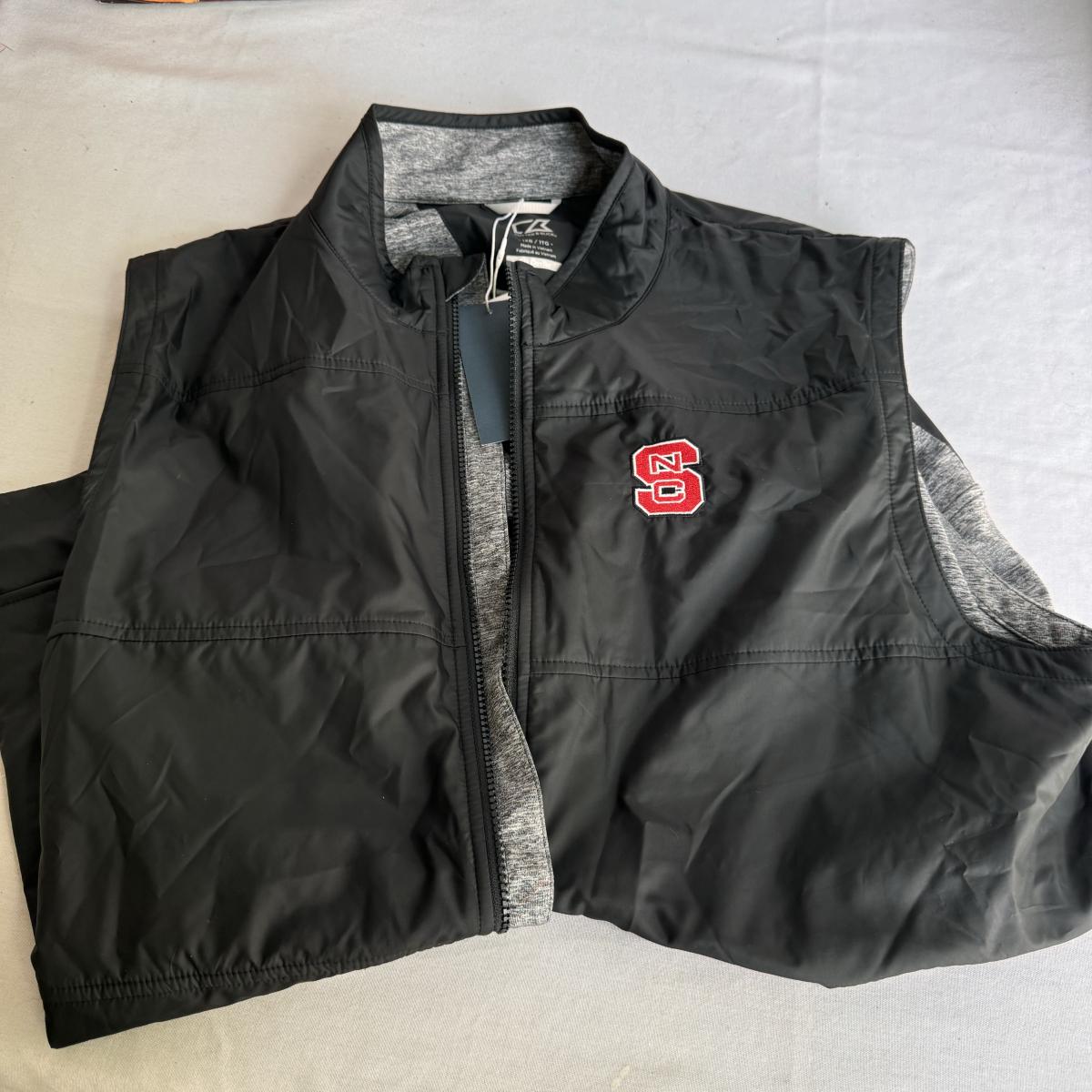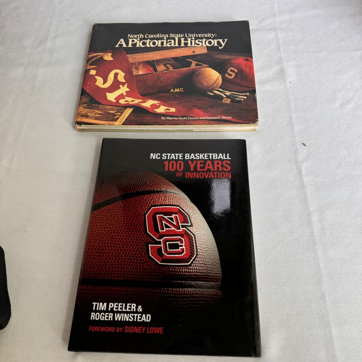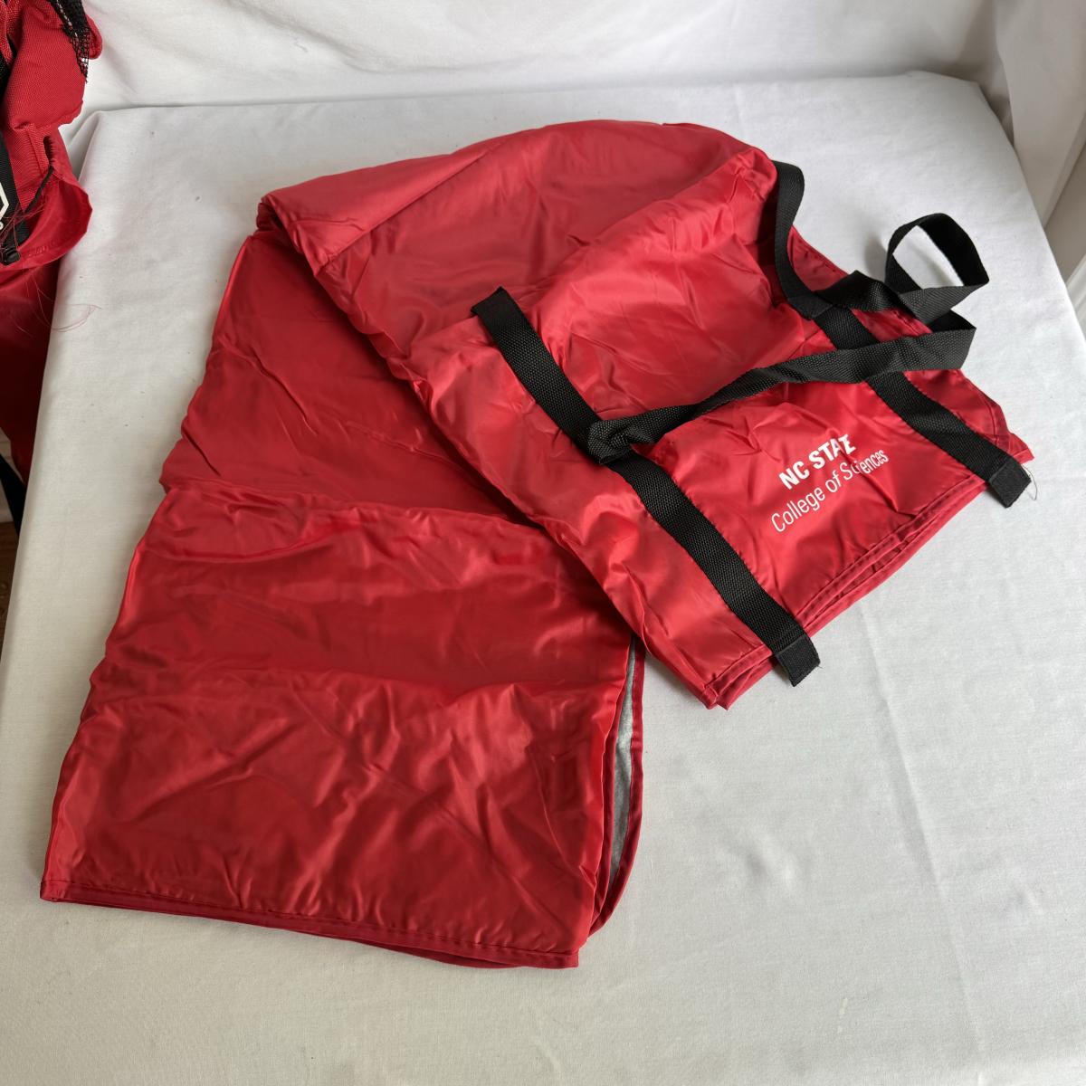 This lot includes several NC State themed items including one foldable chair, one outdoor blanket, two wooden coasters, one deck of cards, one small shoulder cooler, five books, one sweatshirt (size L) , one vest (size 1XB), one t shirt (size L), three ties, one Howl towel, one bottle opener, one pin, one medal, one scarf, two silver plates, two license plates, one decorative mirror and clock, one bird house, and much more. The shoulder cooler measures 12” x 10” x 7”H. The chair has some worn pieces - see pictures included.