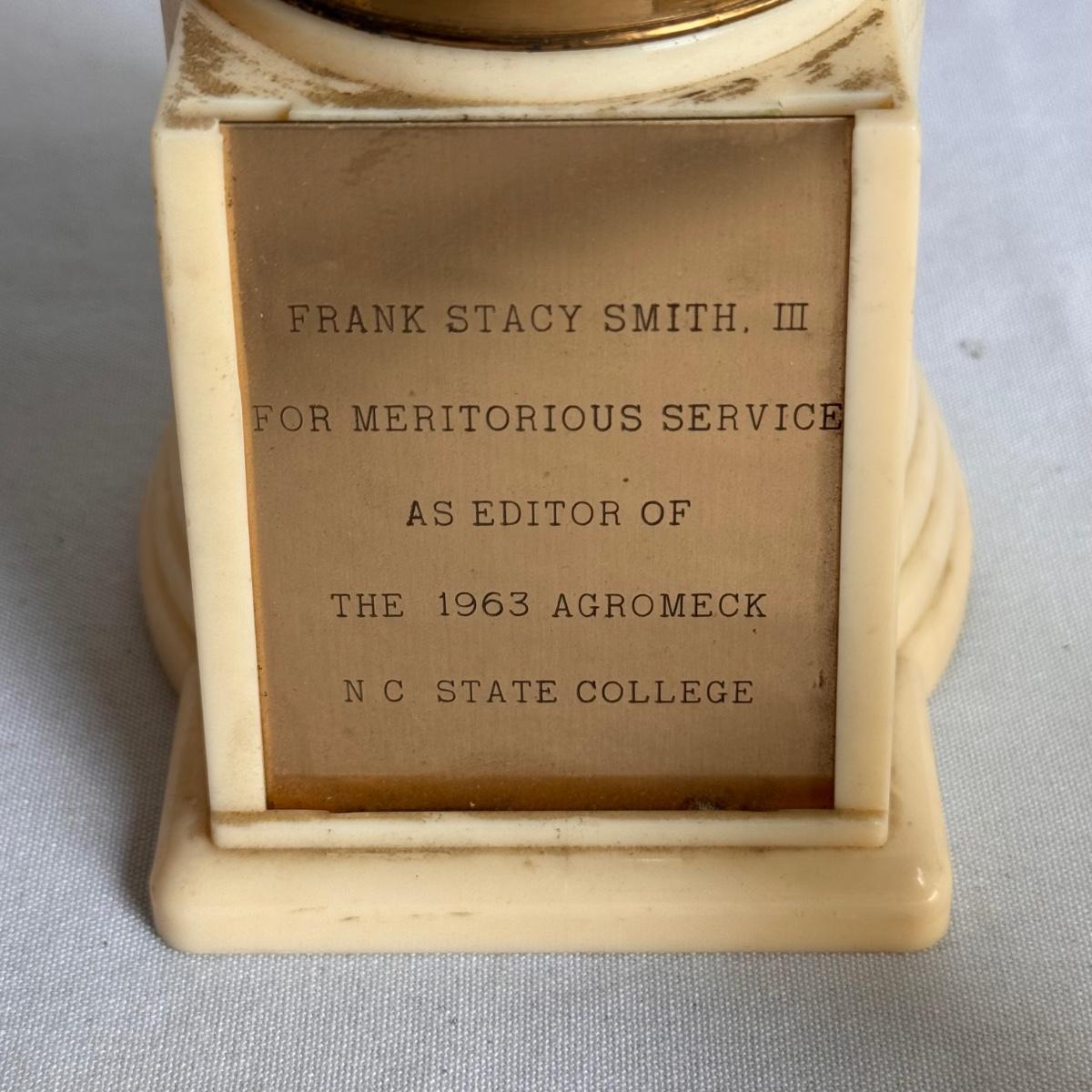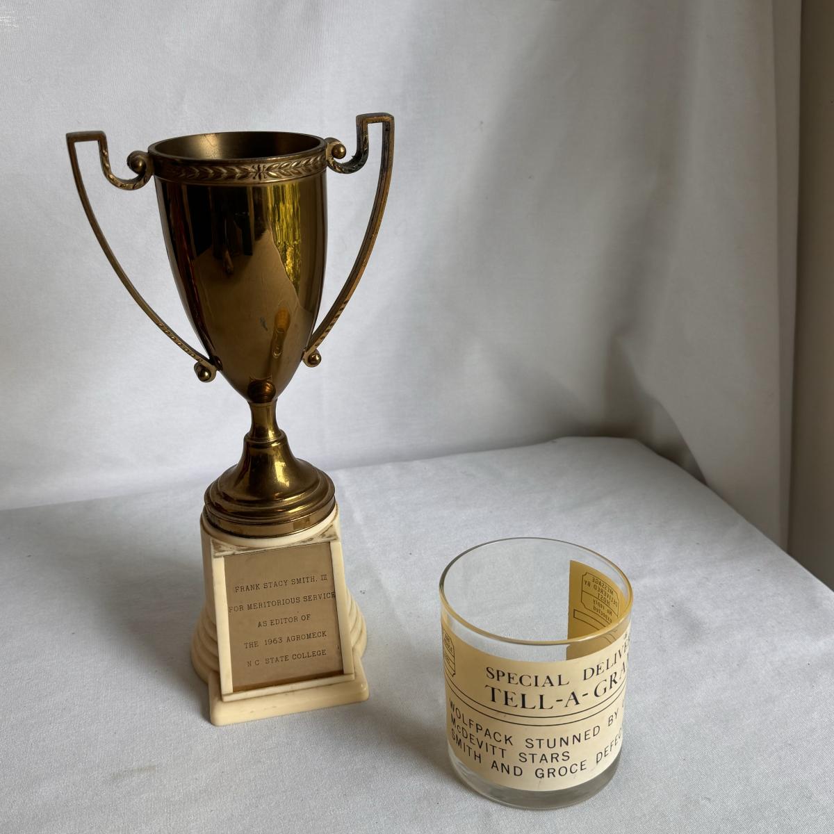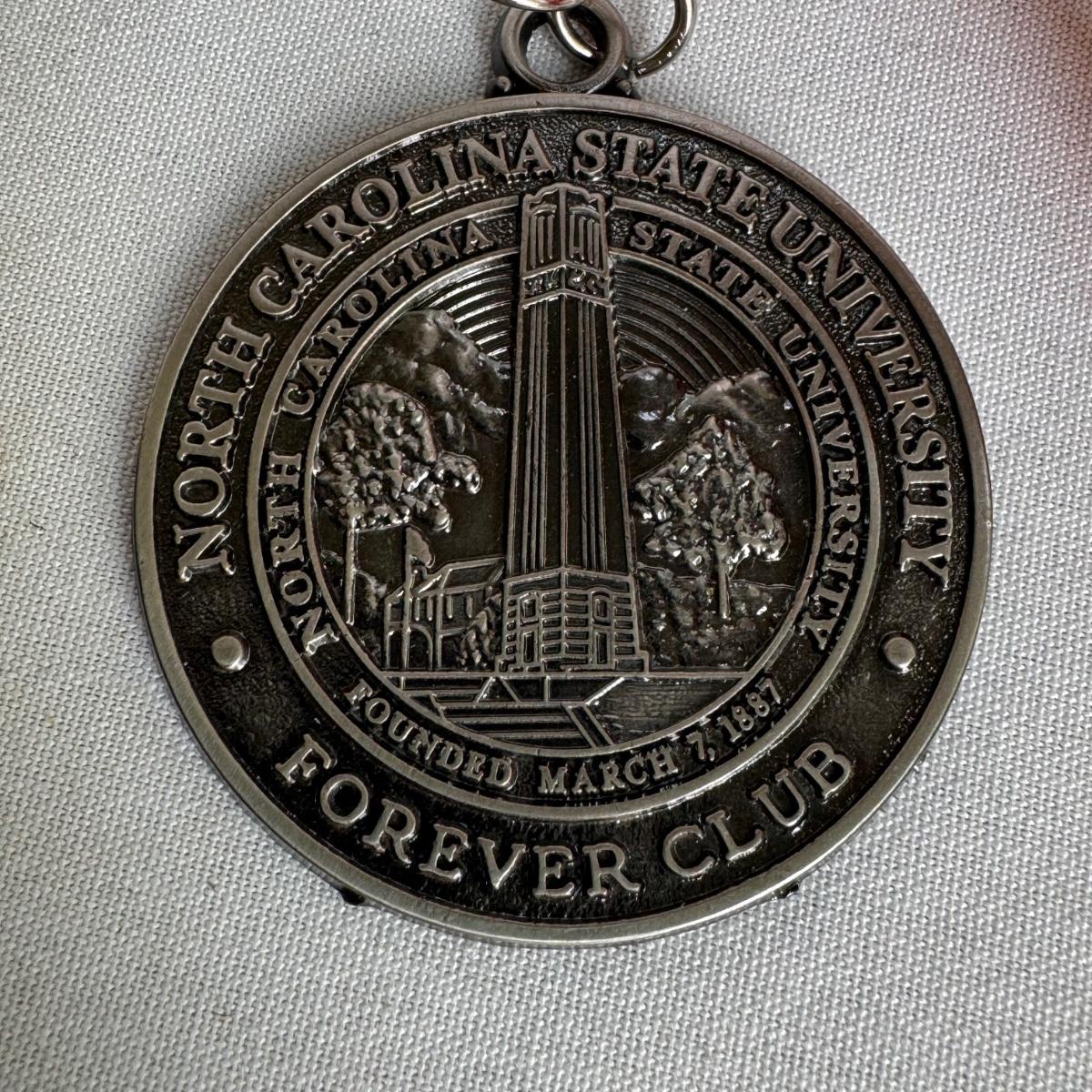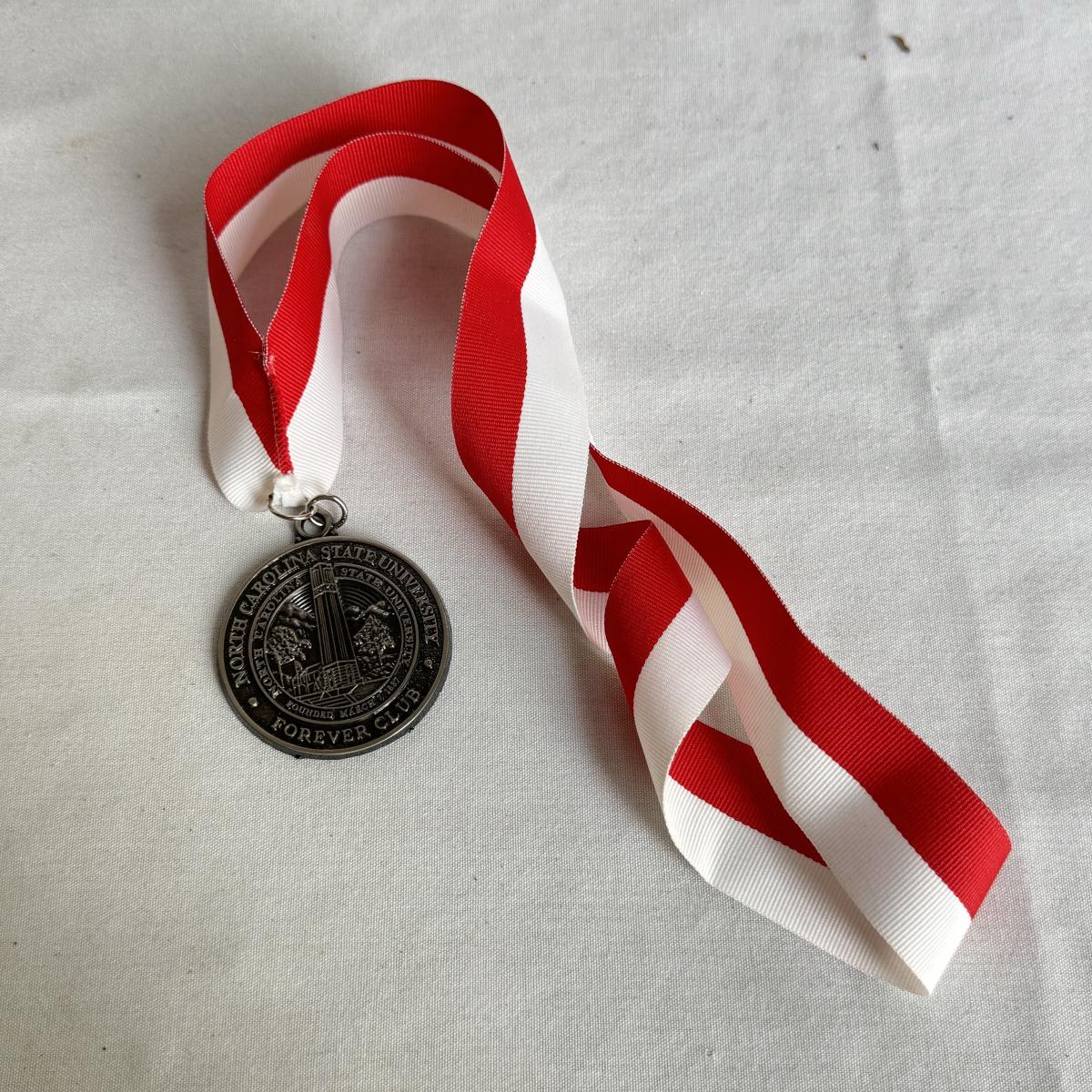 This lot includes several NC State themed items including one foldable chair, one outdoor blanket, two wooden coasters, one deck of cards, one small shoulder cooler, five books, one sweatshirt (size L) , one vest (size 1XB), one t shirt (size L), three ties, one Howl towel, one bottle opener, one pin, one medal, one scarf, two silver plates, two license plates, one decorative mirror and clock, one bird house, and much more. The shoulder cooler measures 12” x 10” x 7”H. The chair has some worn pieces - see pictures included.