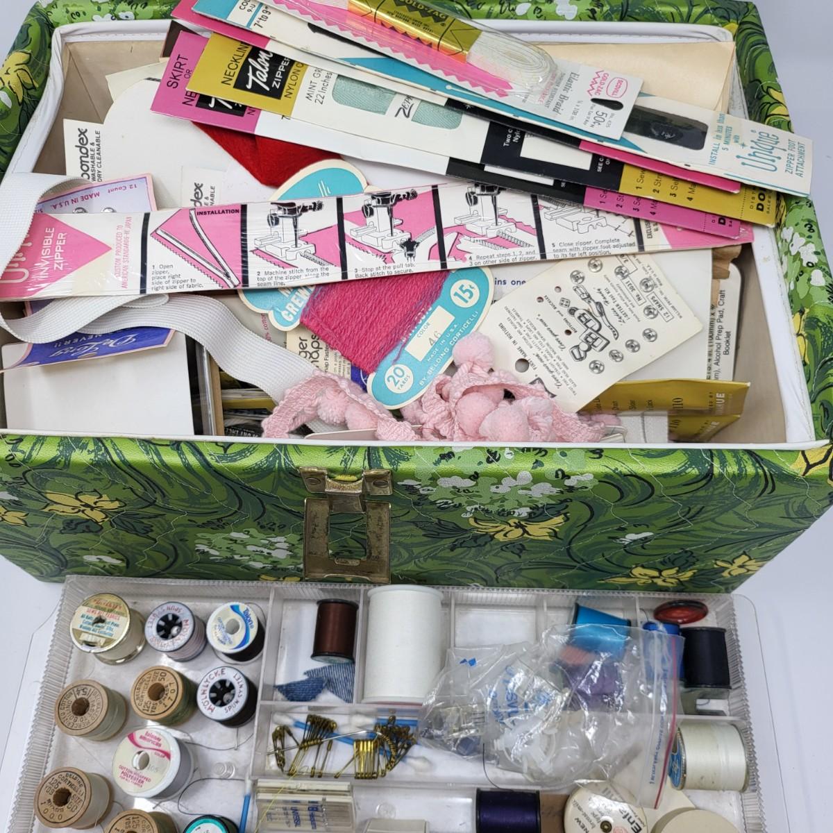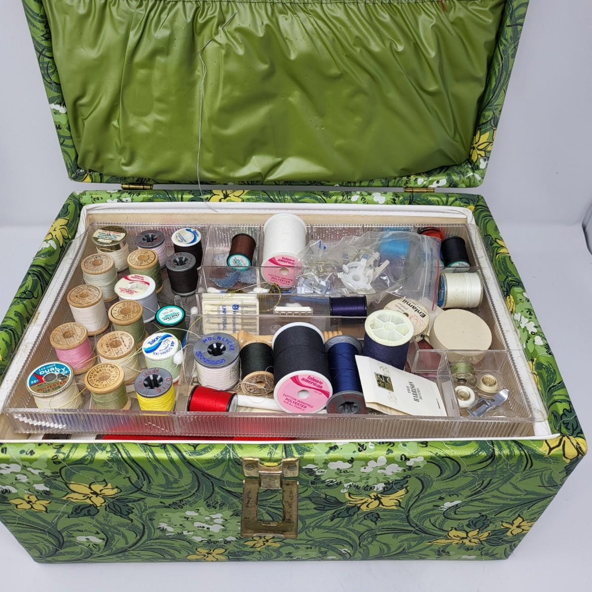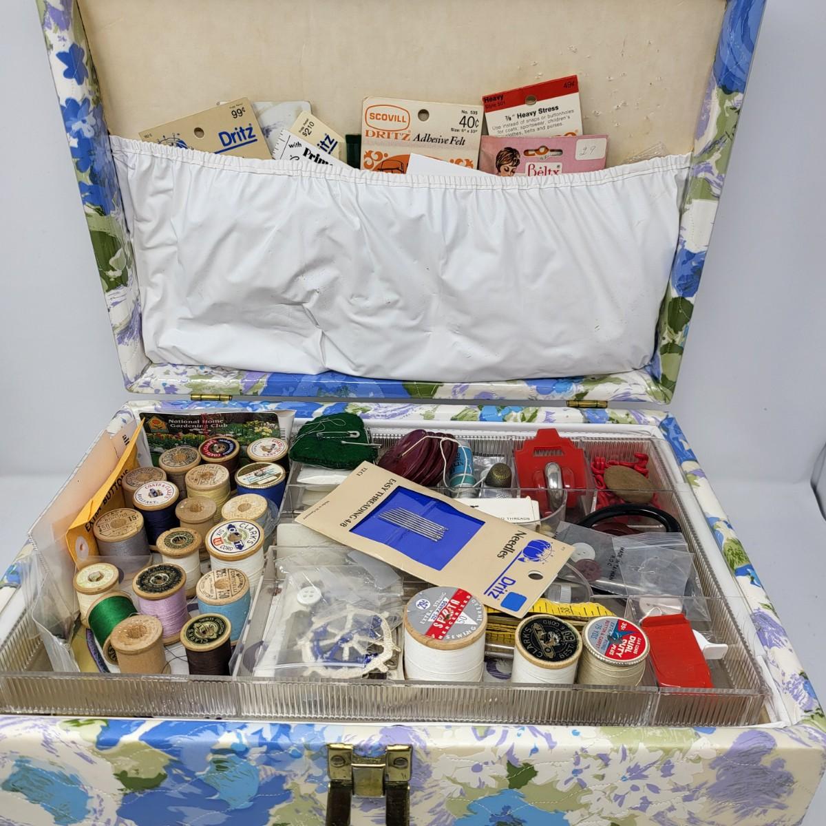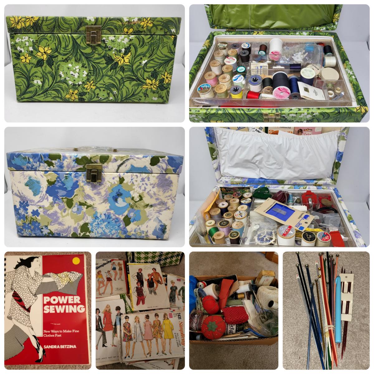 Two vintage vinyl coated sewing boxes, filled! They measure 15" long x 10.5" deep x 8" tall. Box of patterns, fabrics, pin cushions, knitti g needles, books for sewing, knitting, crochet and more!